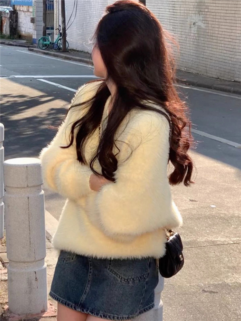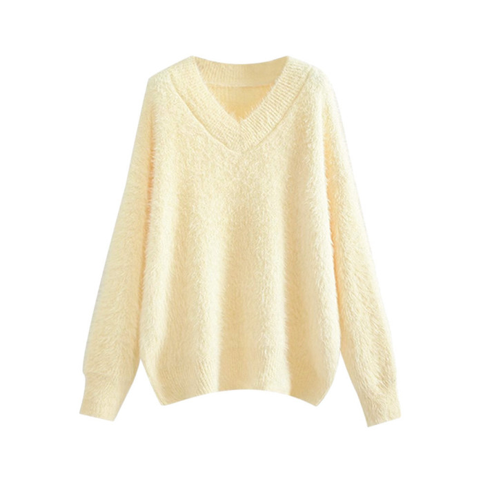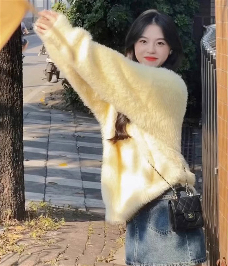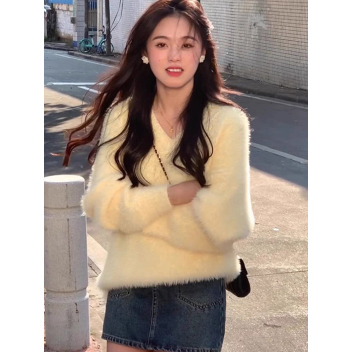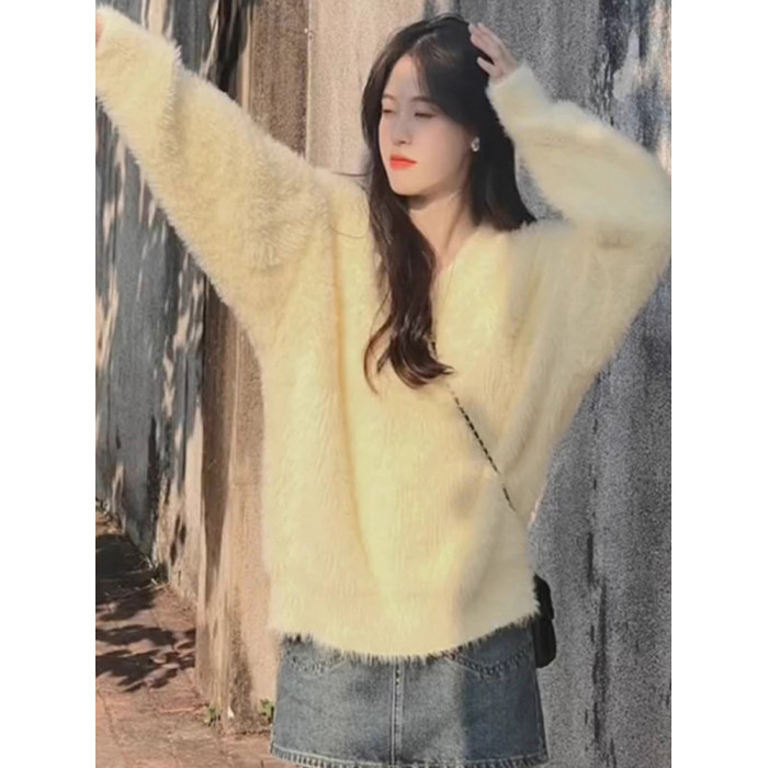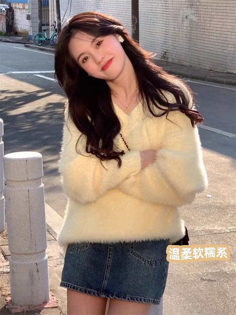 2025新款慵嬾風嬭fufu白色毛絨毛衣女秋冬季v領內搭打底上衣加厚
