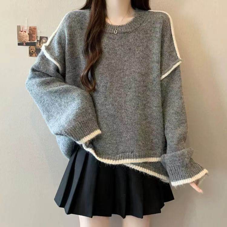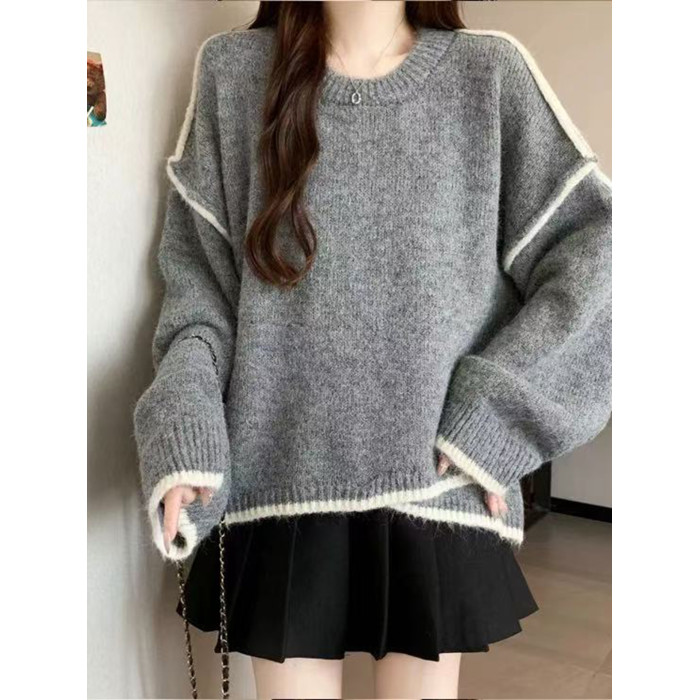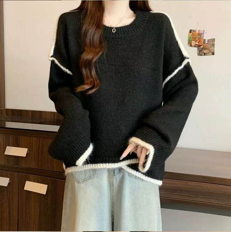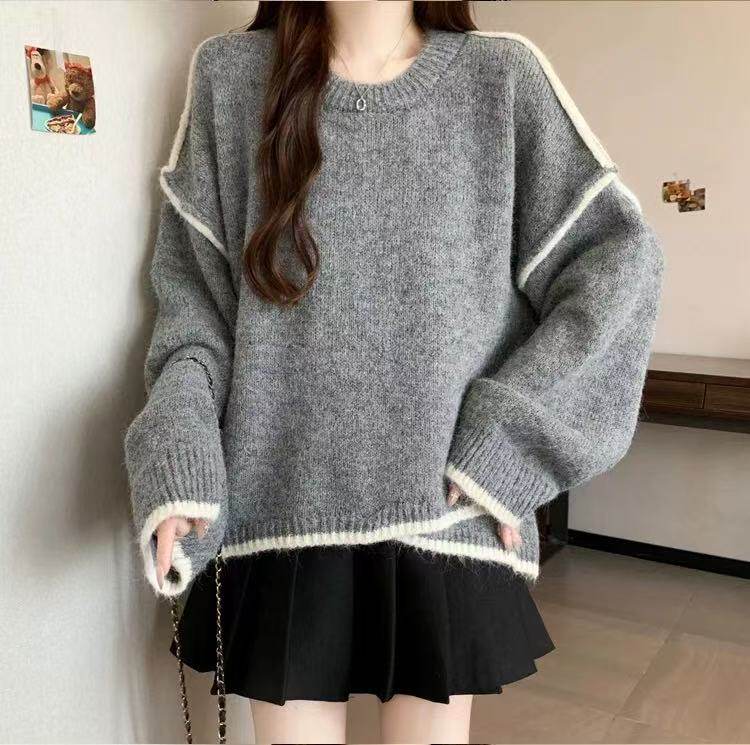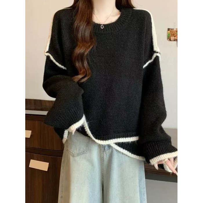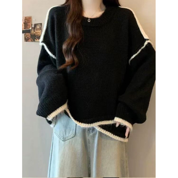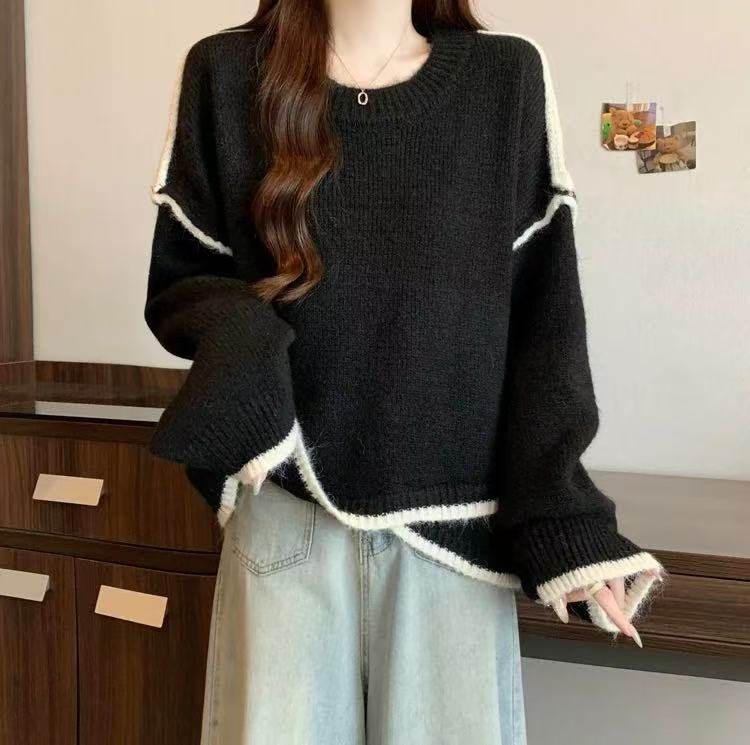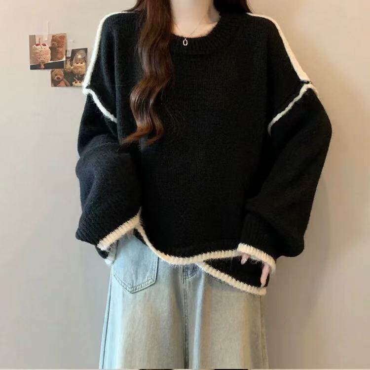 大碼撞色針織毛衣女秋冬季加厚胖mm寬鬆遮肉慵嬾風不規則長袖上衣