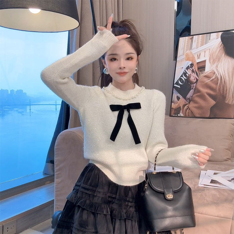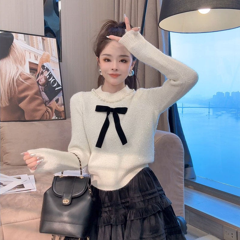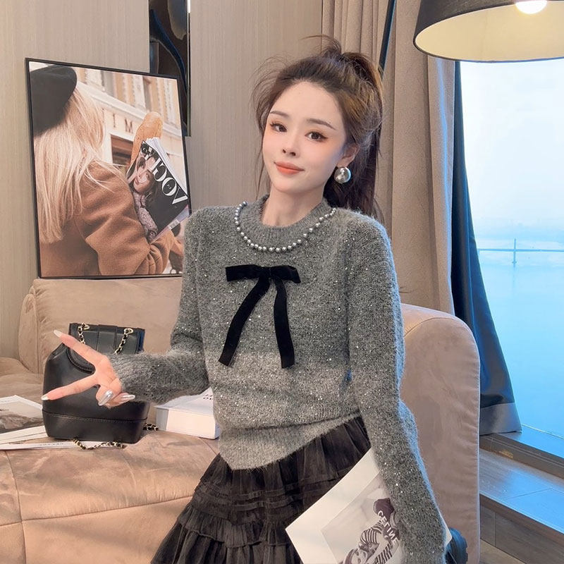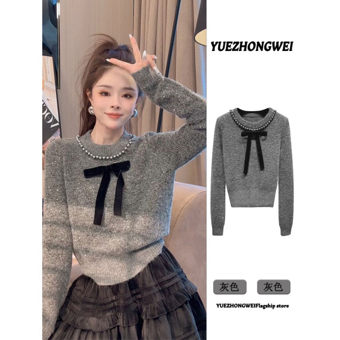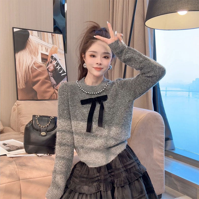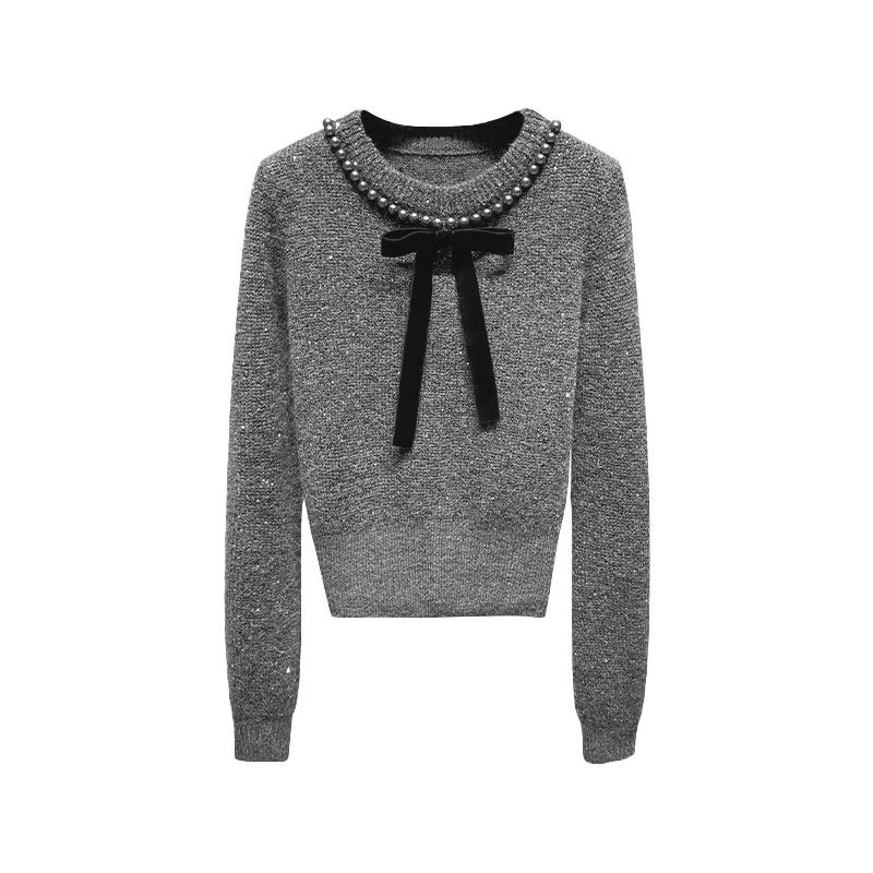 小香風灰色圓領套頭蝴蝶結毛衣女秋冬季加厚慵嬾風短款針織衫上衣