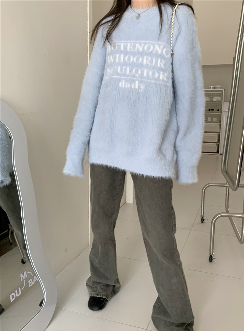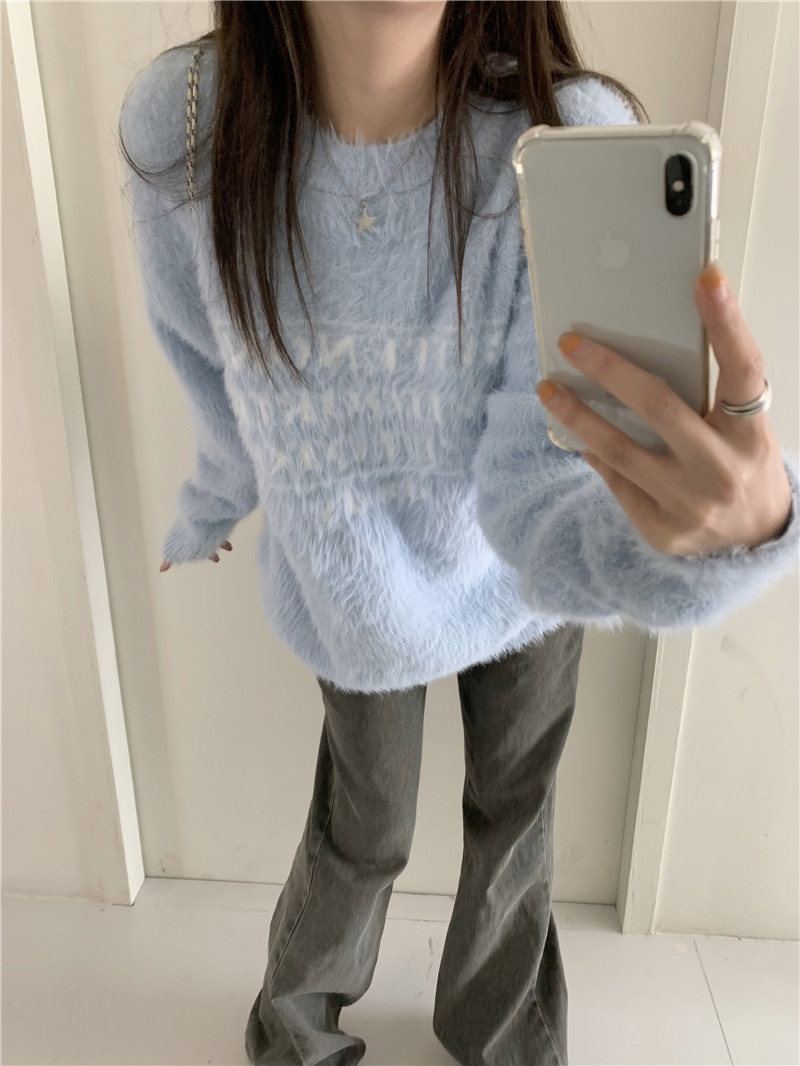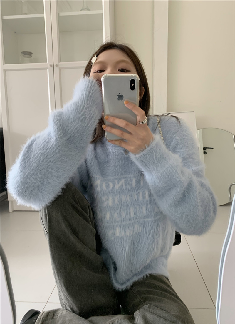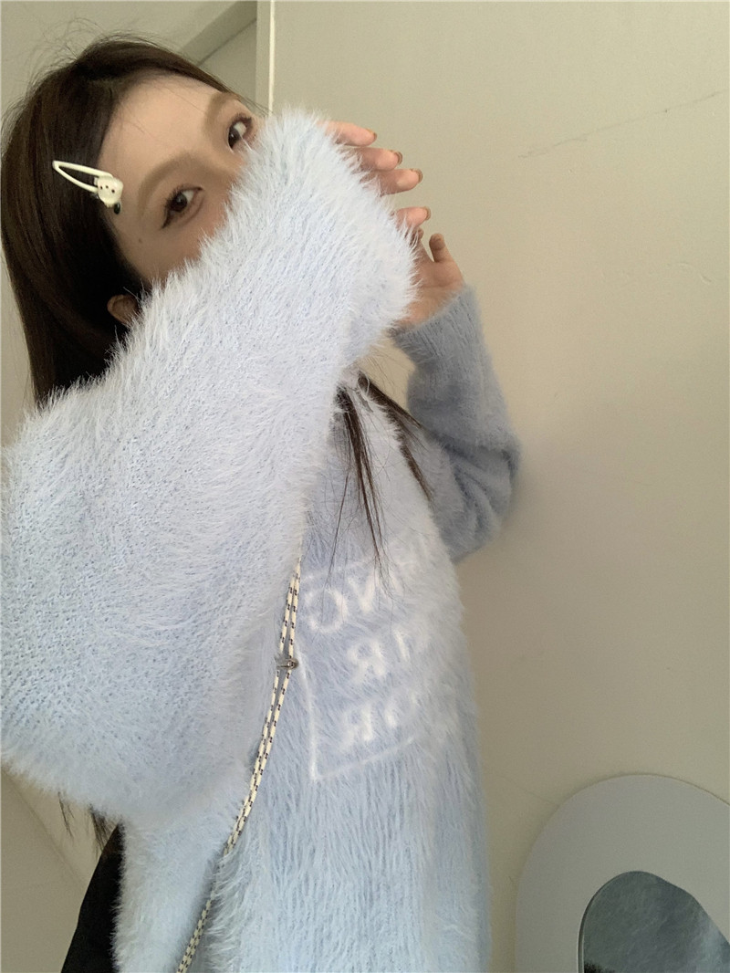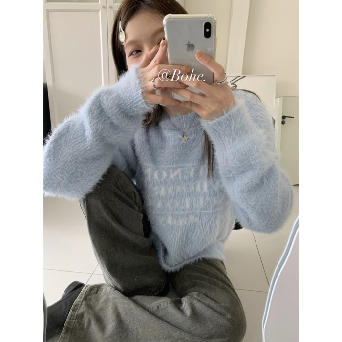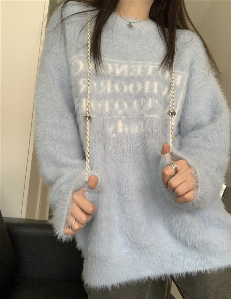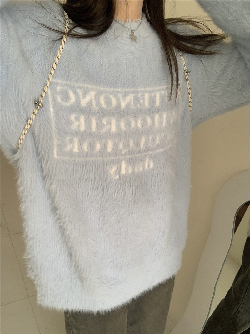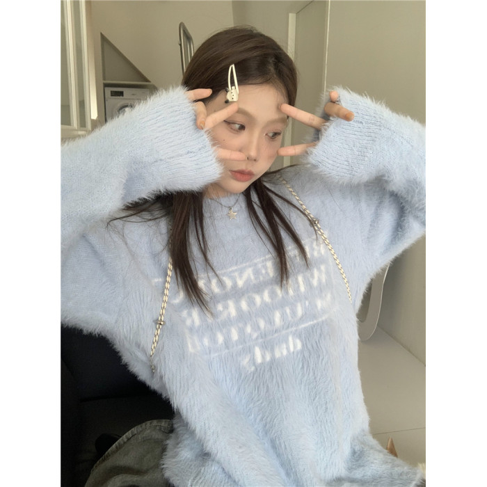 嬭fufu藍色水貂絨毛衣女秋冬季軟糯寬鬆慵嬾風字母提花針織衫上衣