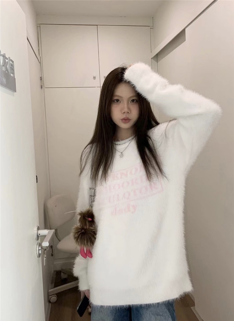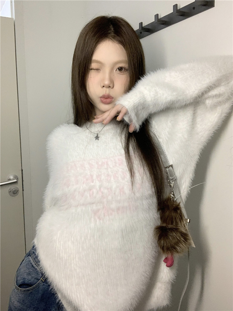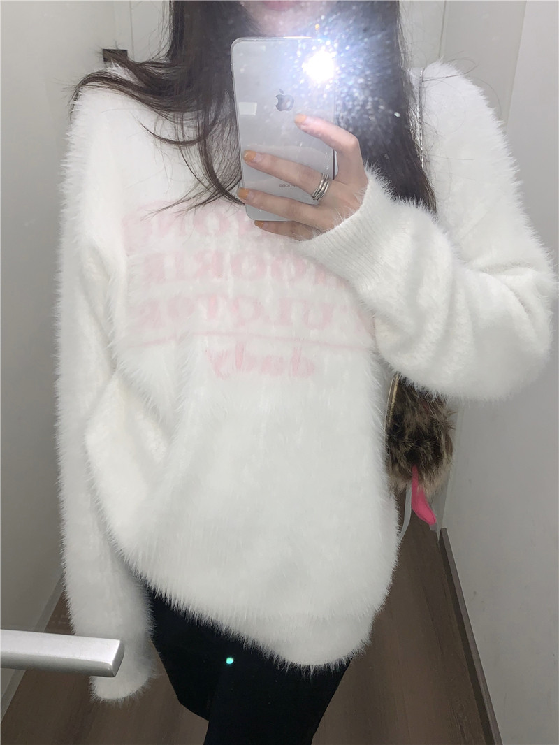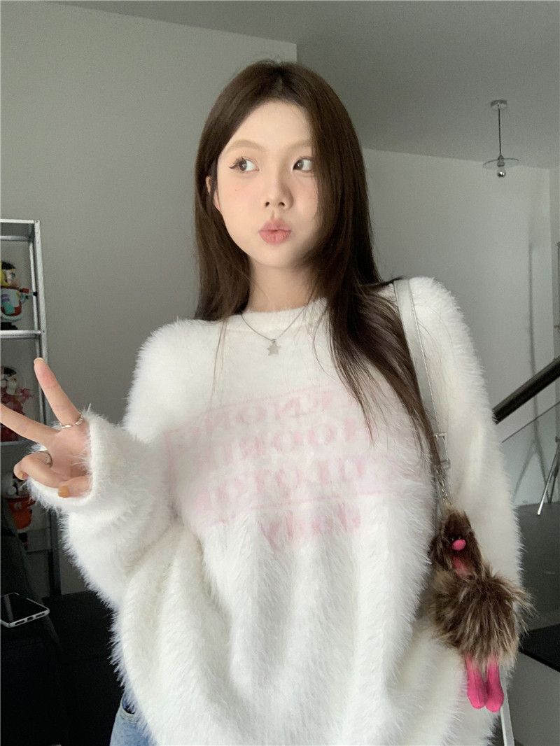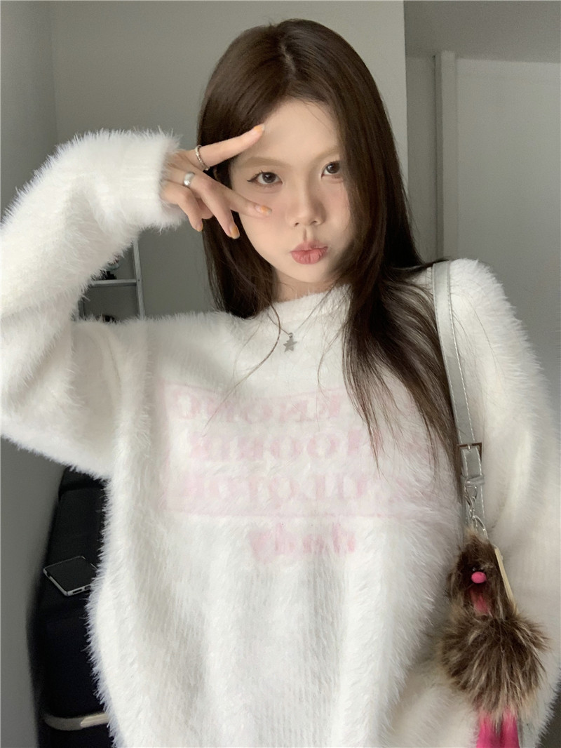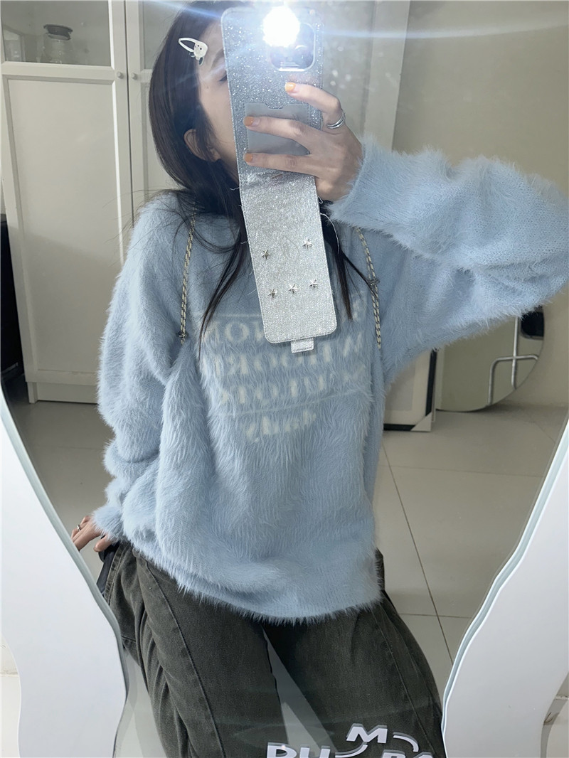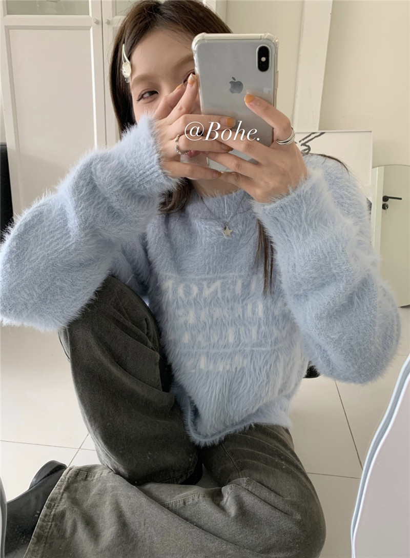 嬭fufu藍色水貂絨毛衣女秋冬季軟糯寬鬆慵嬾風字母提花針織衫上衣