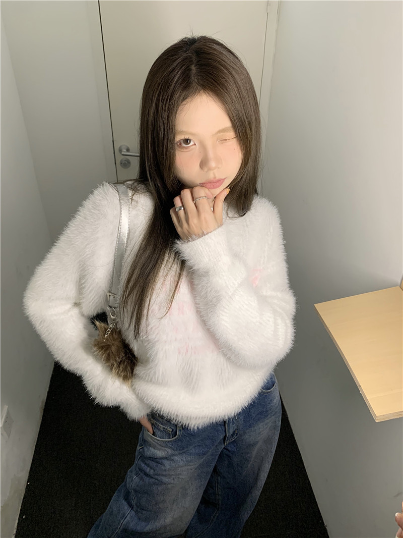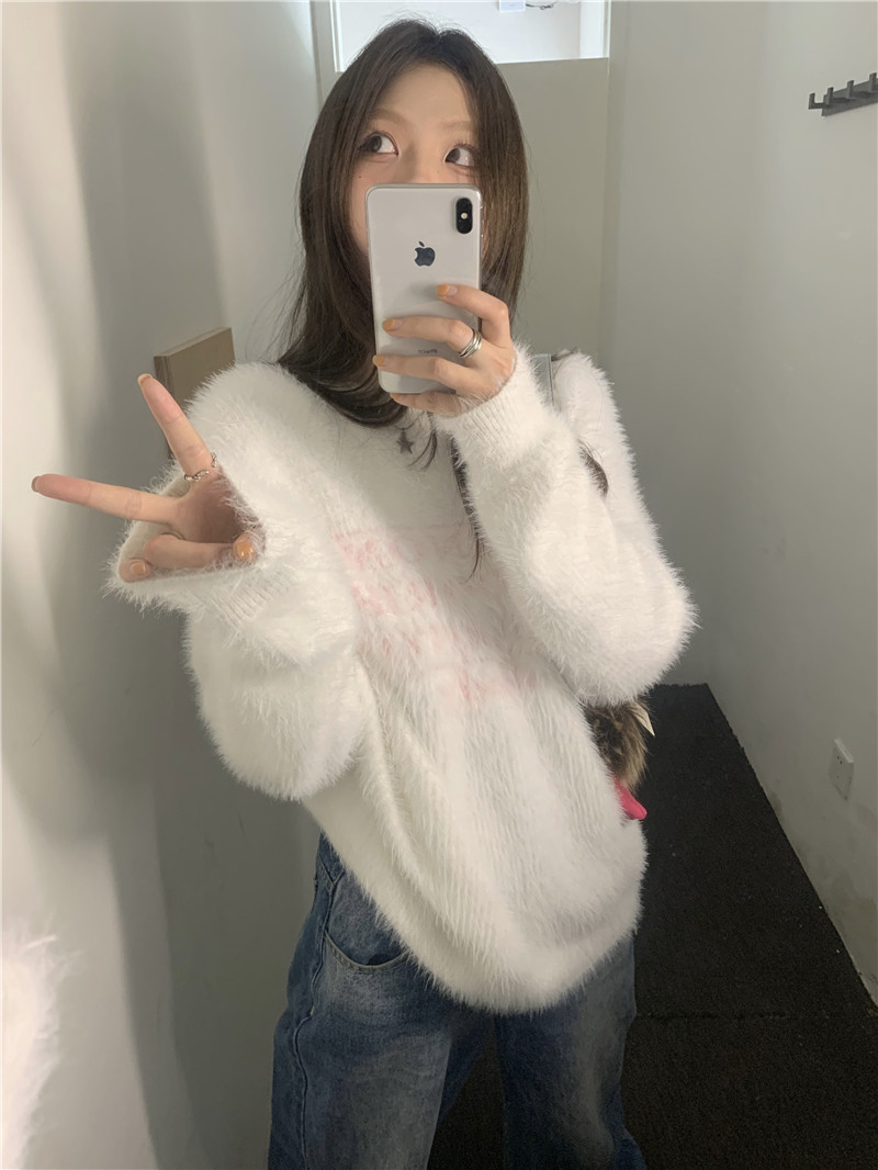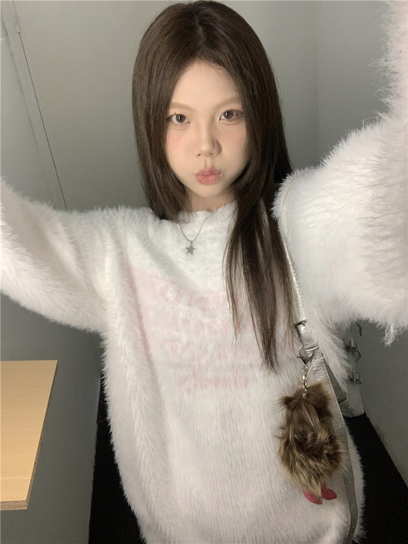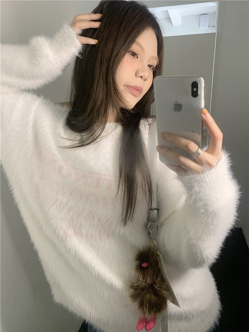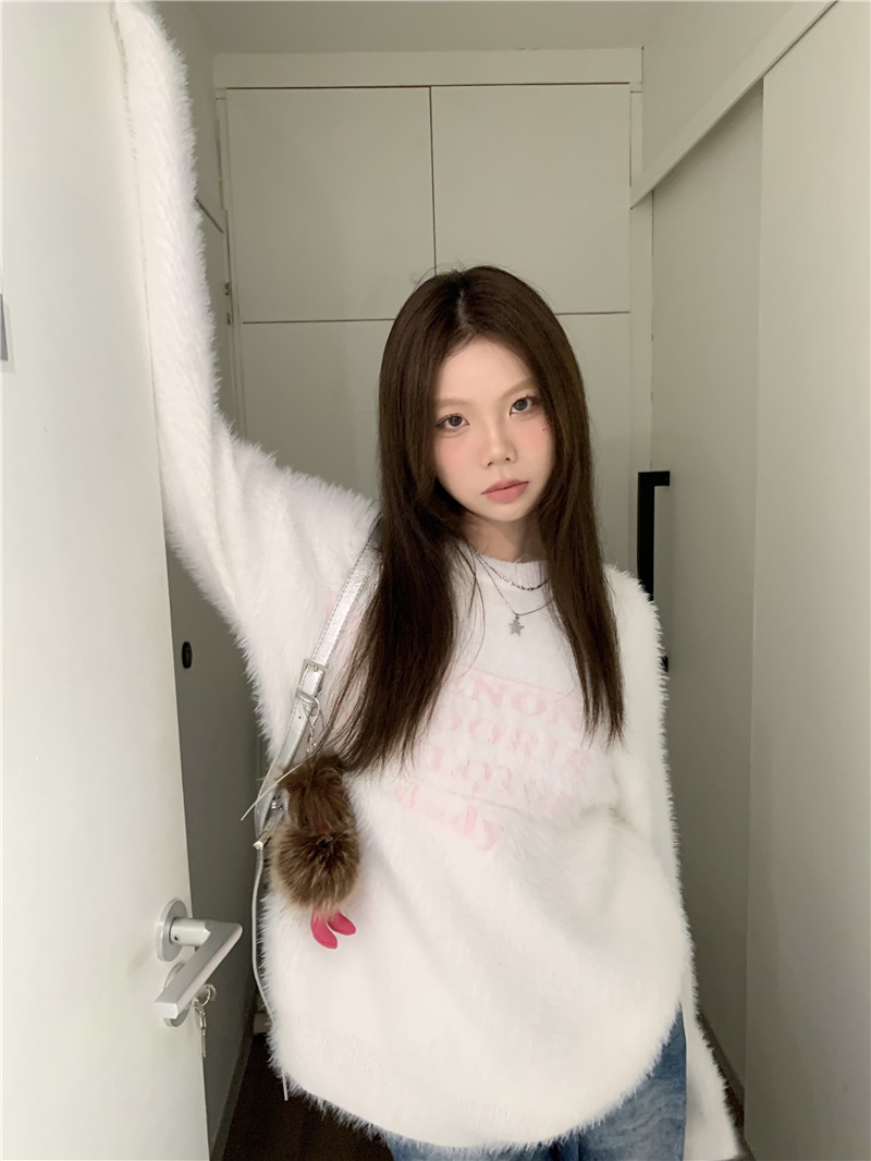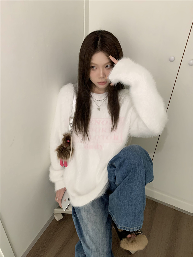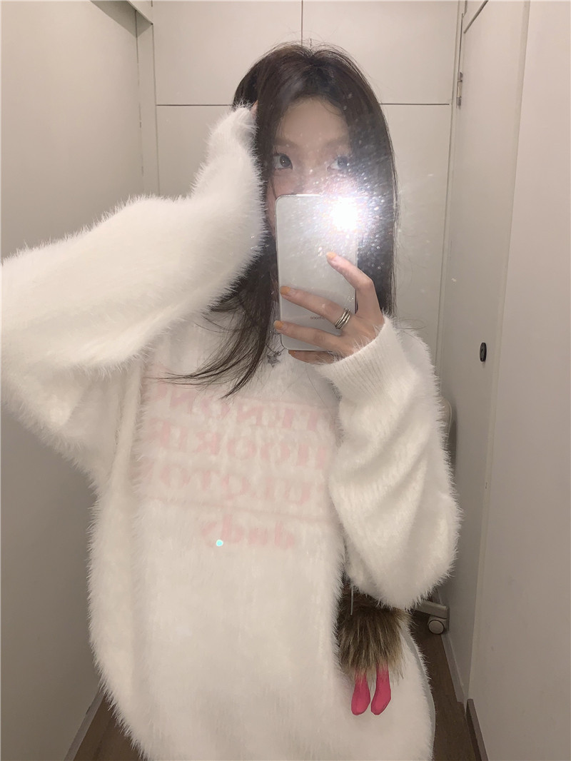 嬭fufu藍色水貂絨毛衣女秋冬季軟糯寬鬆慵嬾風字母提花針織衫上衣
