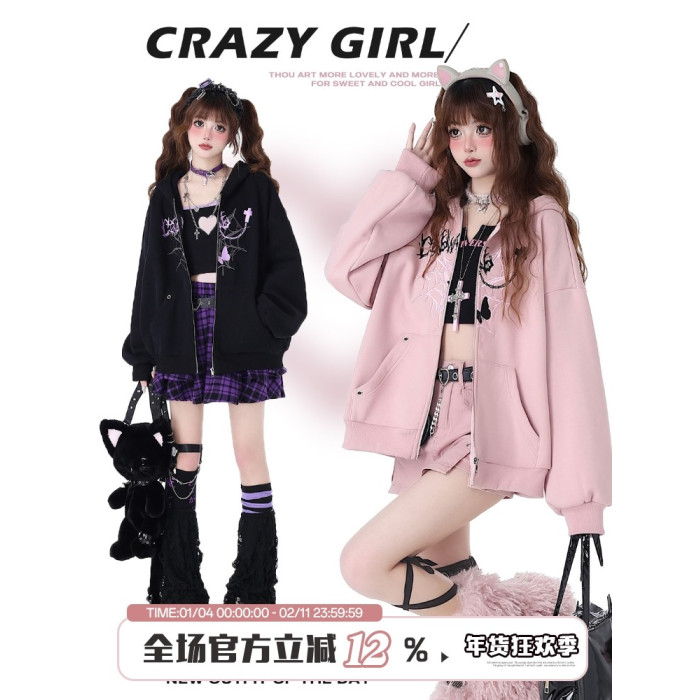 crazygirl【破碎蝴蝶】原創甜亞龐克小衆寬鬆百搭帽衫外套早春