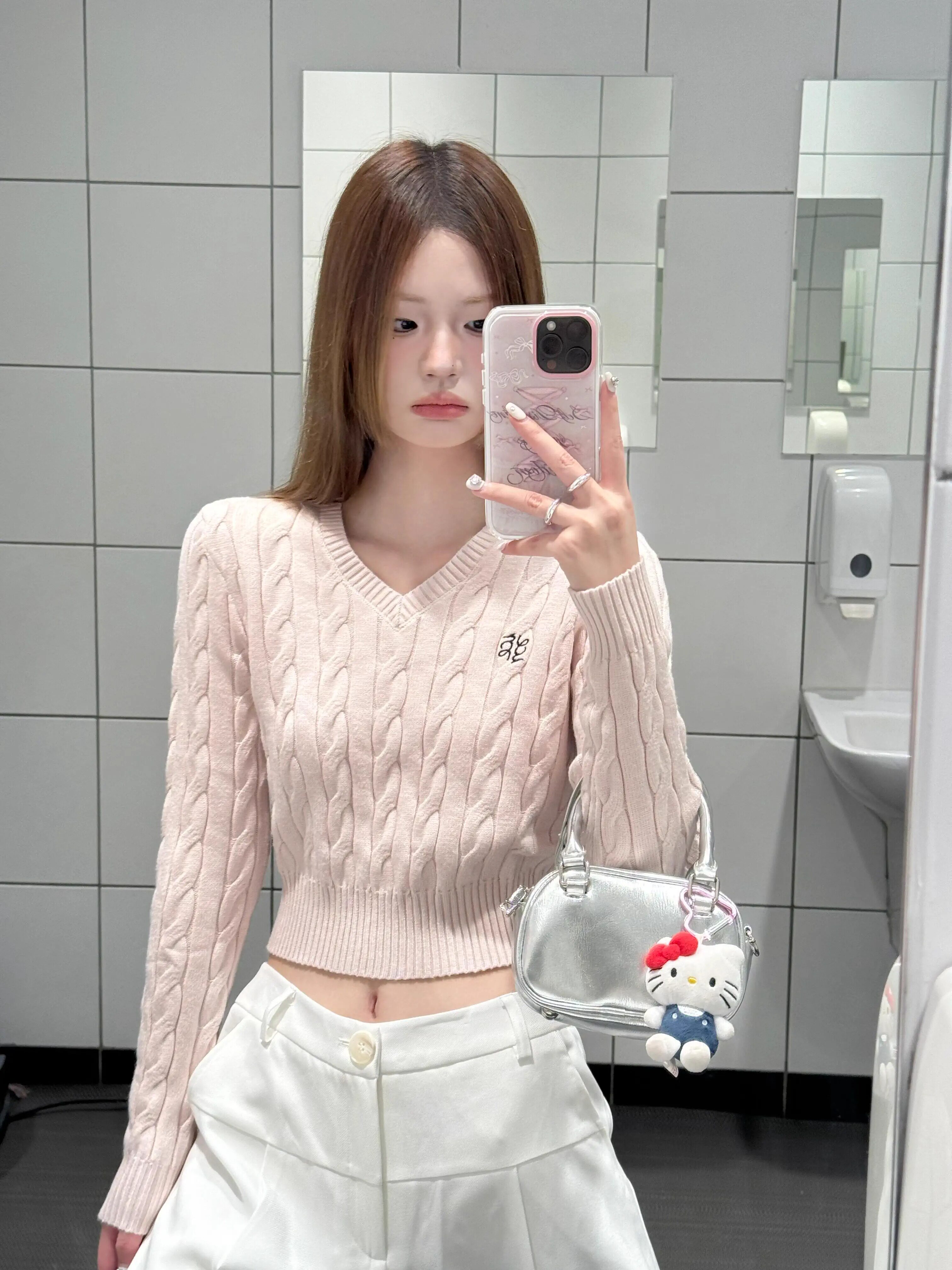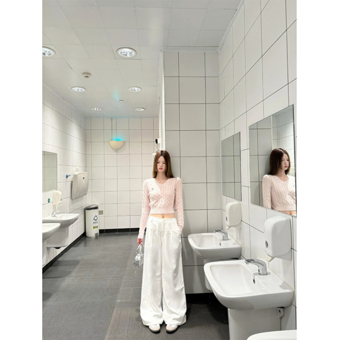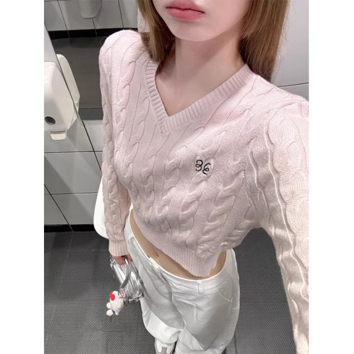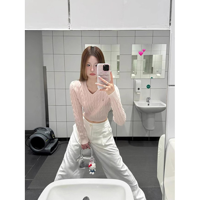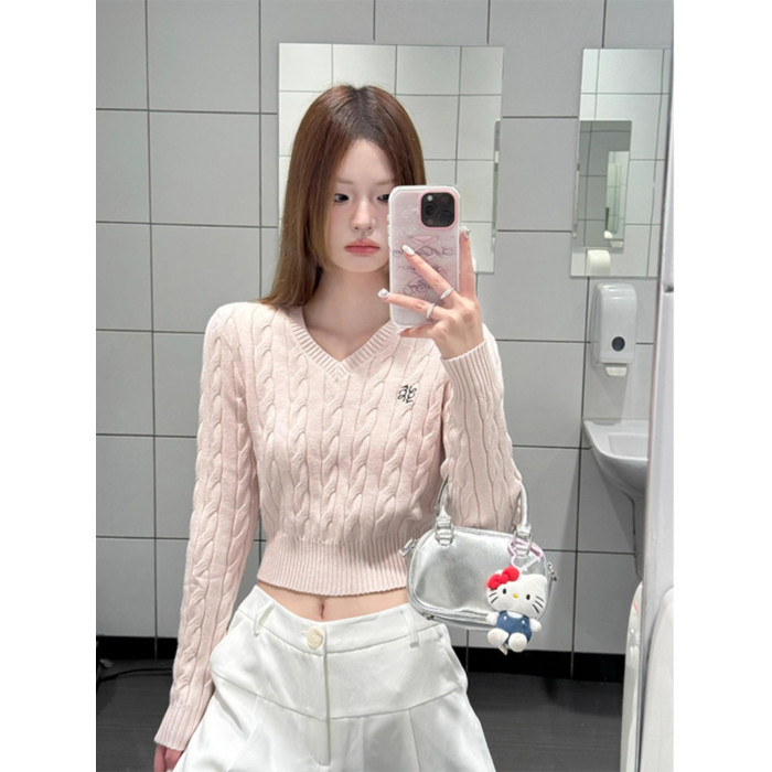粉色V領短款毛衣針織衫女春秋2026新款內搭打底衫甜辣妹收腰上衣