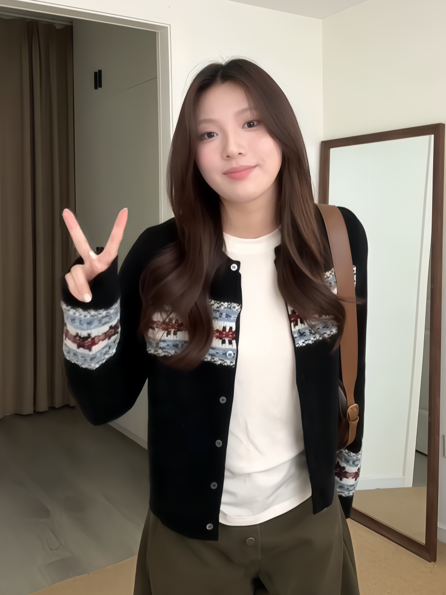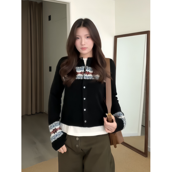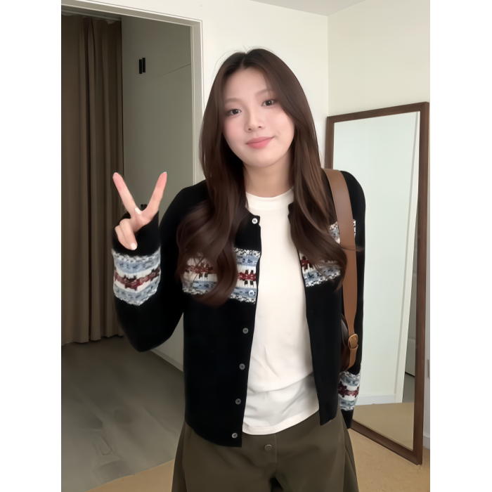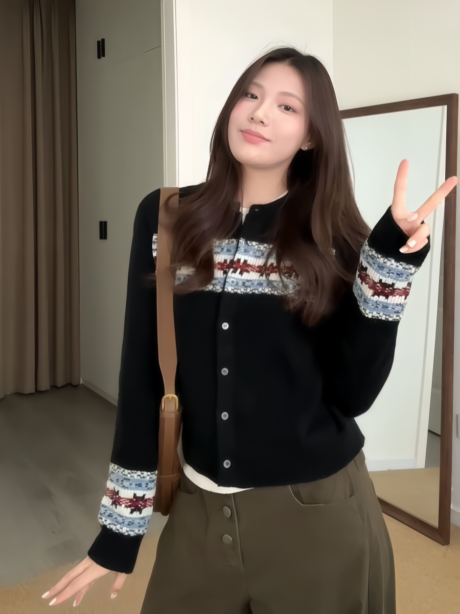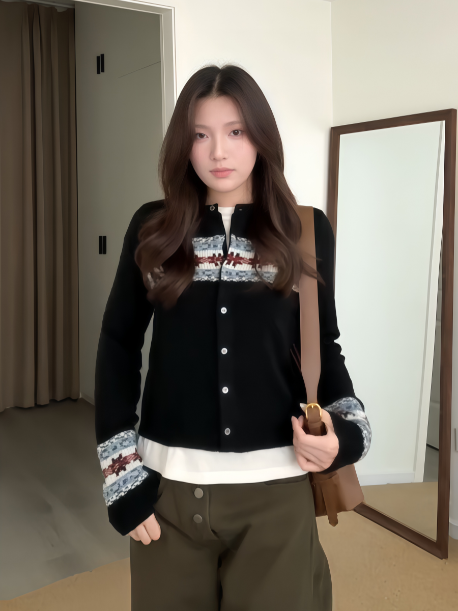 大碼胖MM韓系復古浪漫費爾島針織開衫女秋季撞色提花長袖毛衣外套