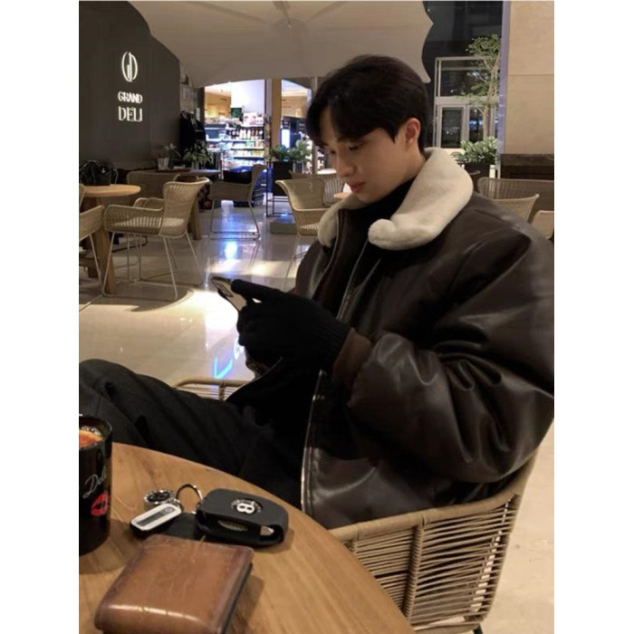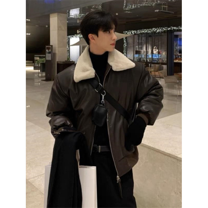 高級感PU皮羽絨服男士冬季加厚潮牌痞帥短款羊羔毛絨棉衣棉服外套