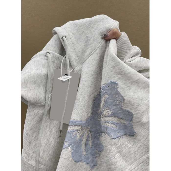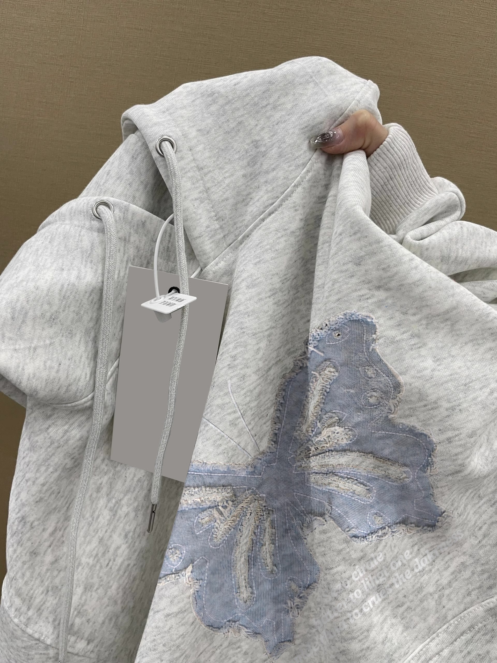 美式復古蝴蝶印花連帽衛衣女春秋冬加絨加厚外套寬松bf慵懶風上衣