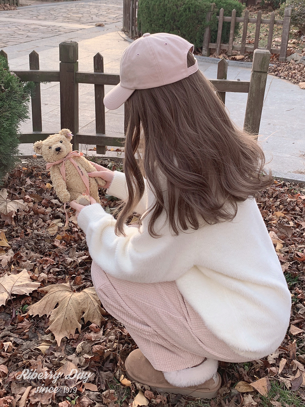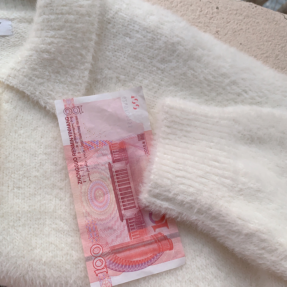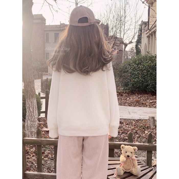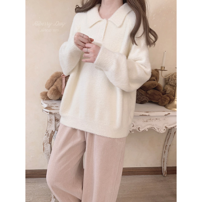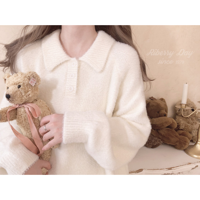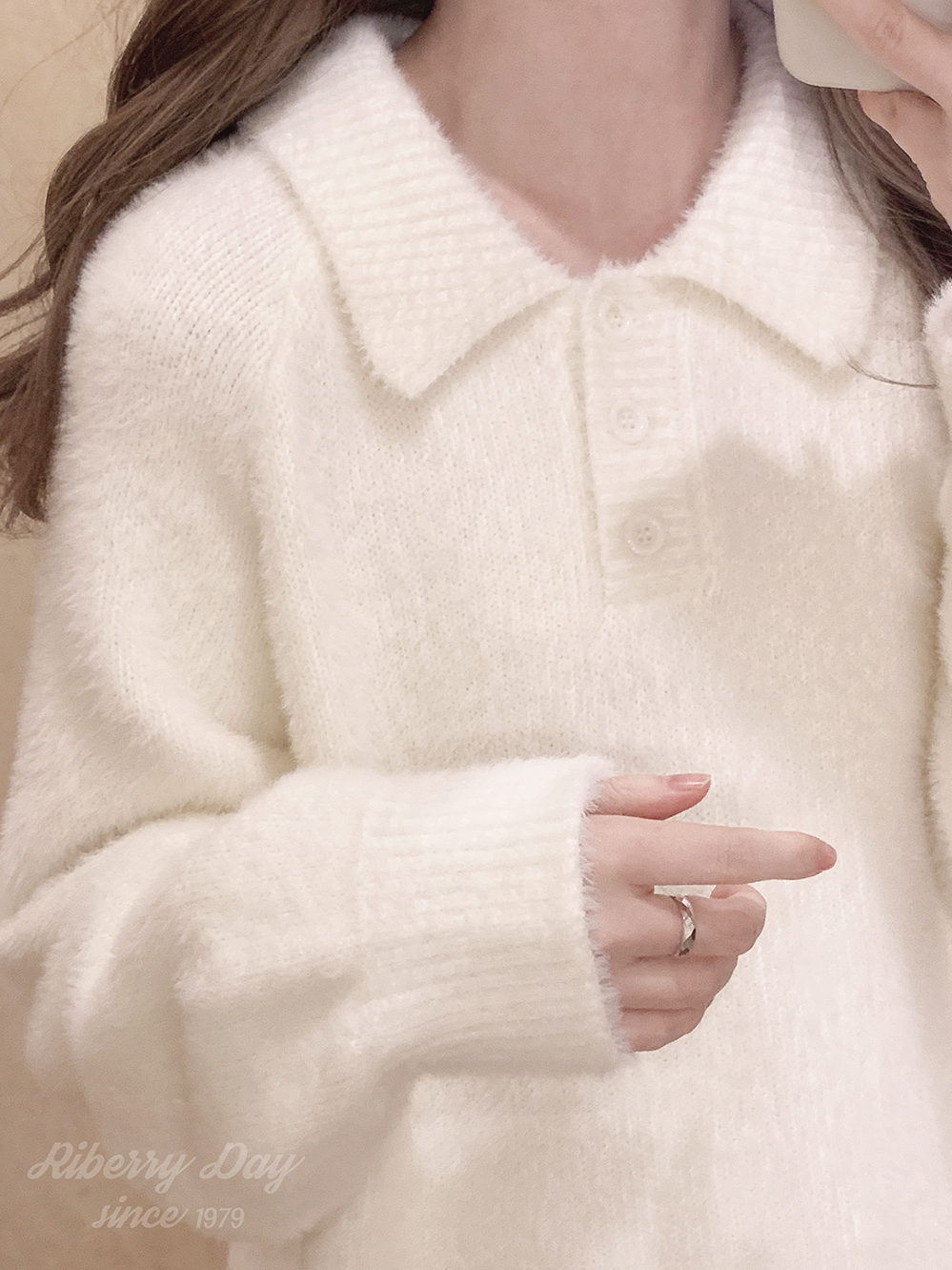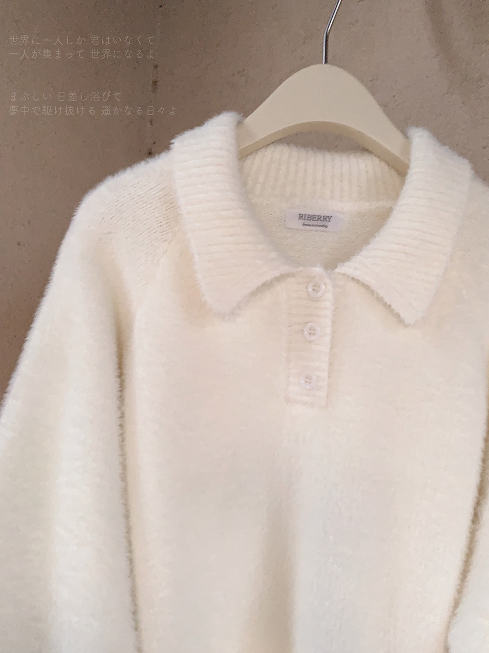 仿貂絨 溫柔奶白色 POLO領 日雜風 插肩袖 毛茸茸 日系寬松毛衣 K
