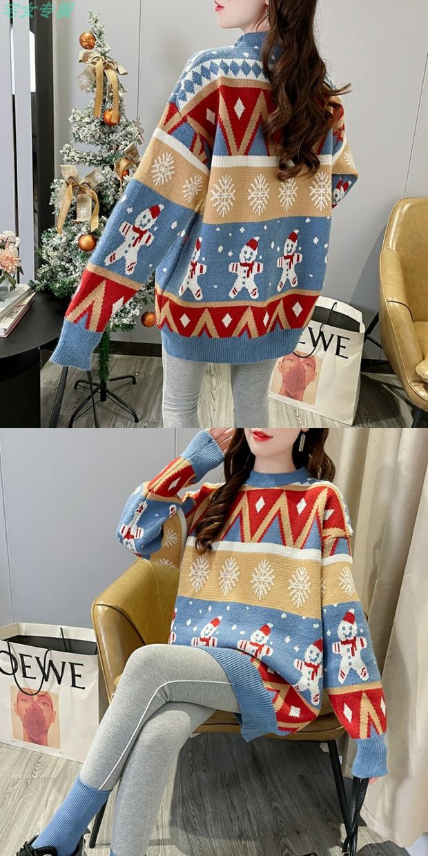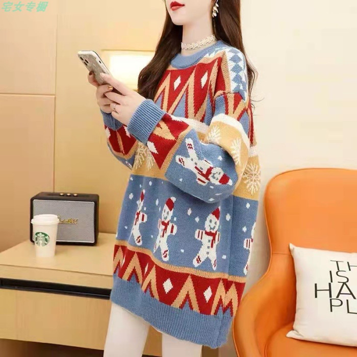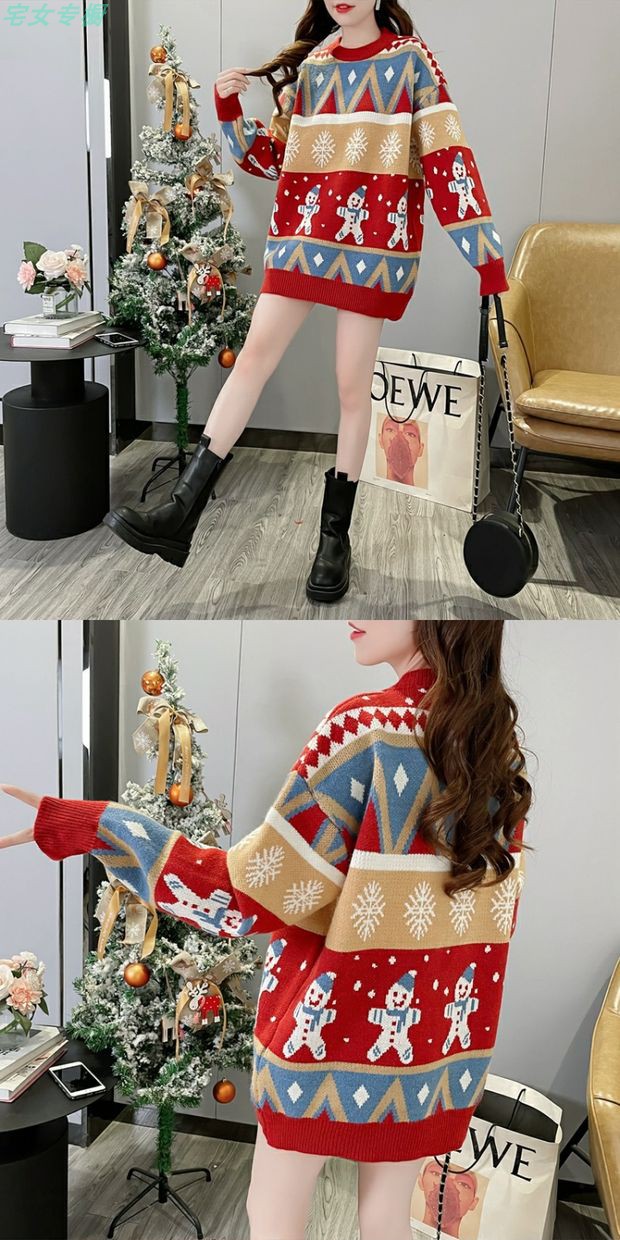 聖誕紅色毛衣女2021年新款慵懶風冬季圓領針織衫動漫套頭加厚上衣