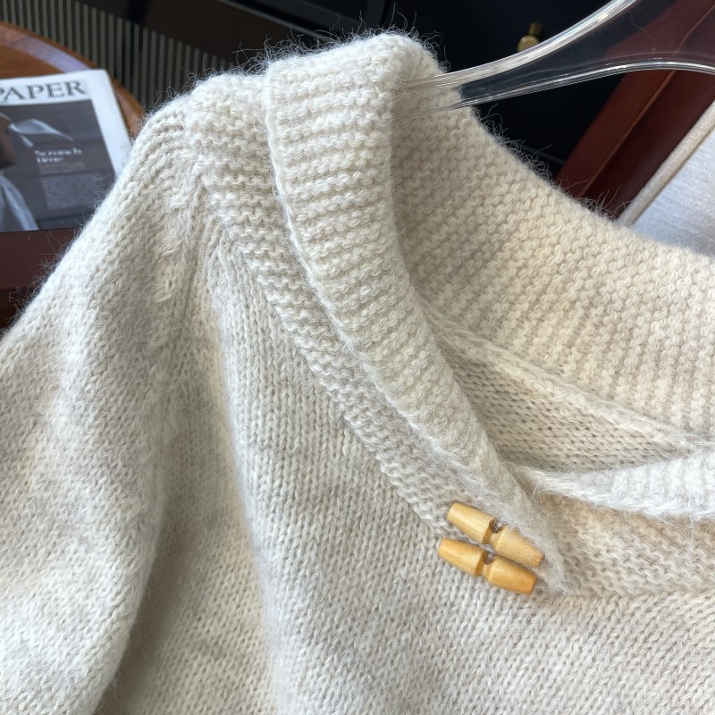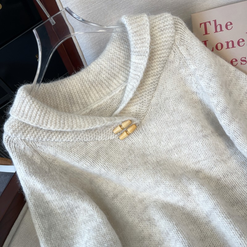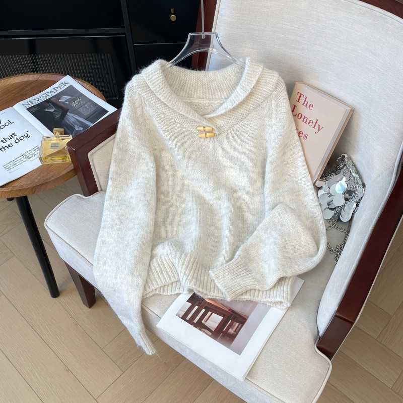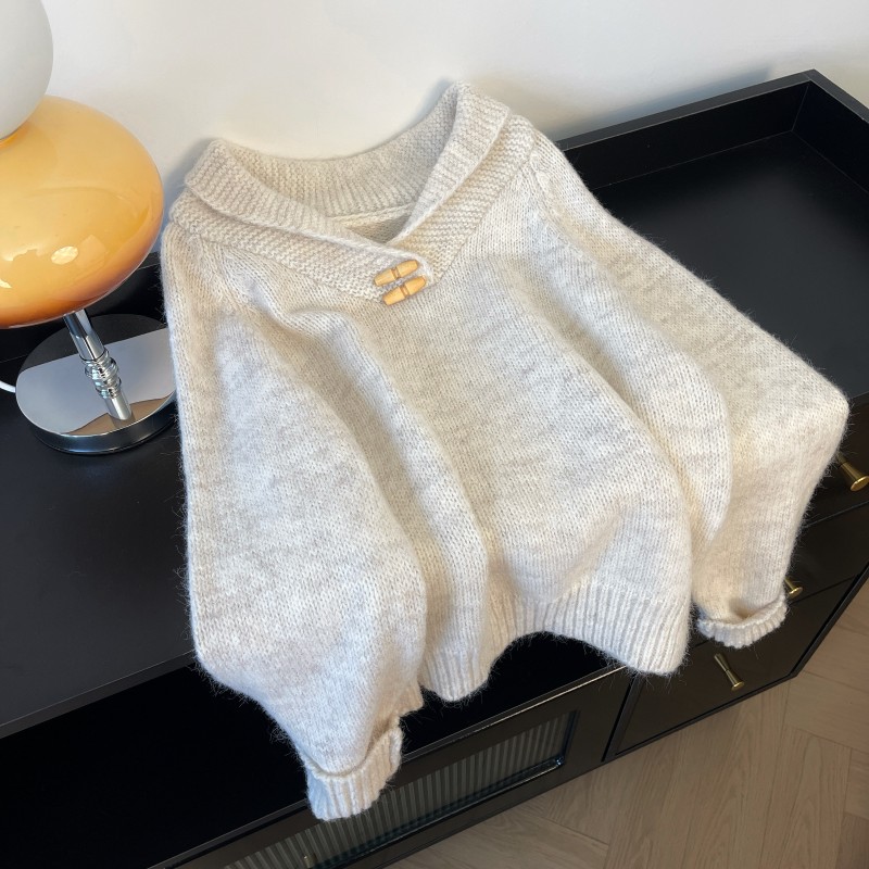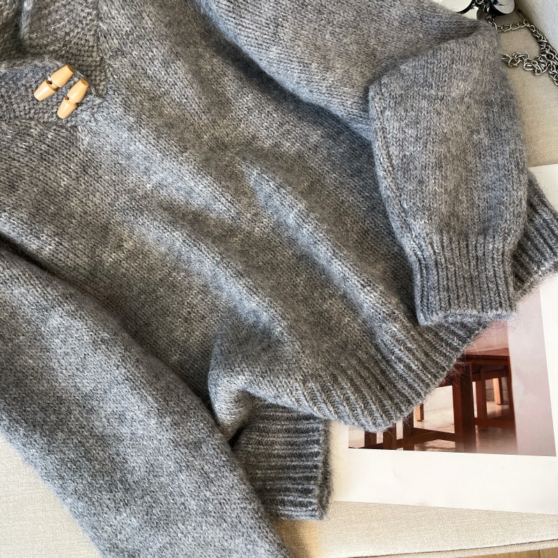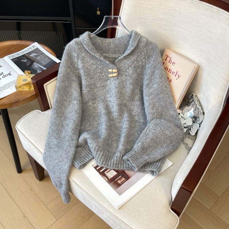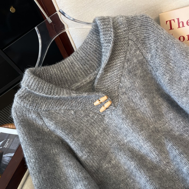 慵懶風牛角釦灰色翻領毛衣女早秋裝大碼胖mm插肩袖正肩顯瘦針織衫