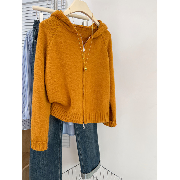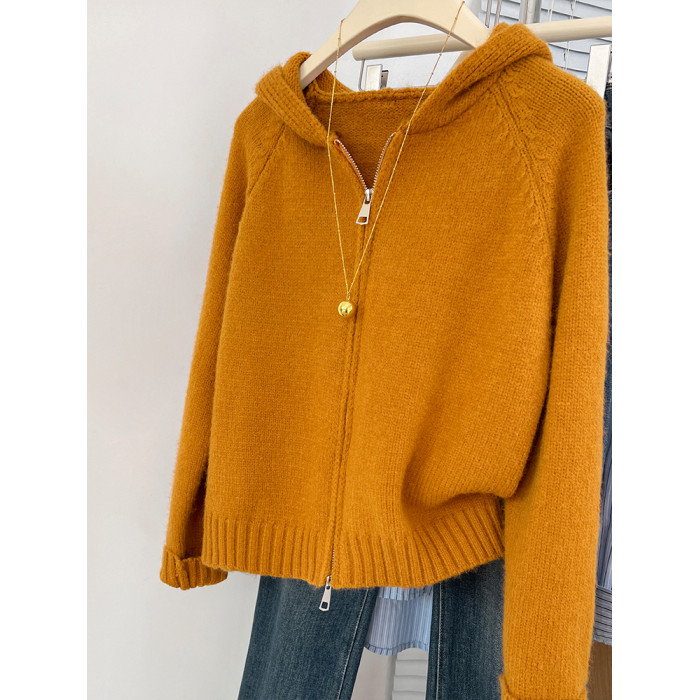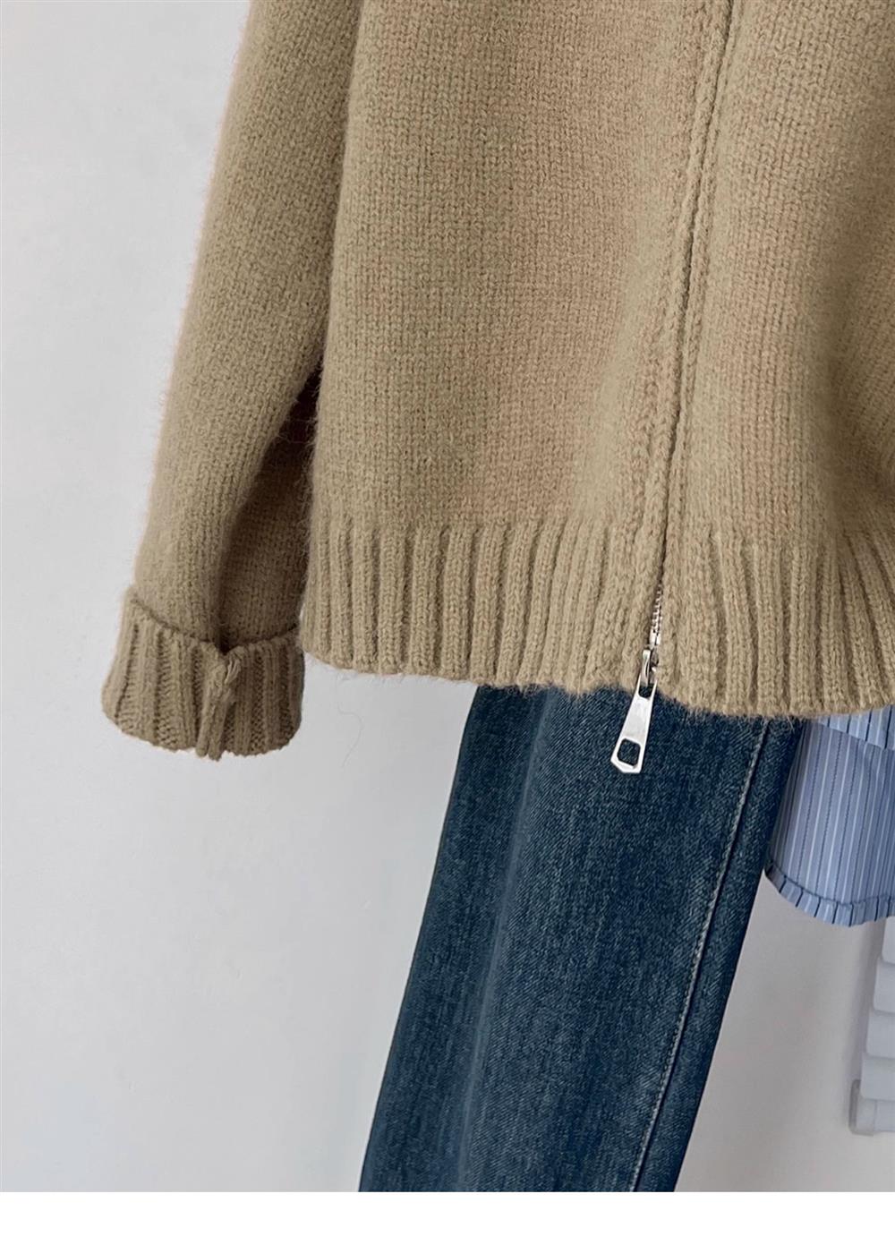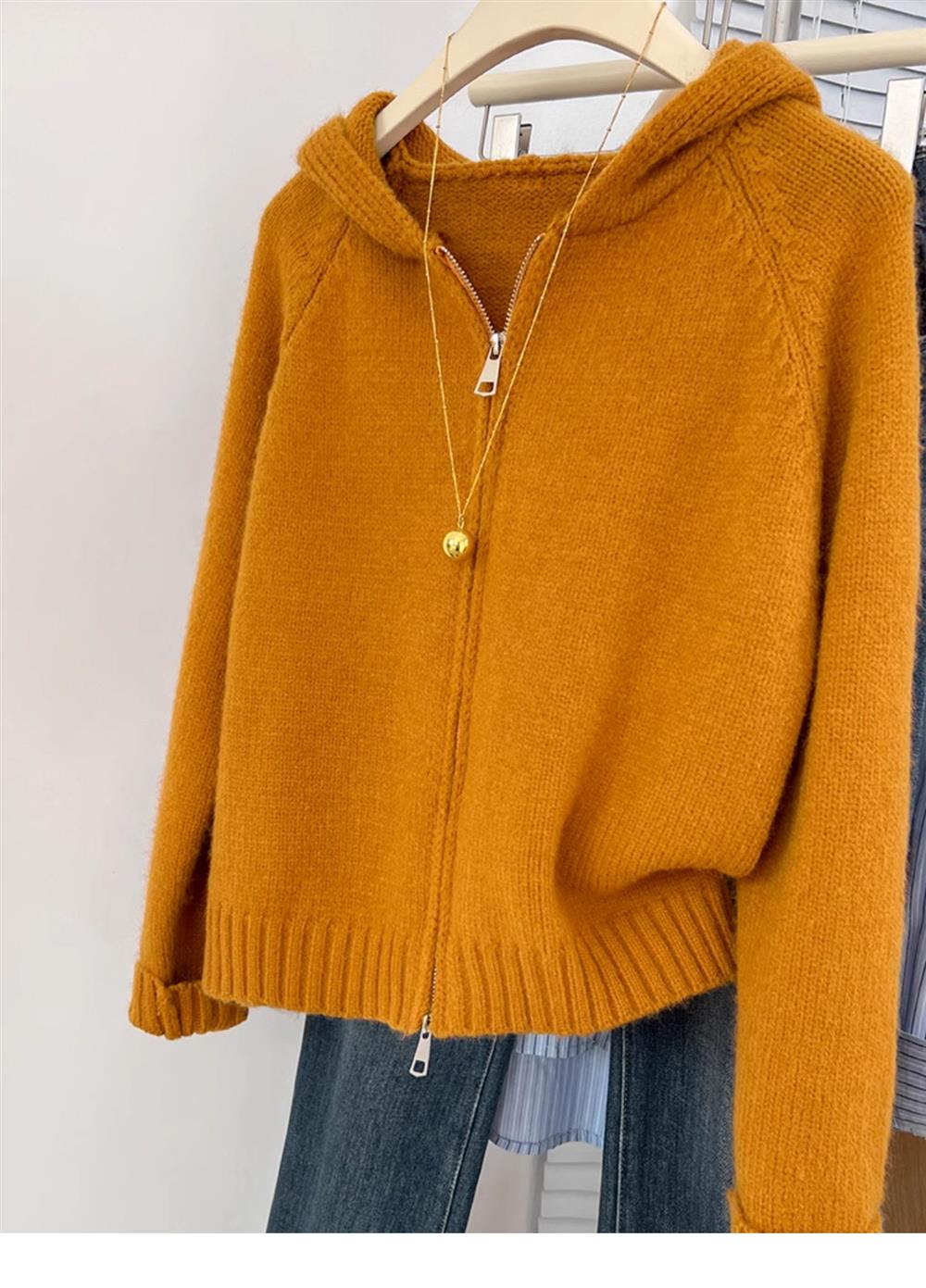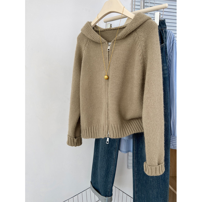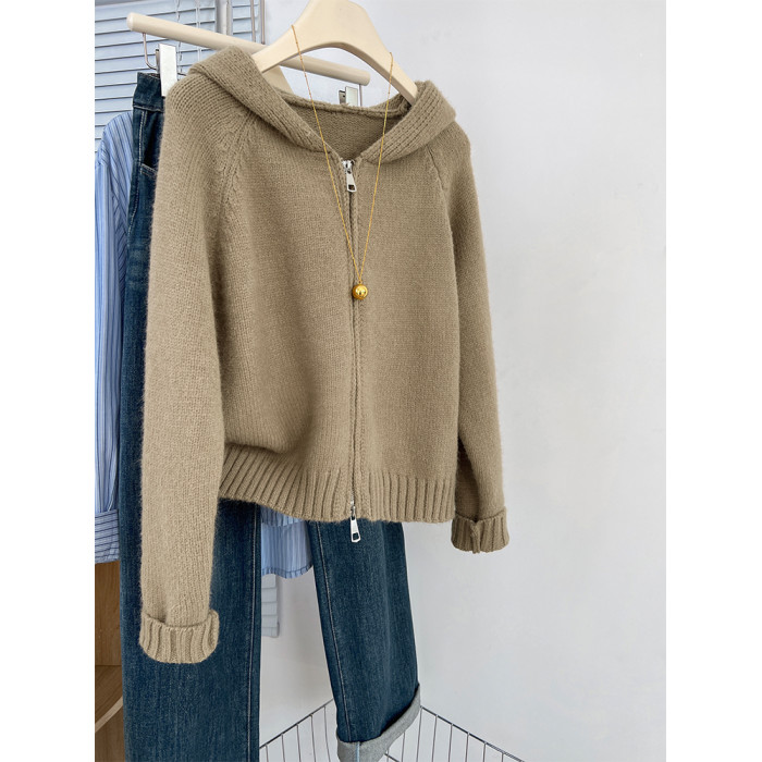 設計感拉鍊連帽開衫毛衣外套女秋冬慵懶風寬松外穿針織衫連帽上衣
