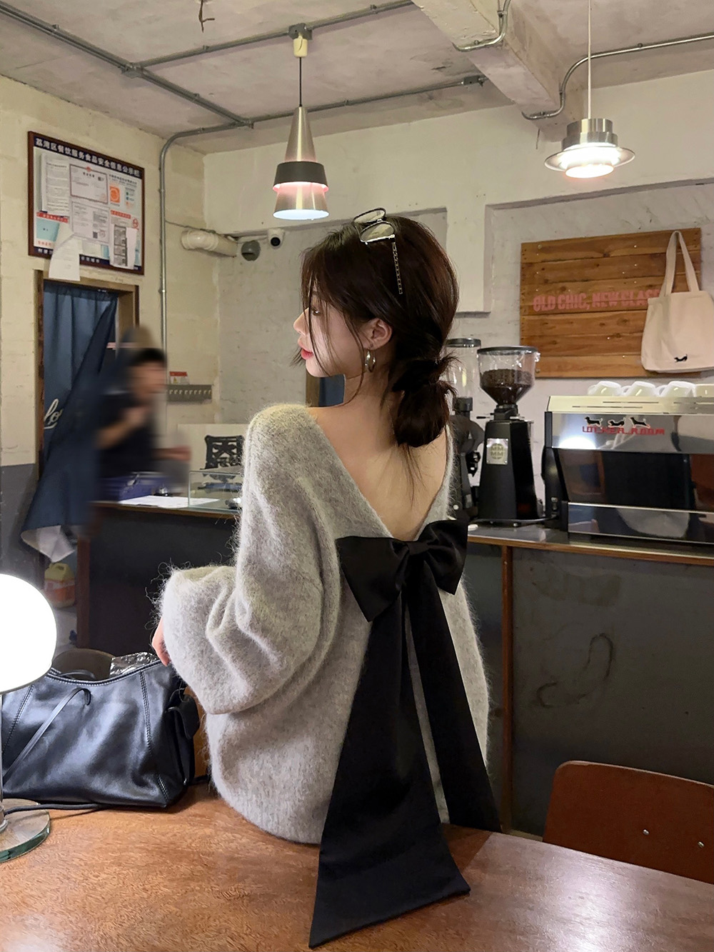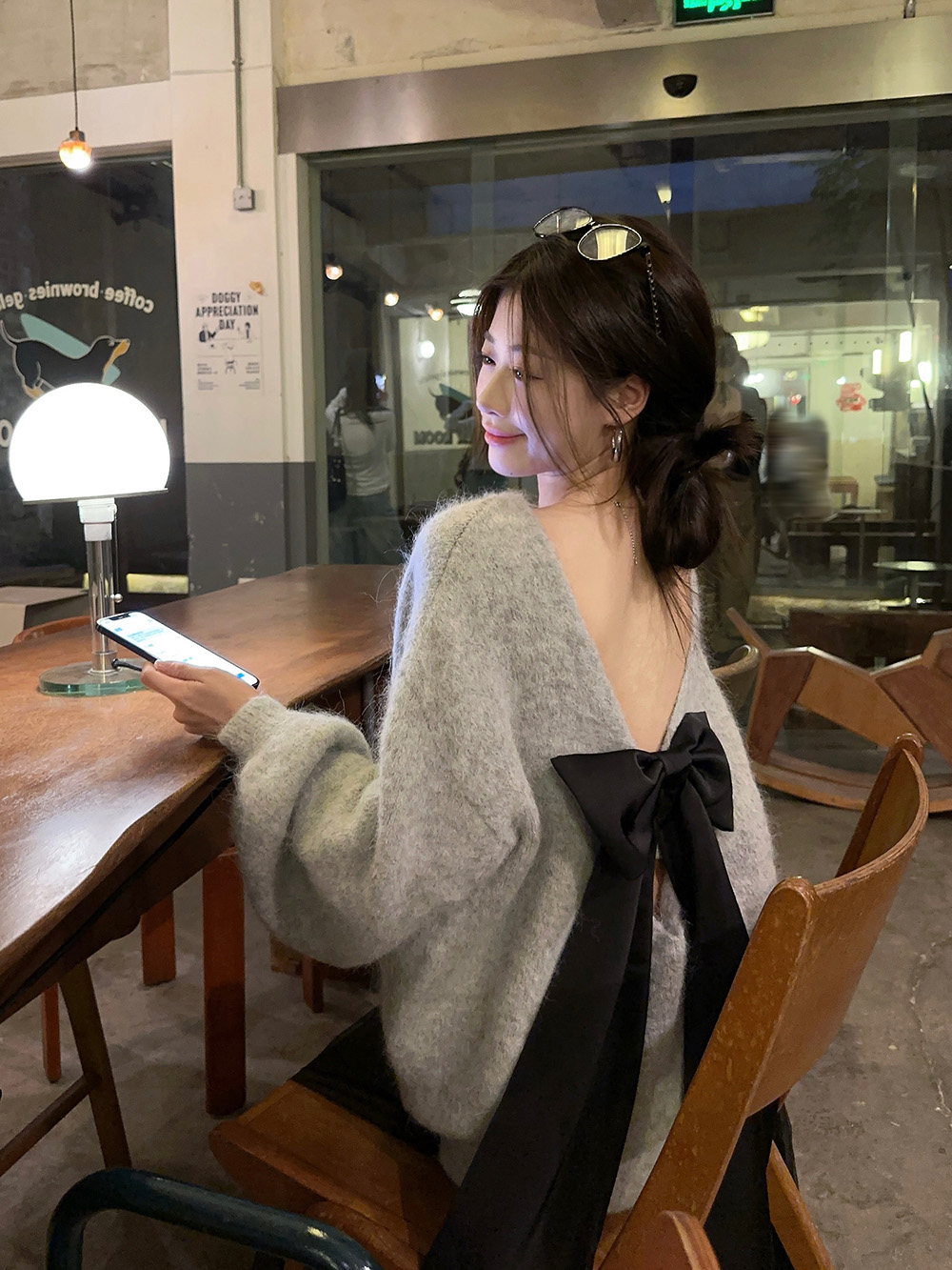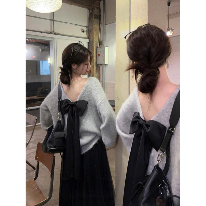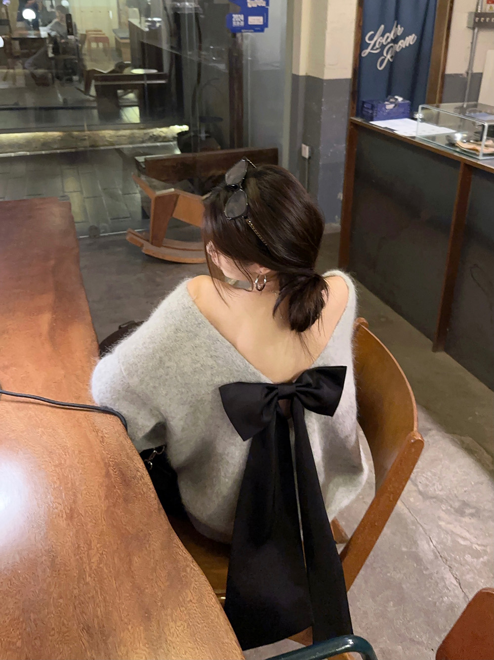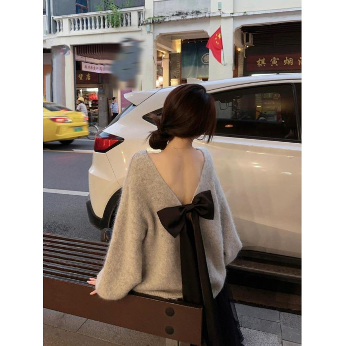 韓系背影殺露背蝴蝶結套頭針織上衣女秋季寬松顯瘦灰色羊駝毛毛衣