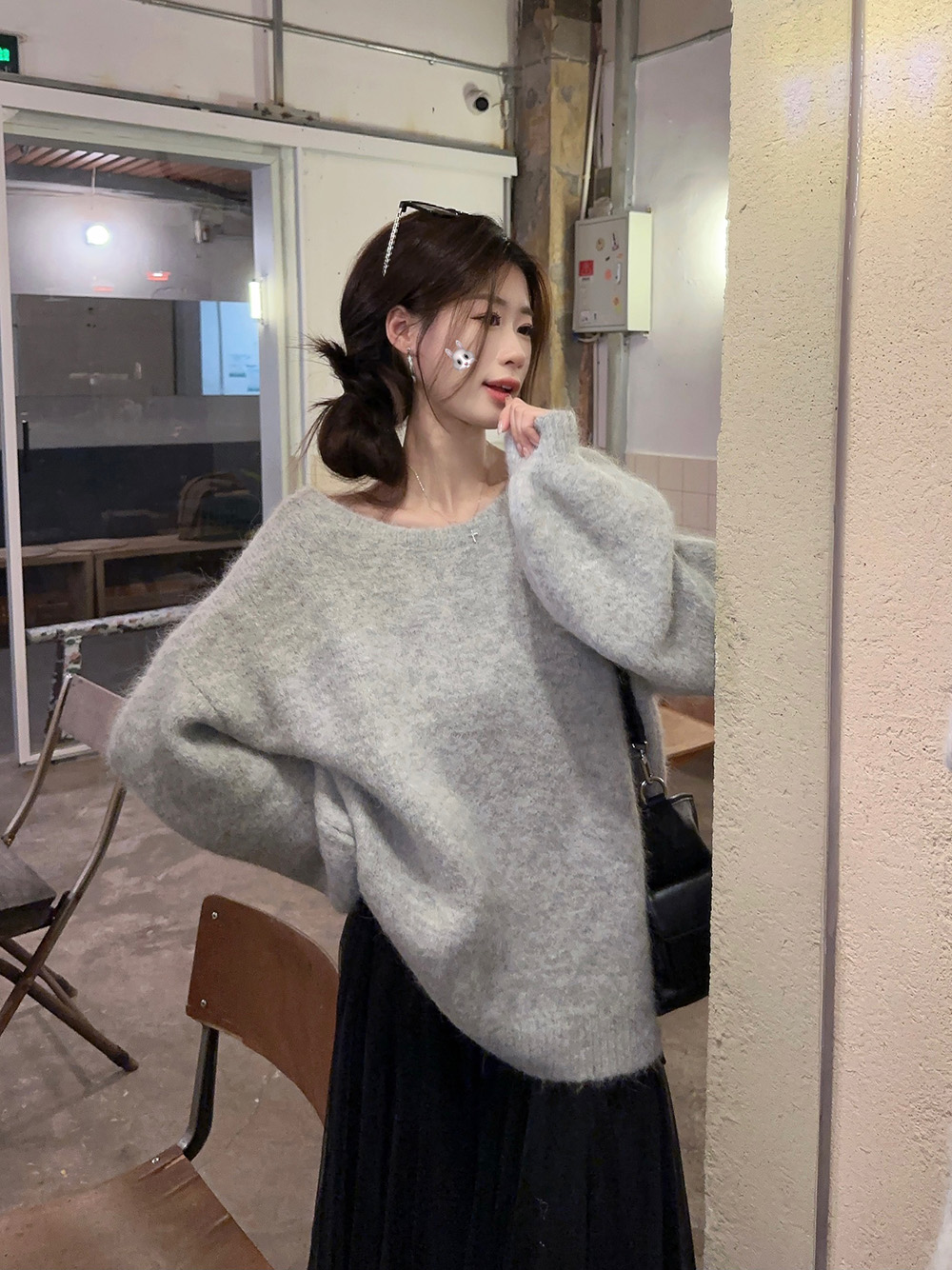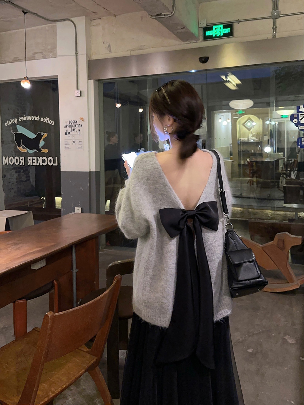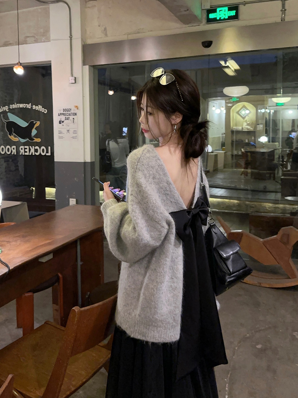 韓系背影殺露背蝴蝶結套頭針織上衣女秋季寬松顯瘦灰色羊駝毛毛衣