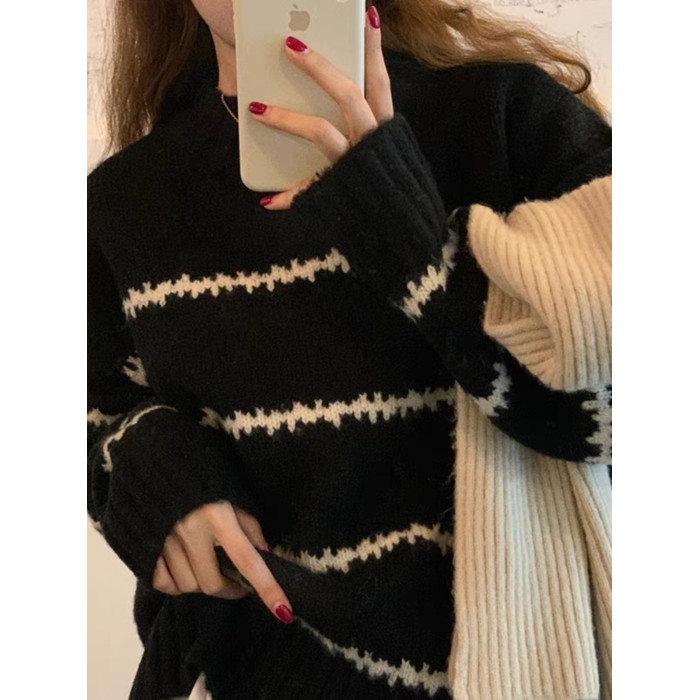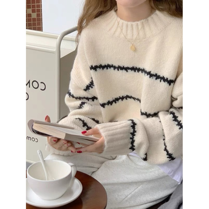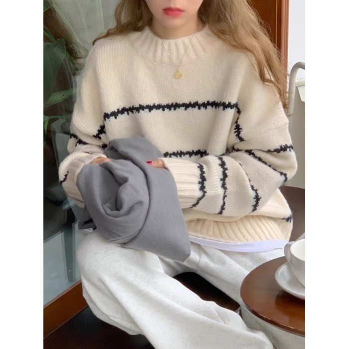 韓系軟糯慵懶風毛衣女秋冬季新款加絨加厚針織衫圓領套頭外穿上衣