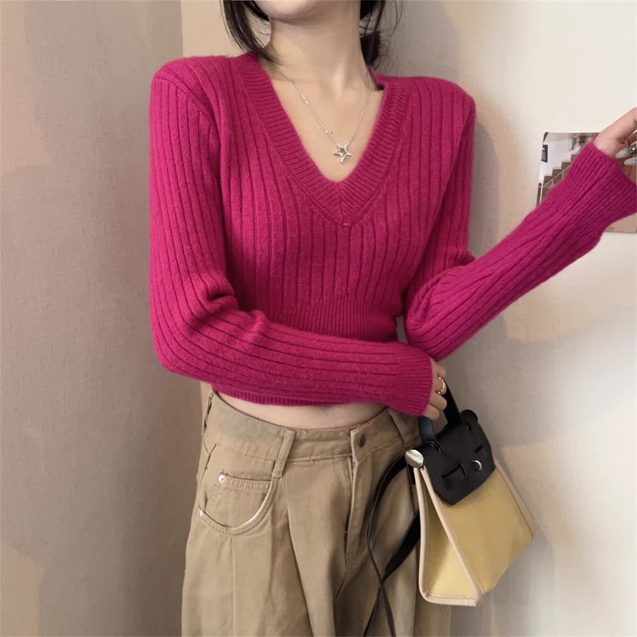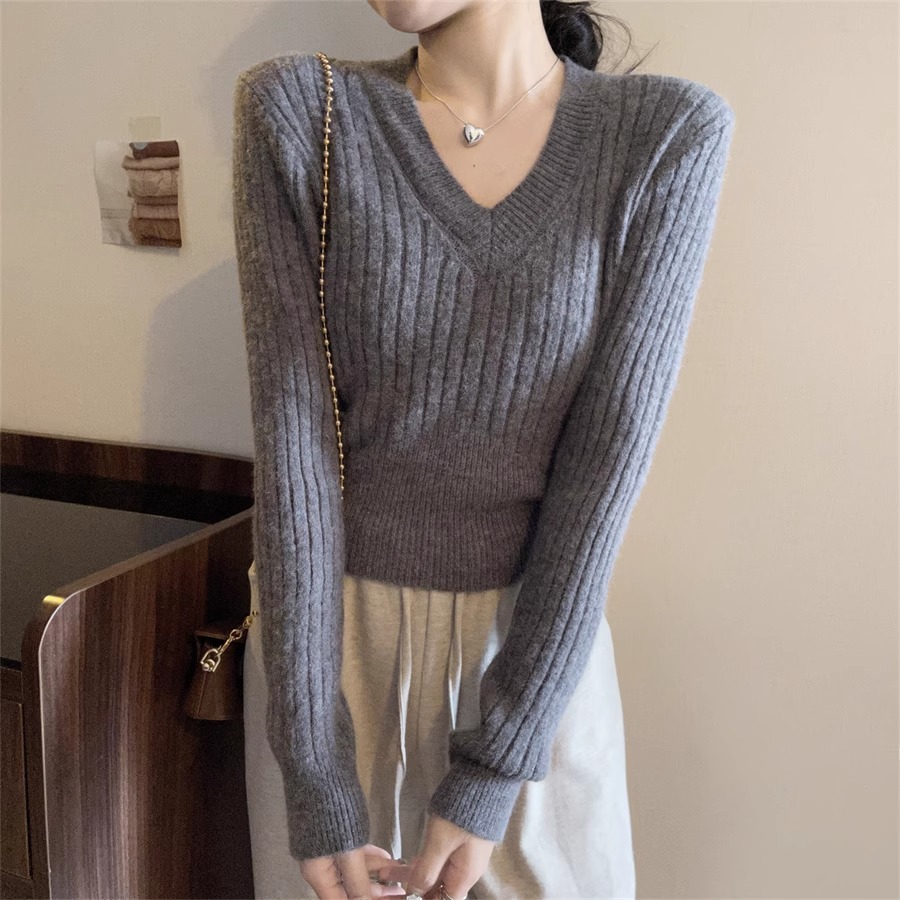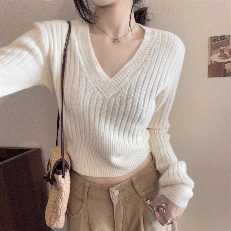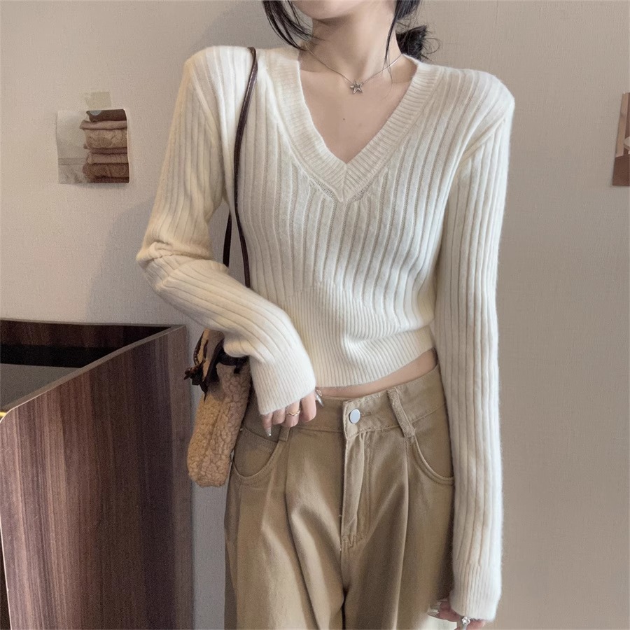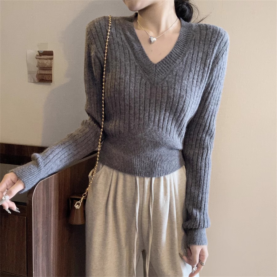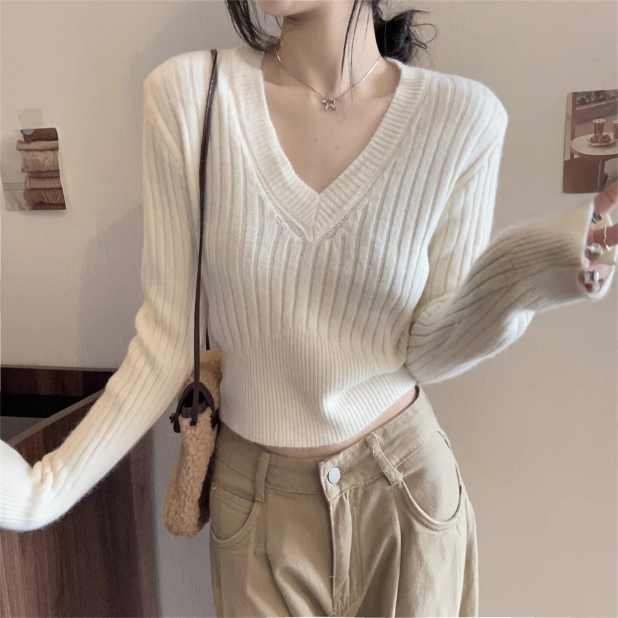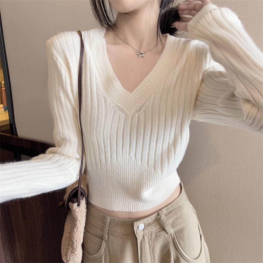 韓系簡約V領坑條短款毛衣女秋冬小個子修身顯瘦套頭外穿針織上衣