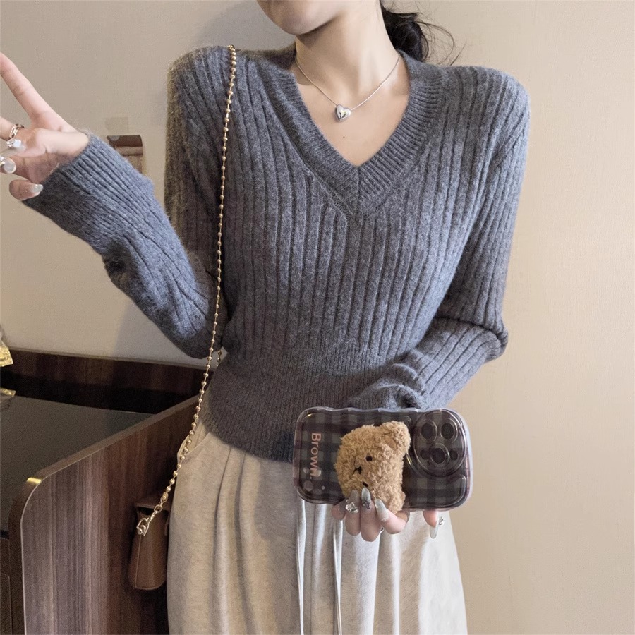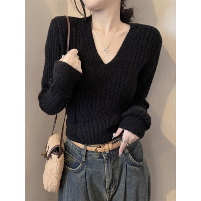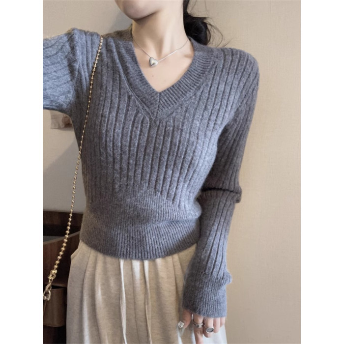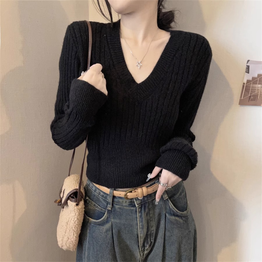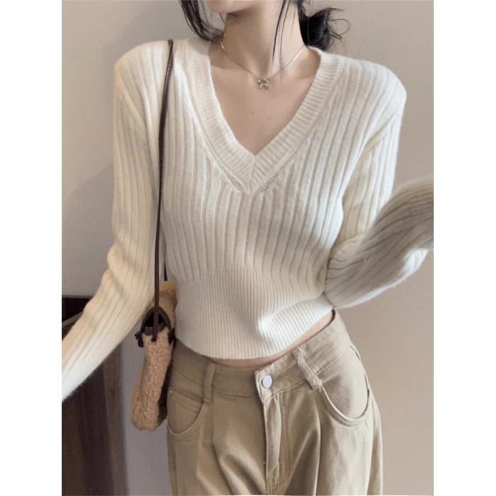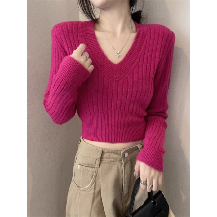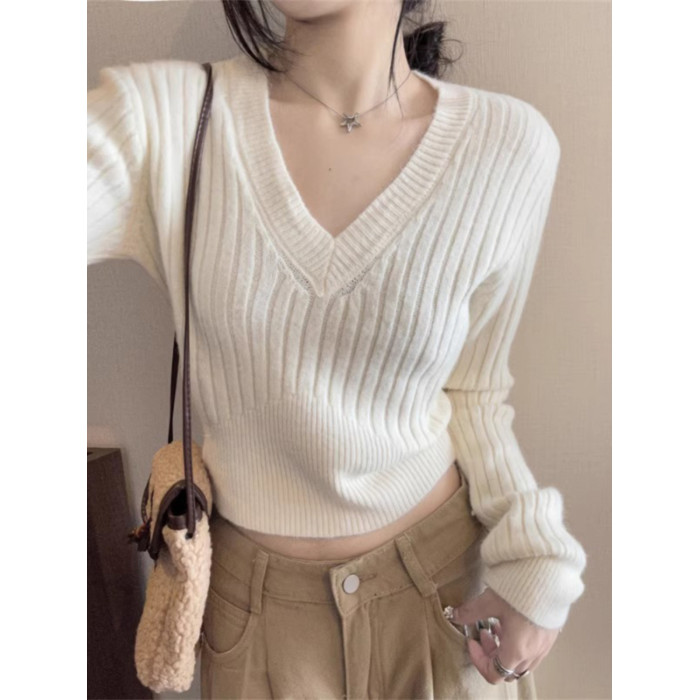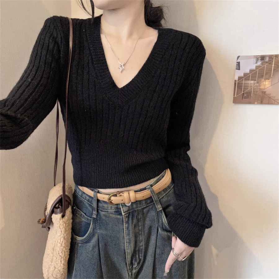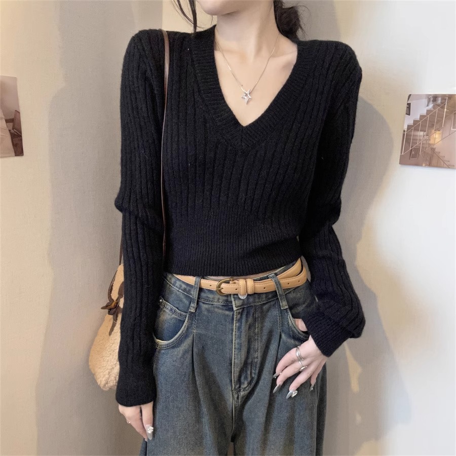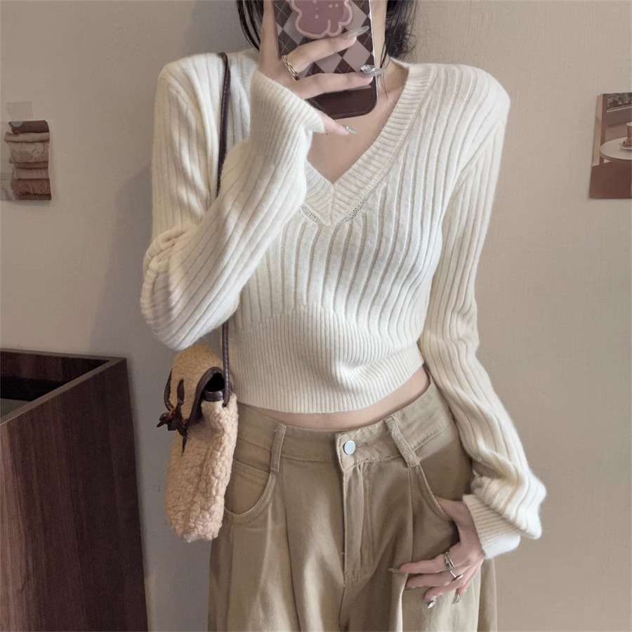 韓系簡約V領坑條短款毛衣女秋冬小個子修身顯瘦套頭外穿針織上衣