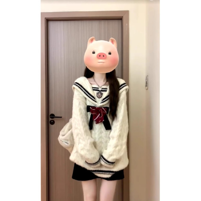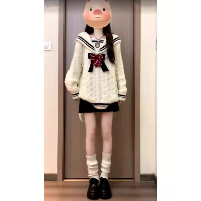 小個子甜酷學院風蝴蝶結海軍領毛衣女秋冬寬松慵懶針織衫麻花上衣