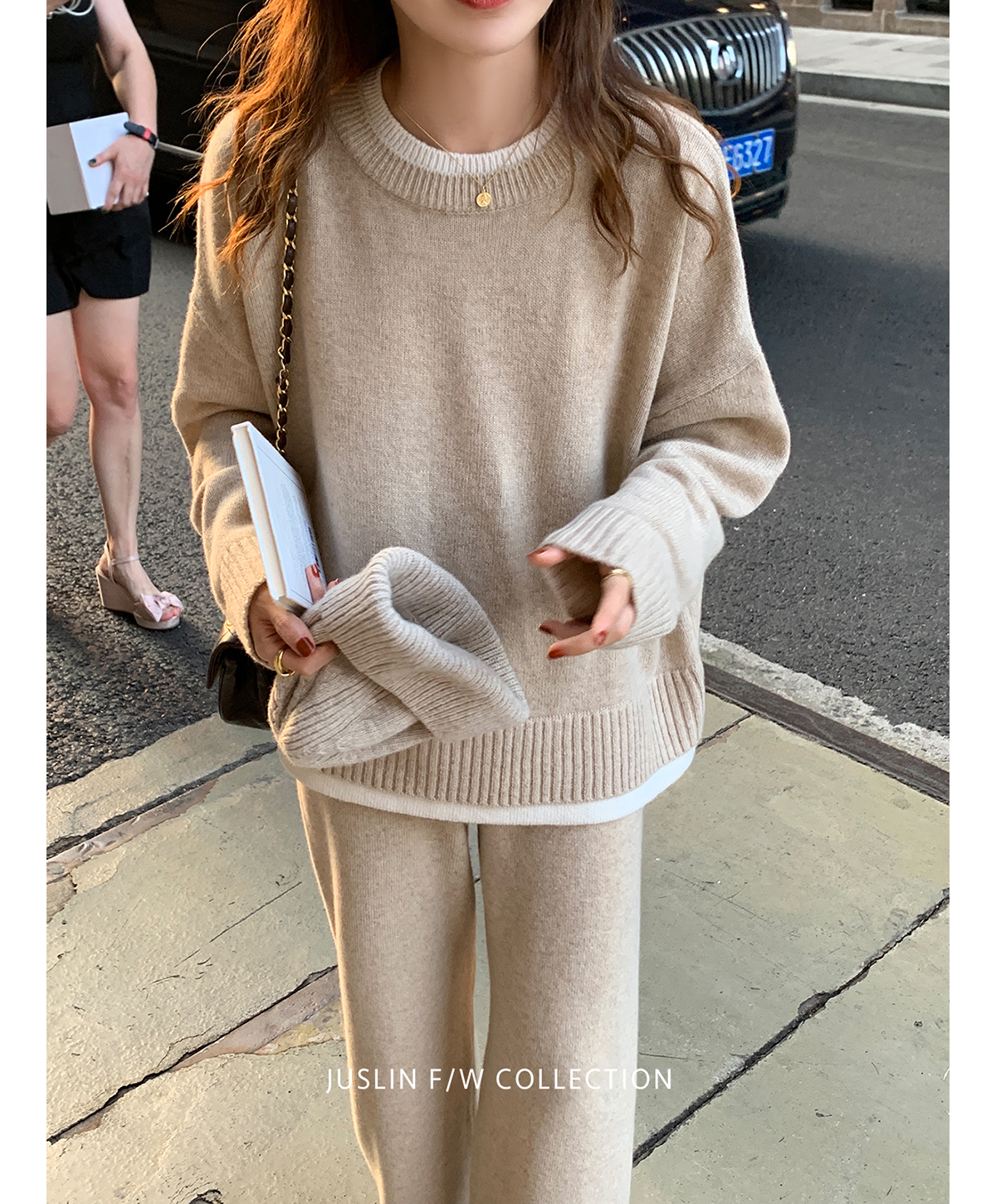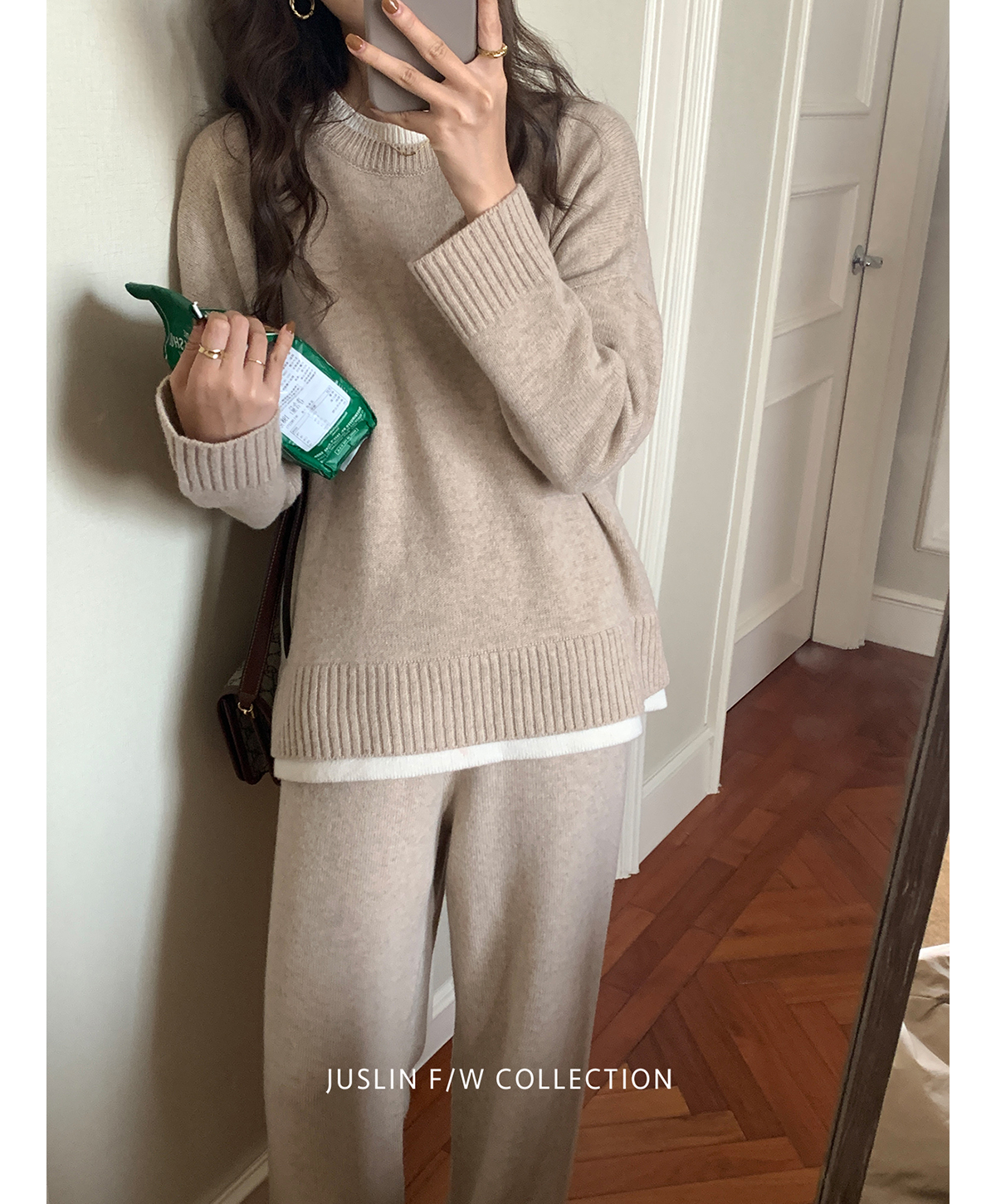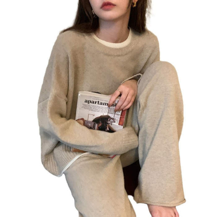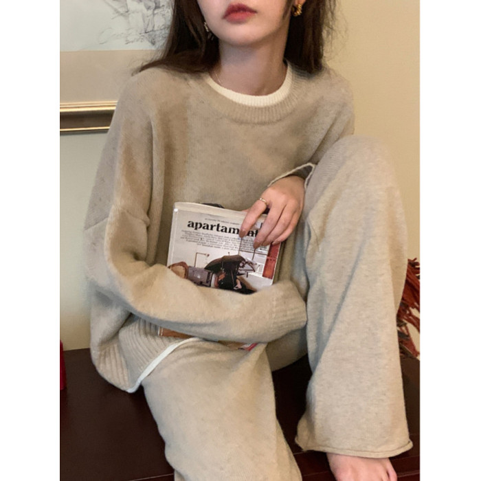 燕麥色假兩件毛衣兩件套裝慵懶風打底女秋冬上衣內搭奶茶色針織衫