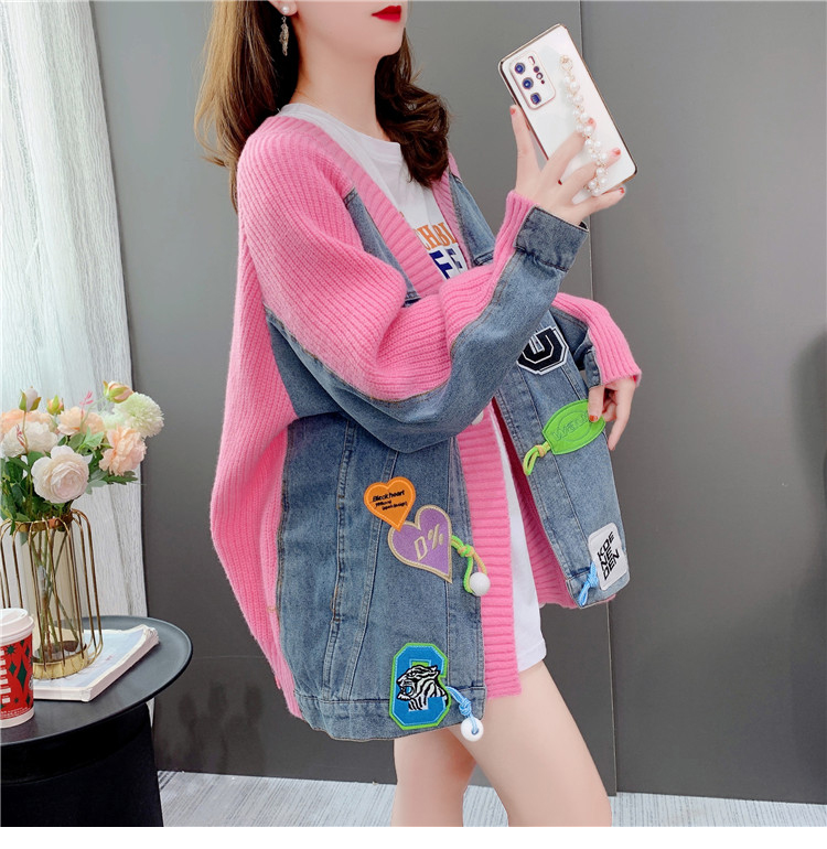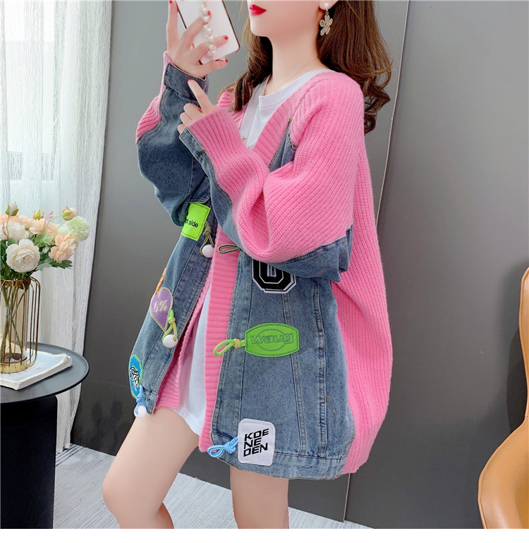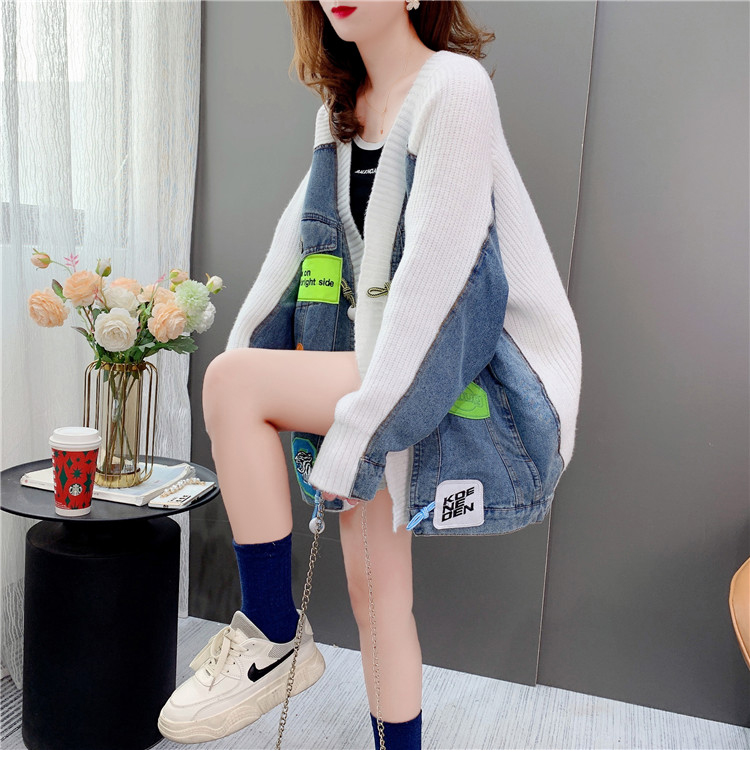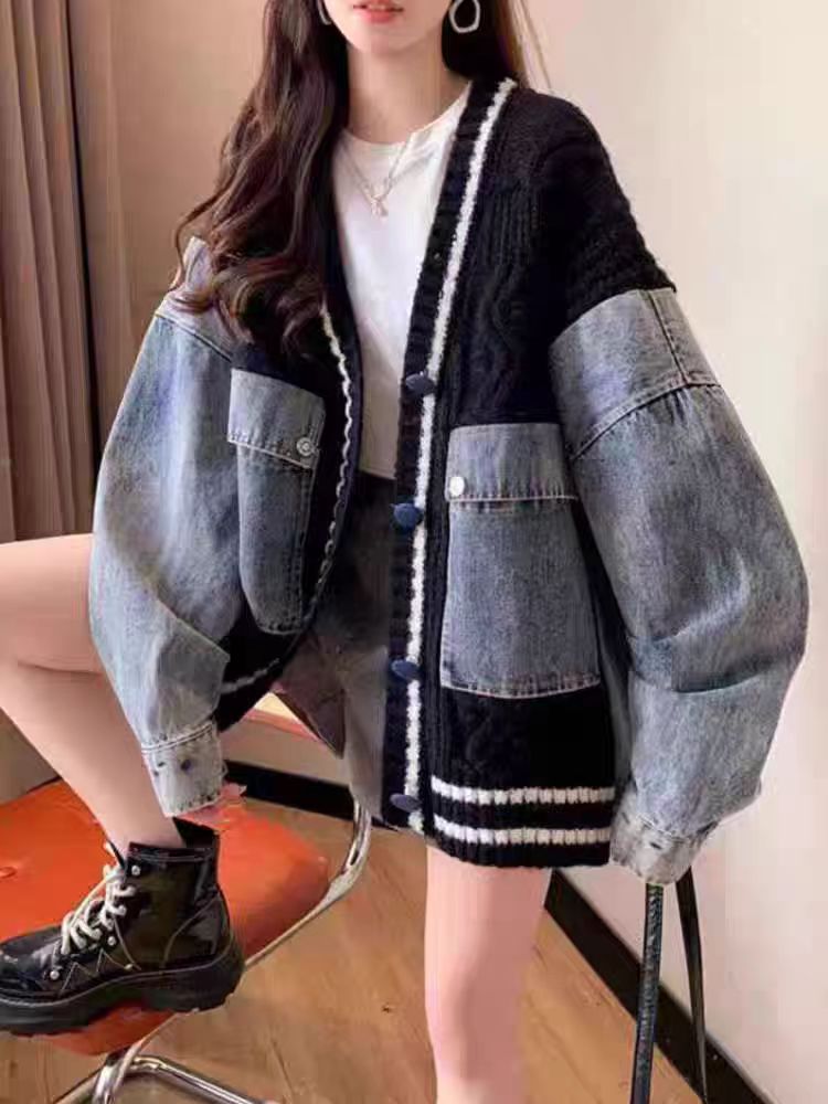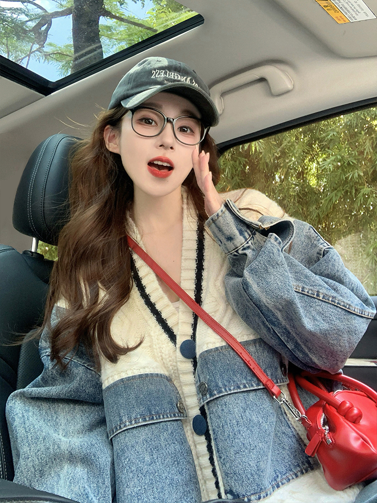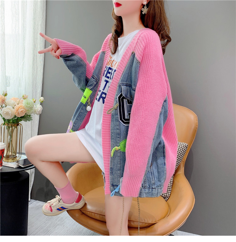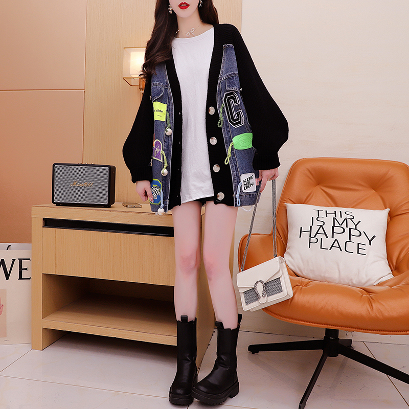 設計感牛仔拼接毛衣開衫2022年新款秋冬寬松慵懶風針織外套上衣