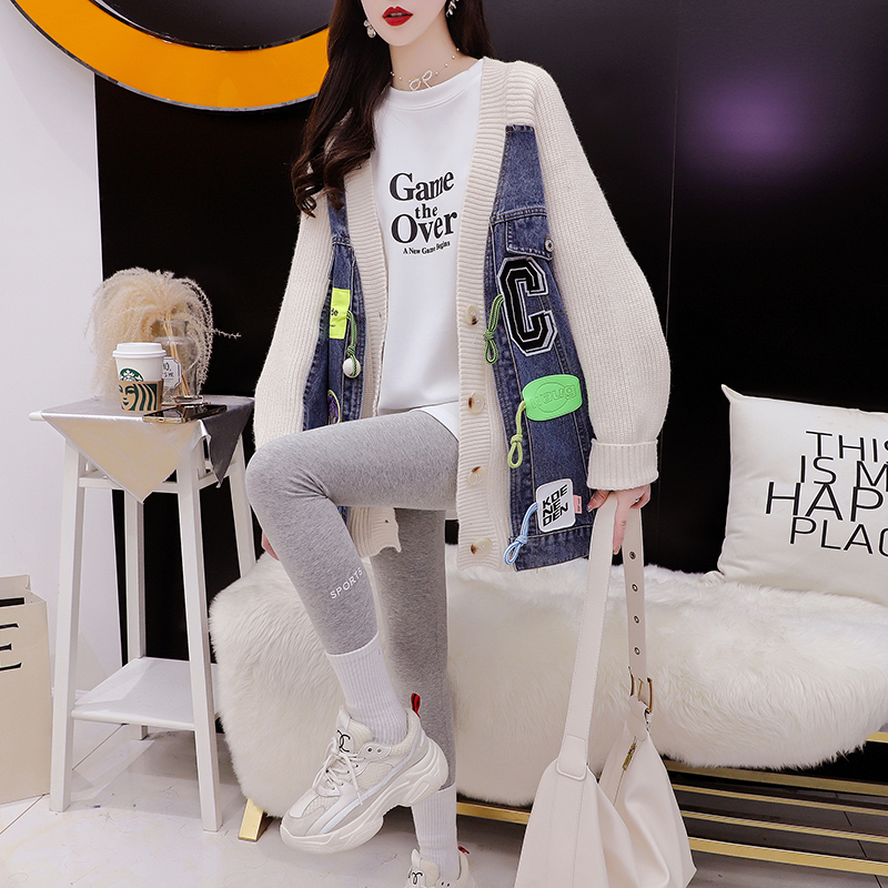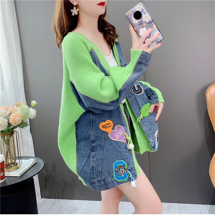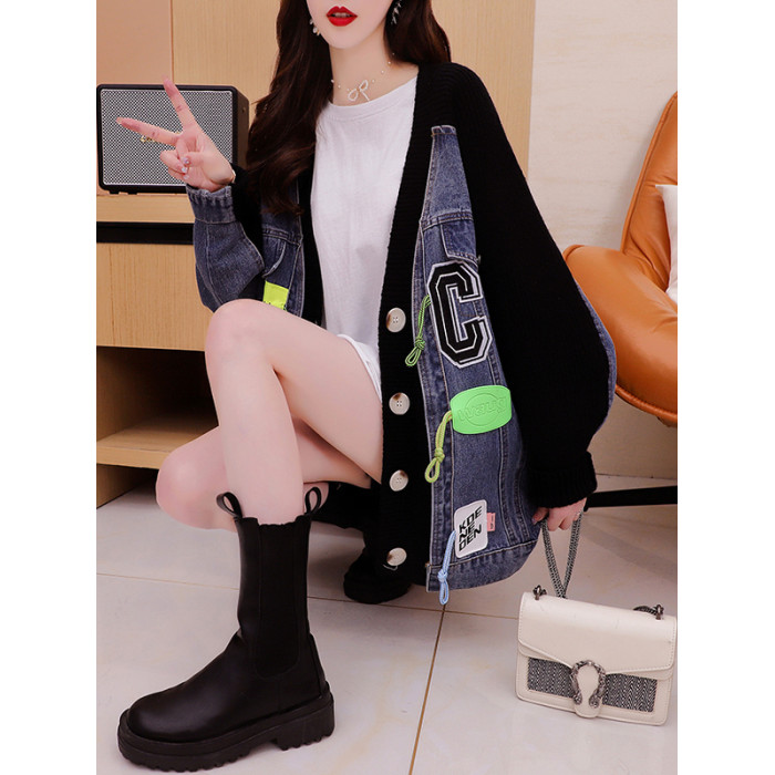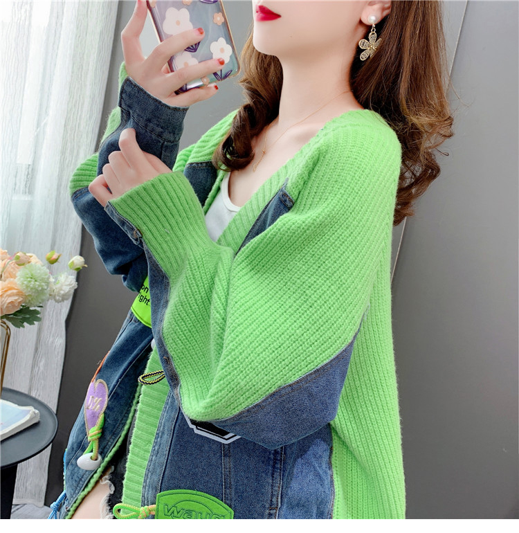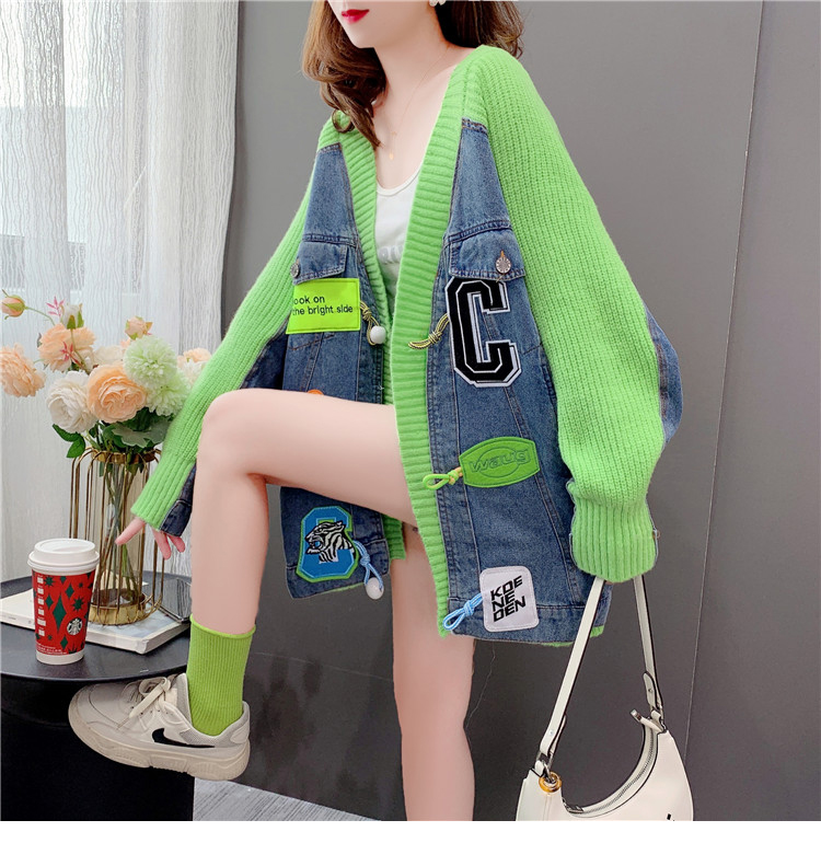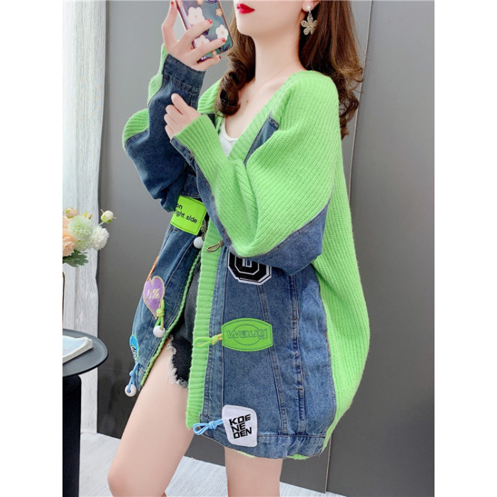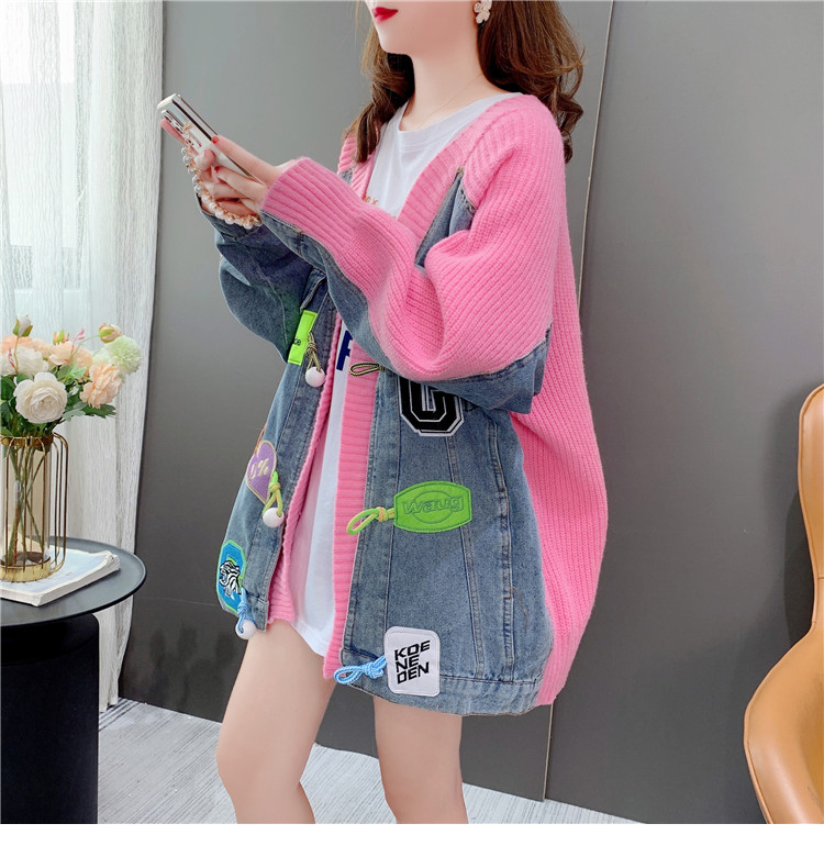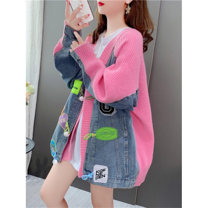 設計感牛仔拼接毛衣開衫2022年新款秋冬寬松慵懶風針織外套上衣