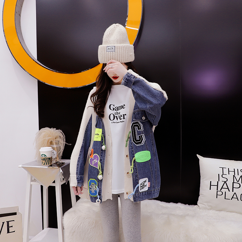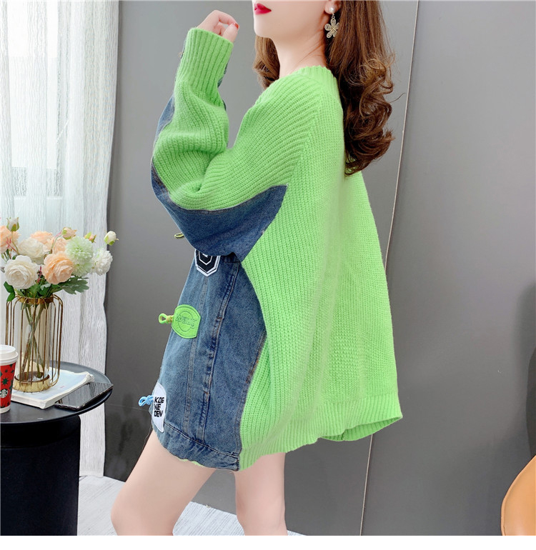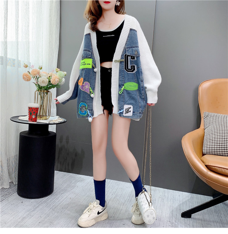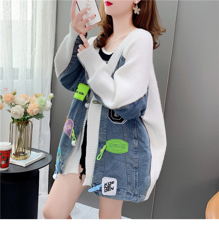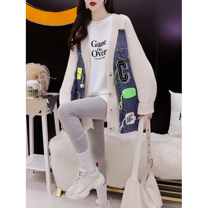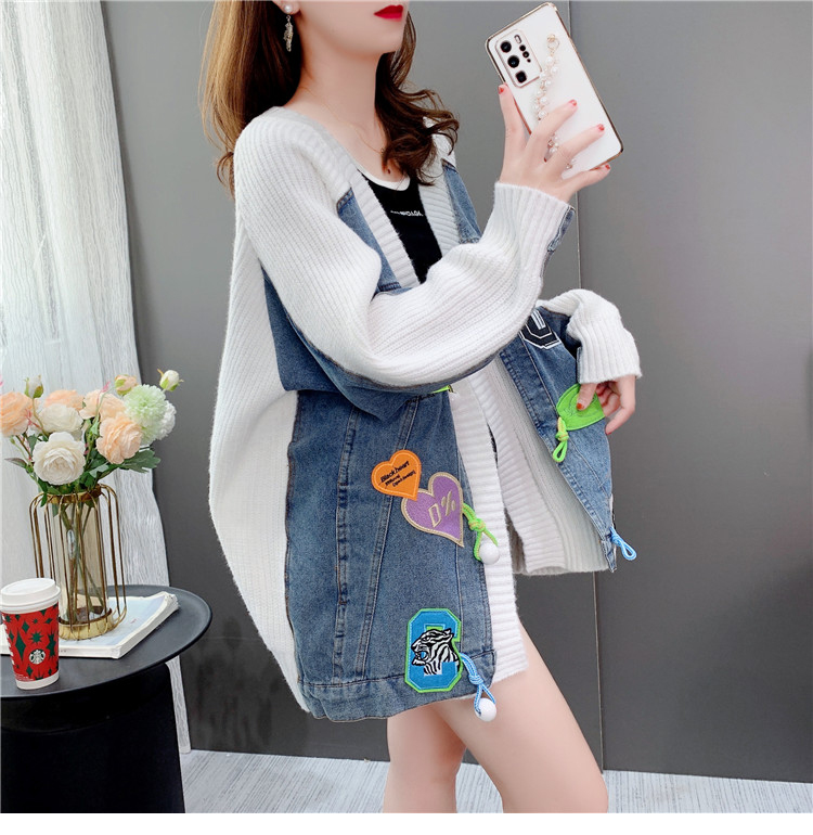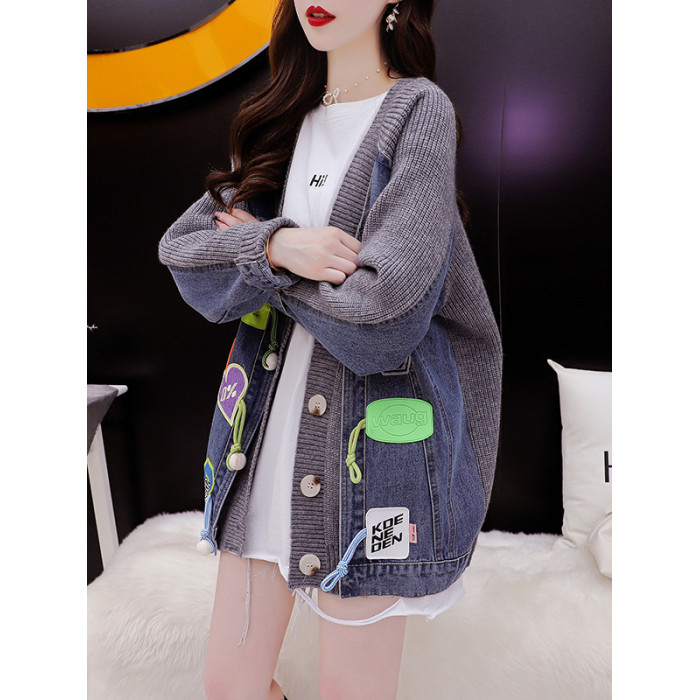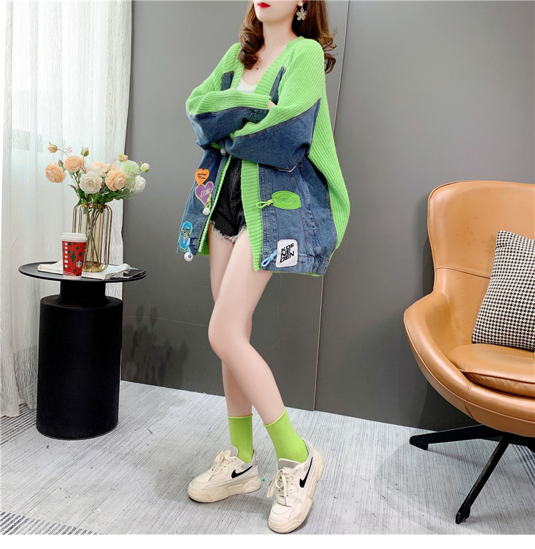 設計感牛仔拼接毛衣開衫2022年新款秋冬寬松慵懶風針織外套上衣
