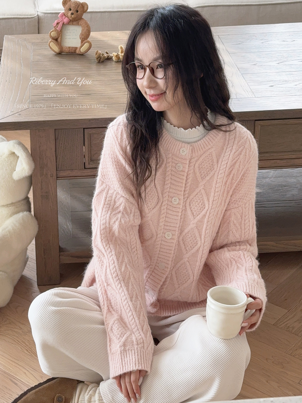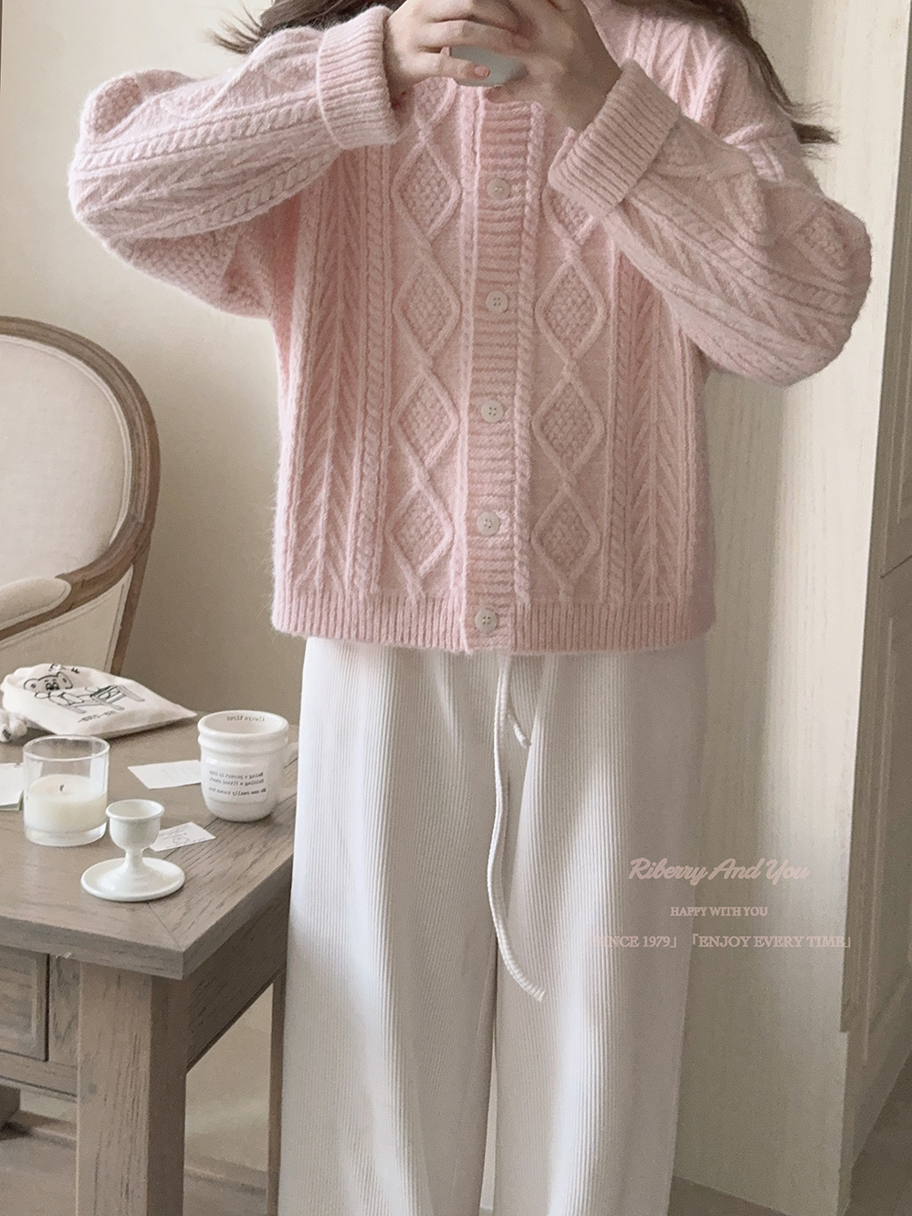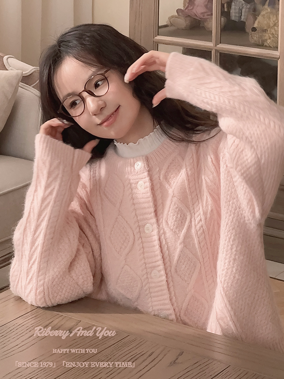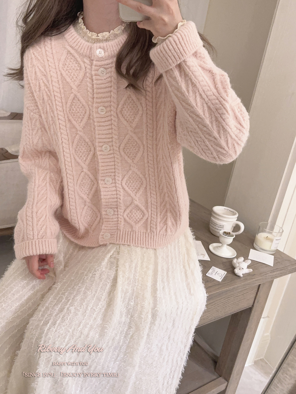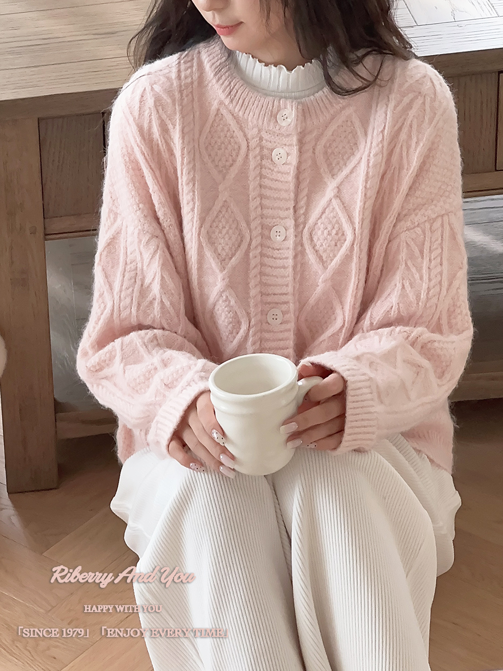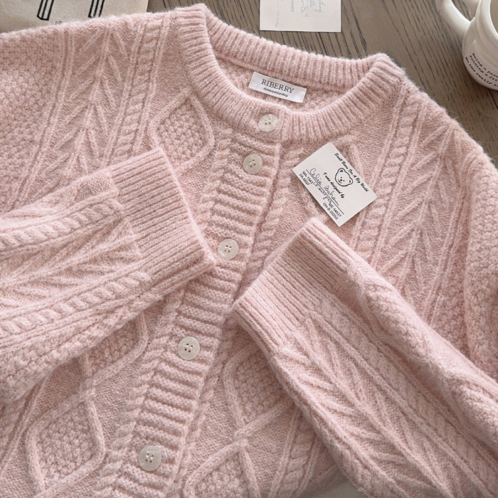 復古麻花 溫柔櫻花粉 古著感奶油杏 針織毛衣開衫 K