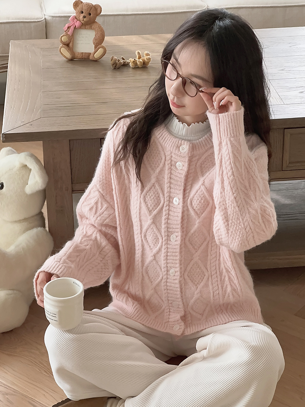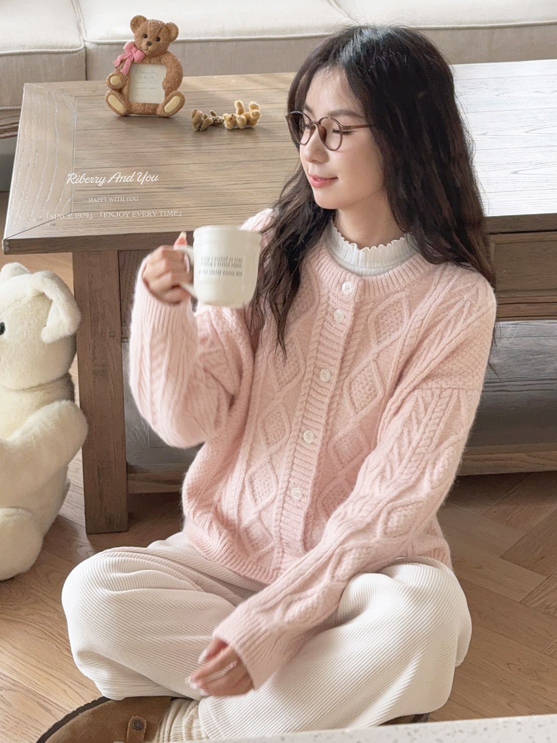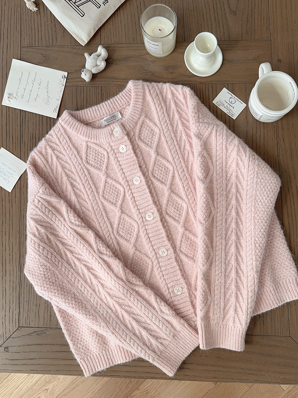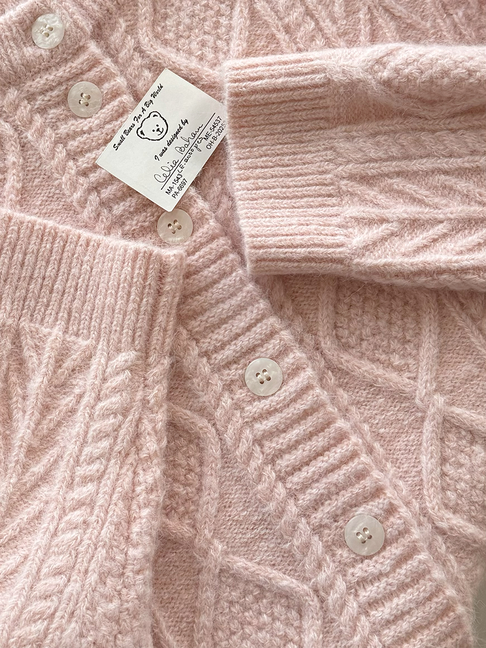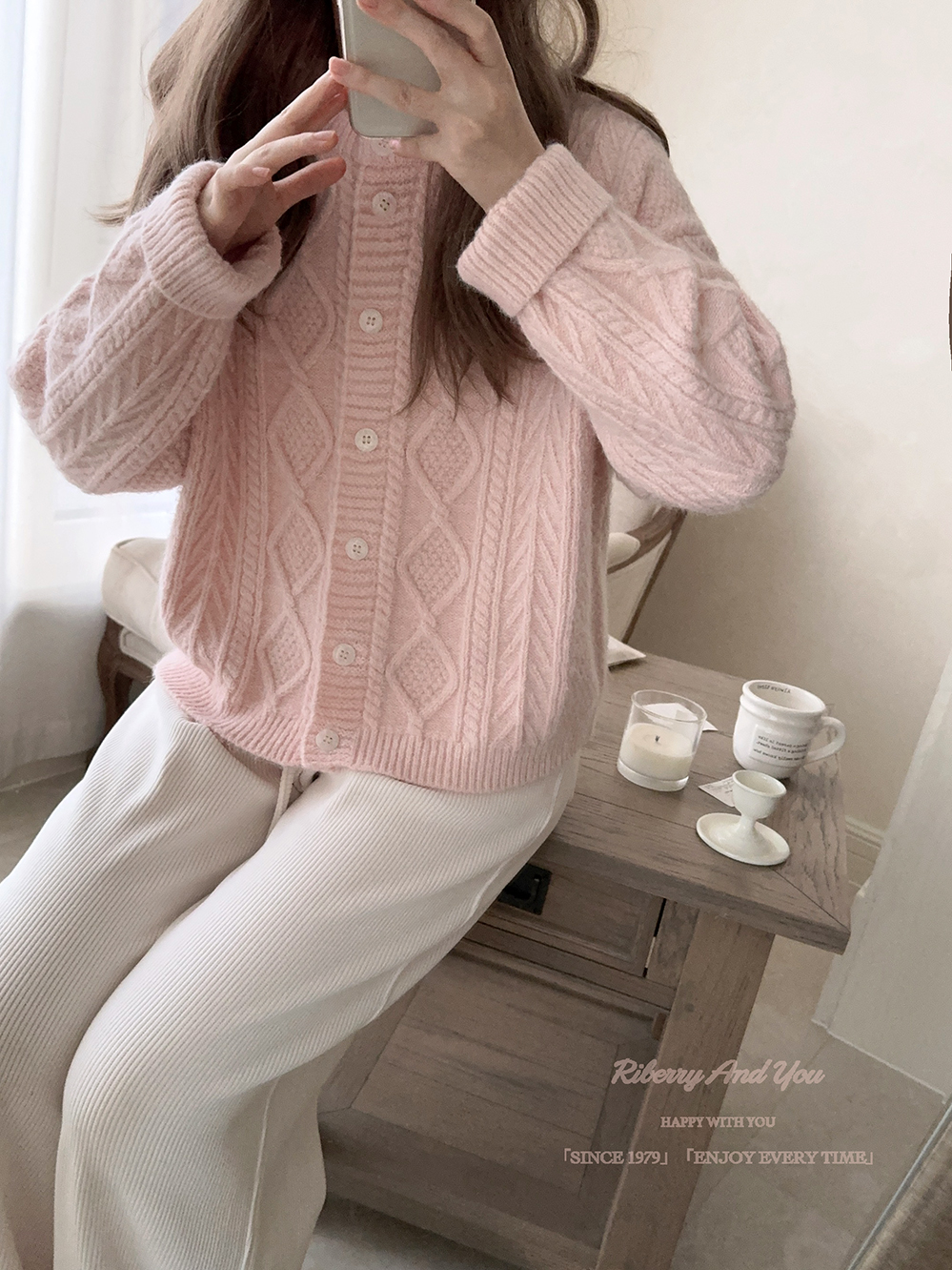 復古麻花 溫柔櫻花粉 古著感奶油杏 針織毛衣開衫 K