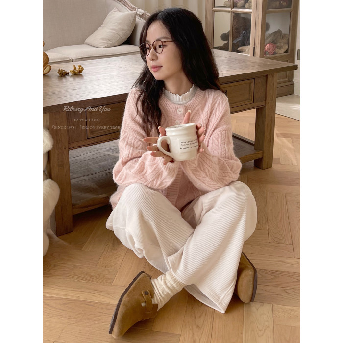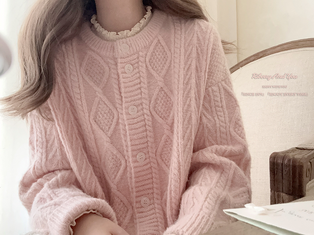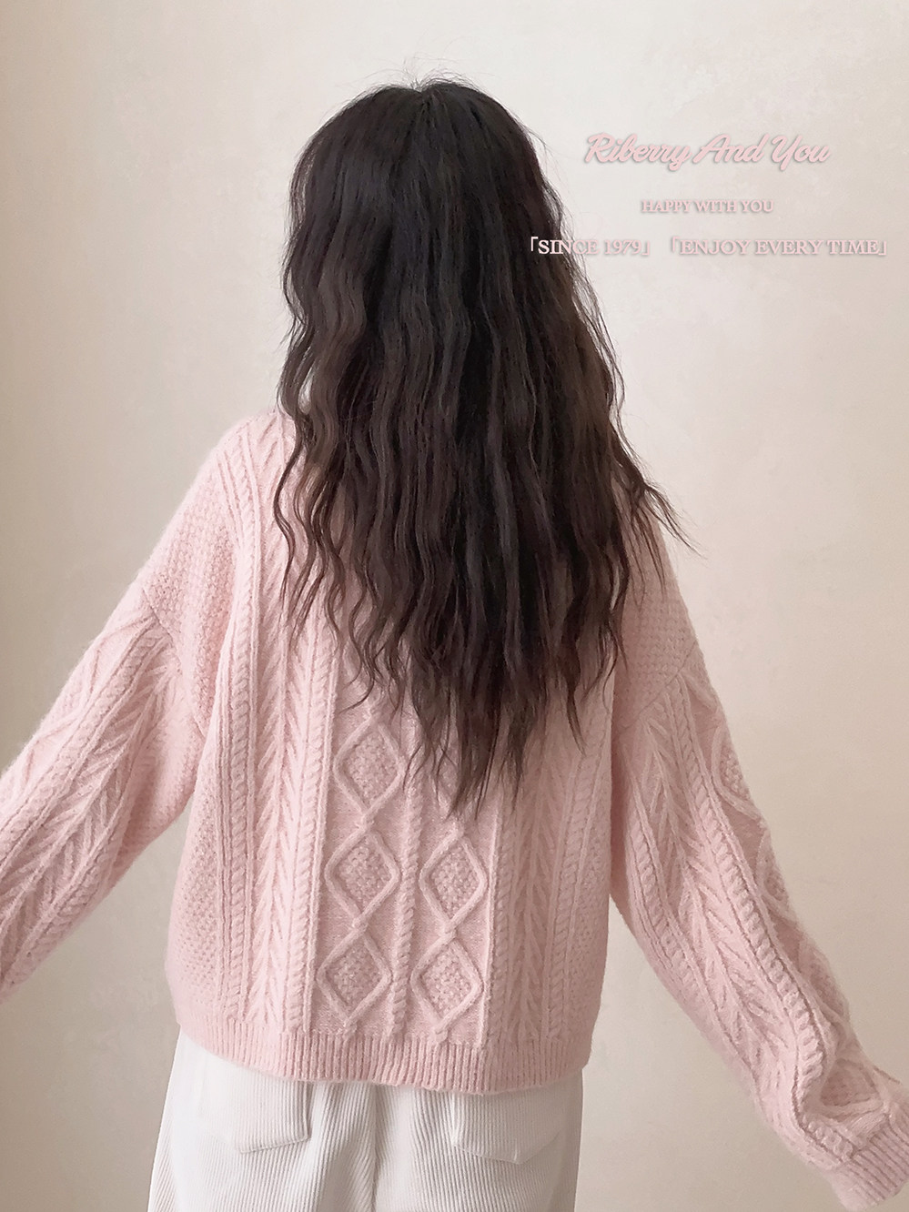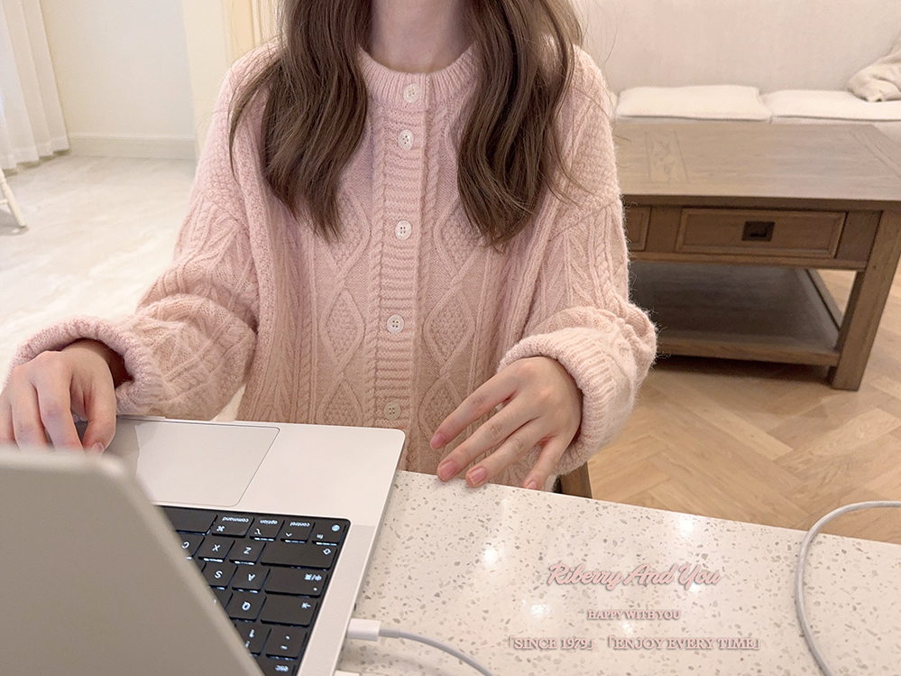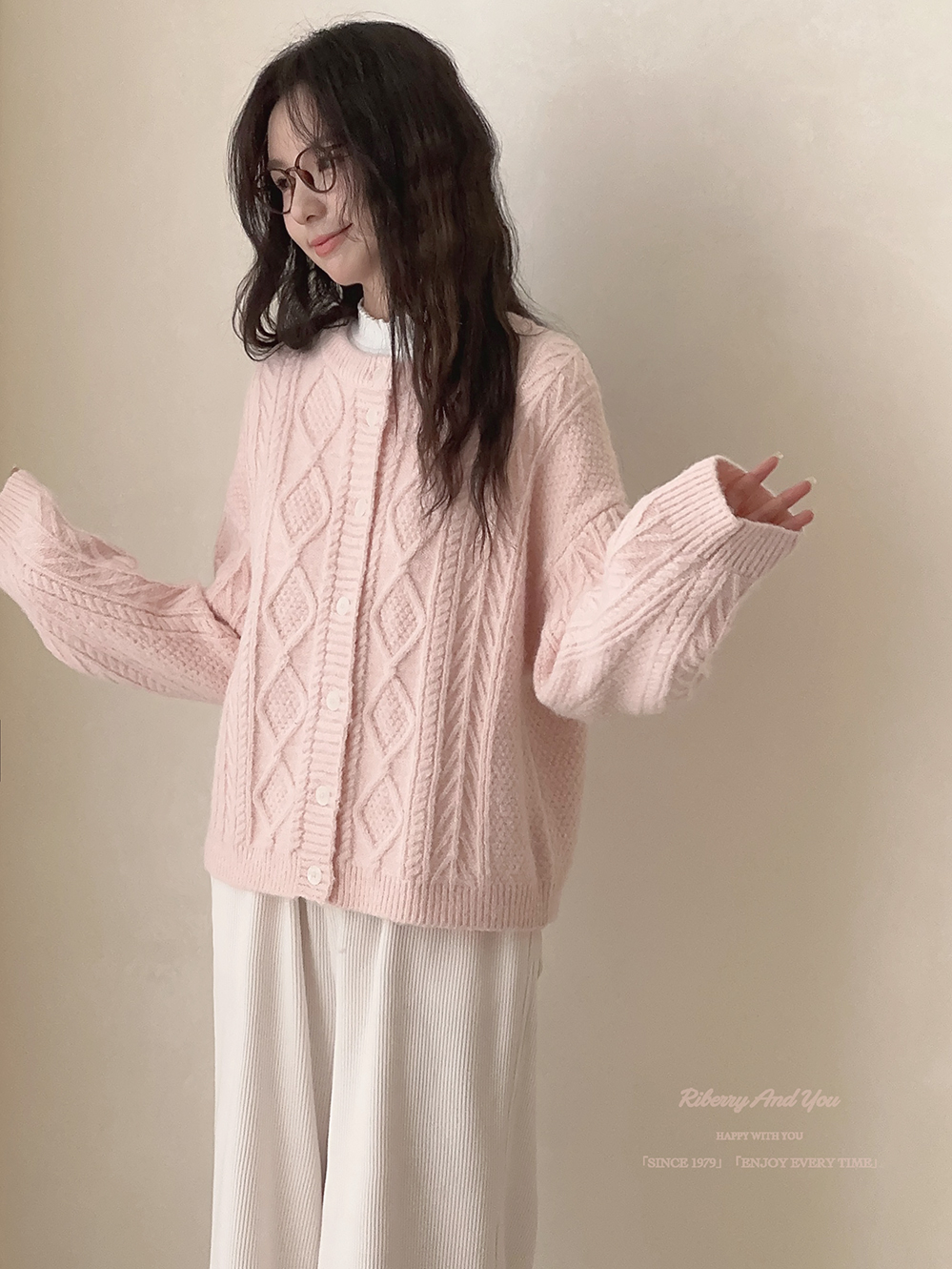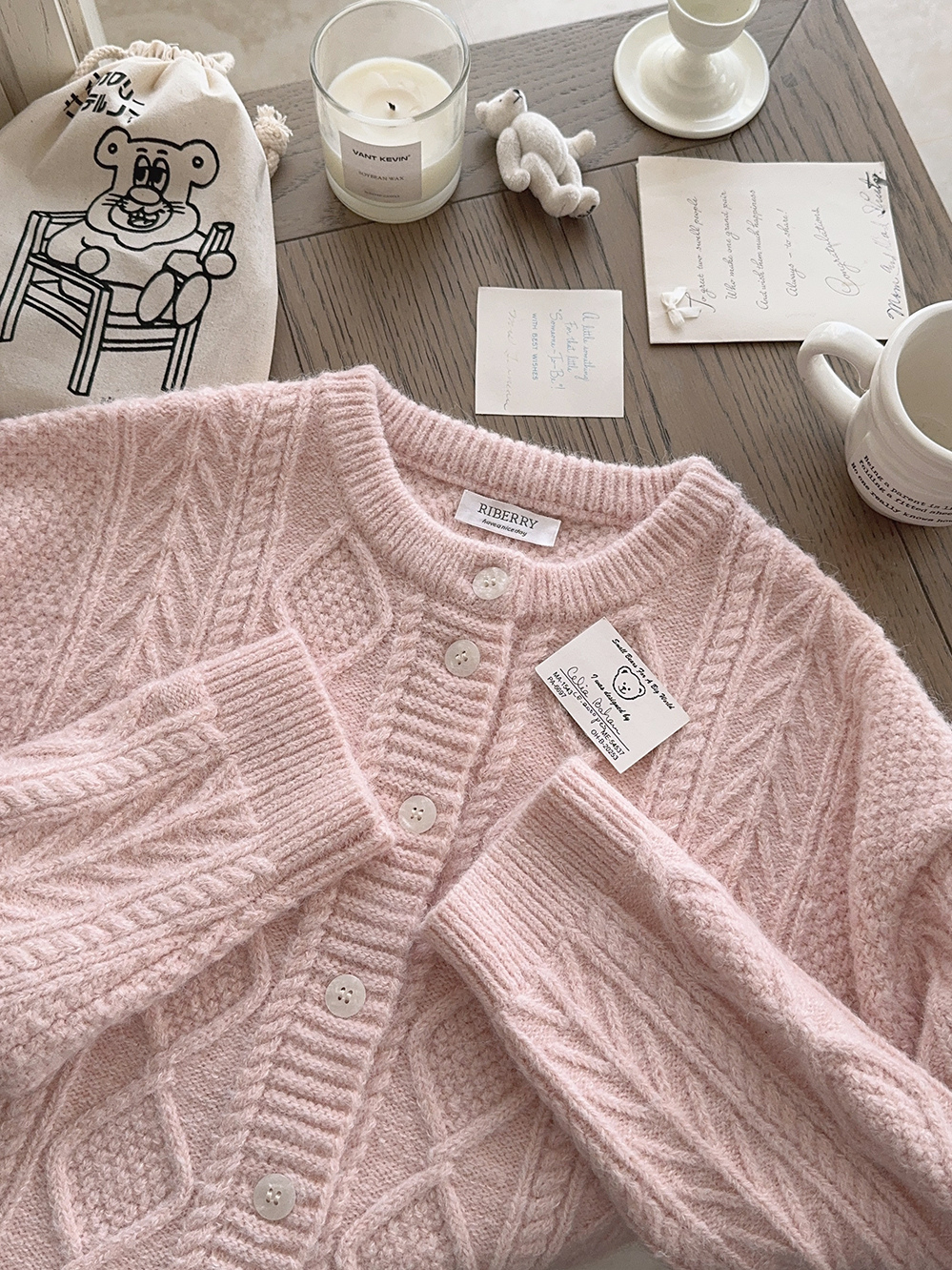 復古麻花 溫柔櫻花粉 古著感奶油杏 針織毛衣開衫 K