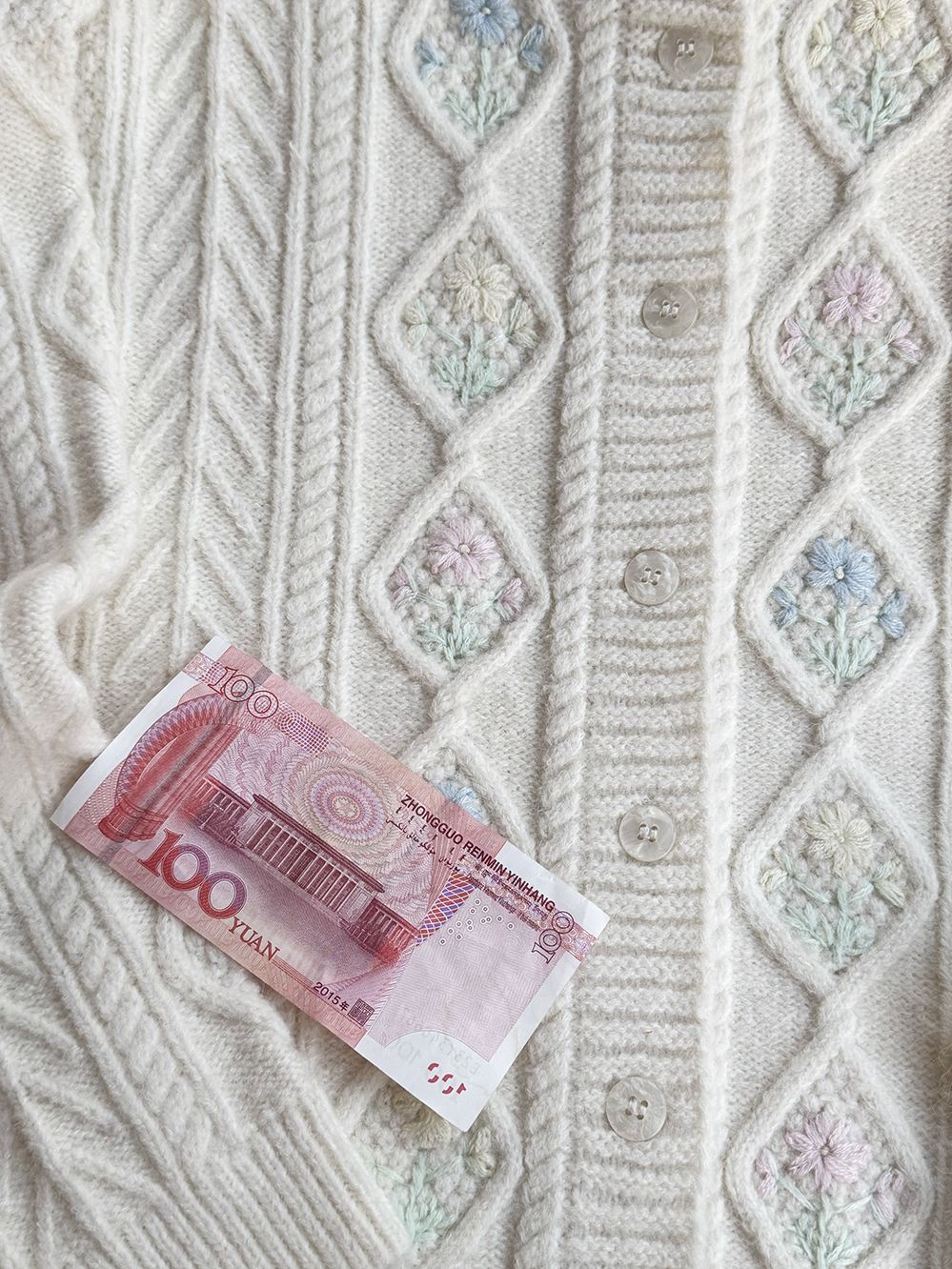 手工綉花,不同的兩件一定有差異,人工做不到一模一樣。綉花是人工一針又一針來迴綉、多次打結,所以反面一定有很多線頭。正面可能存在某処不牢、可能有小勾線。目前基本沒有年輕人做了,大多是年紀大的人綉了,眼神沒那麽好了,做高標出口品這些問題也一樣有,現在放活時要求高就沒人敢接活做了,無法完全避免這些問題,衹能提前說明。