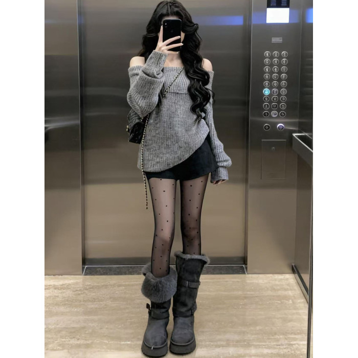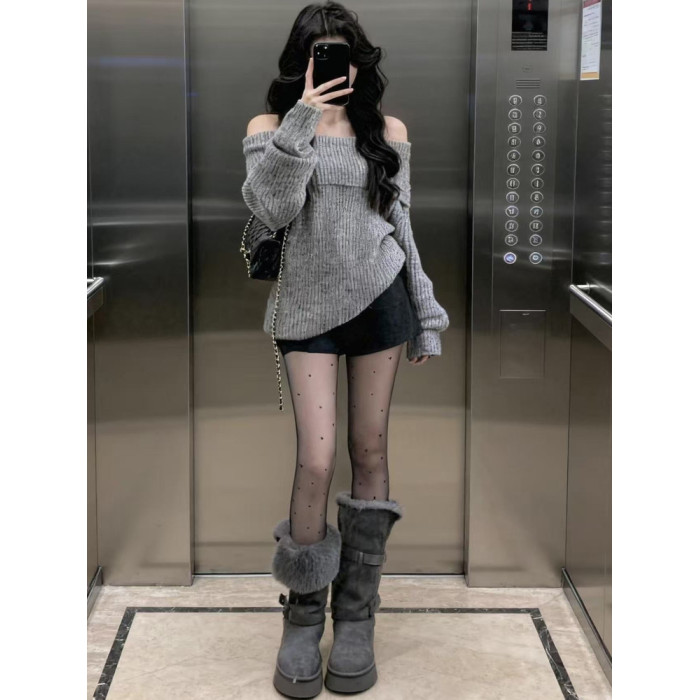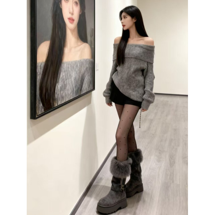 2025秋冬新款慵懶風寬松一字肩針織衫女灰色毛衣洋氣時髦露肩上衣