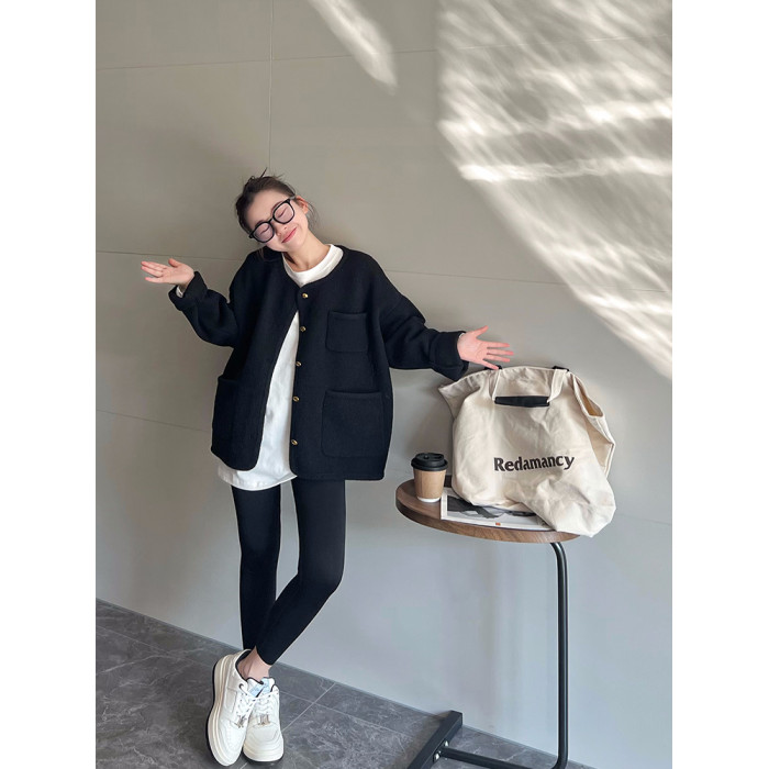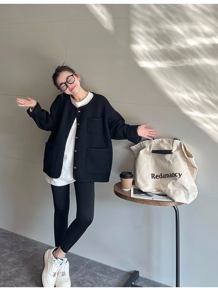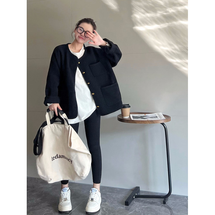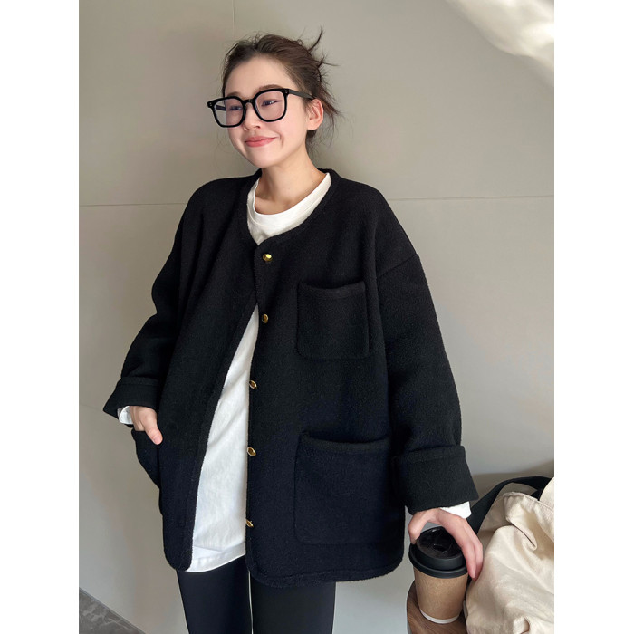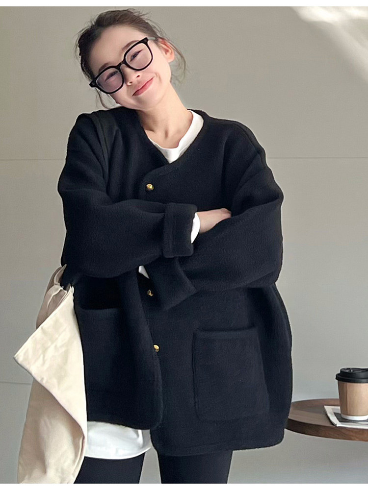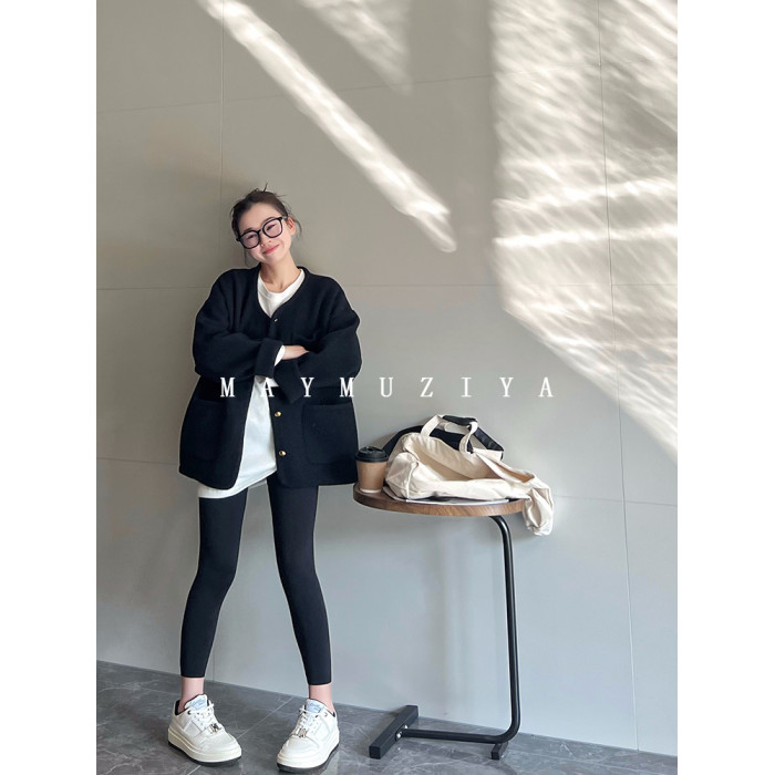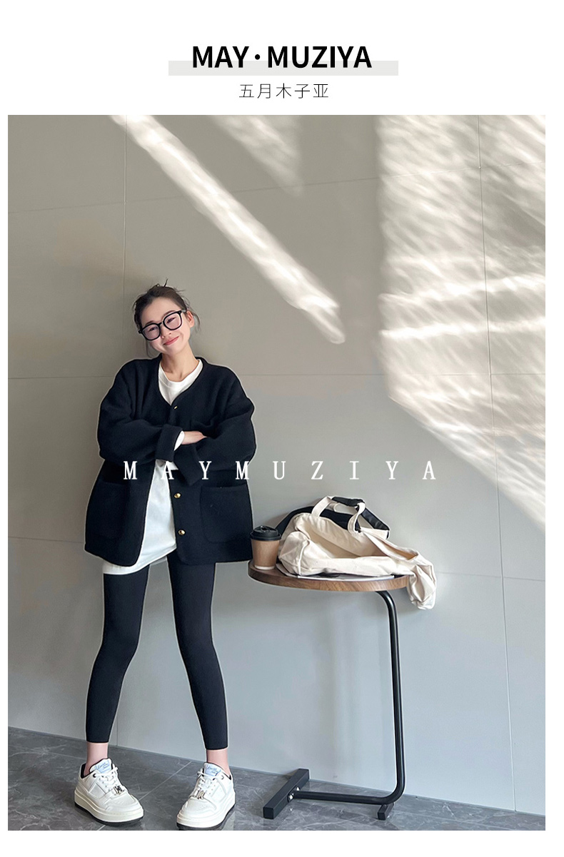 MAY MUZIYA復古黑色針織毛衣外套開衫女2025春秋季圓領慵懶風外套