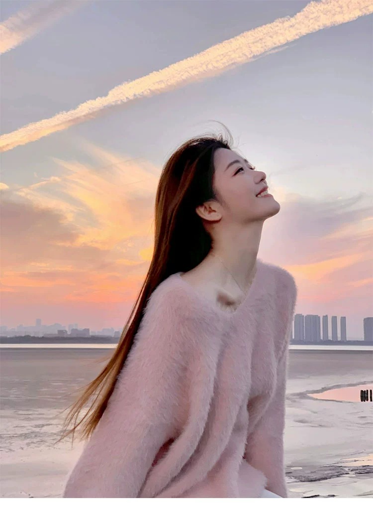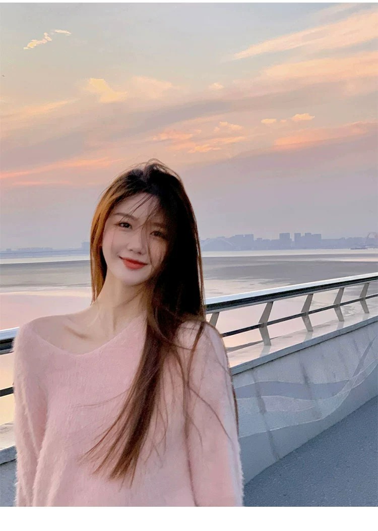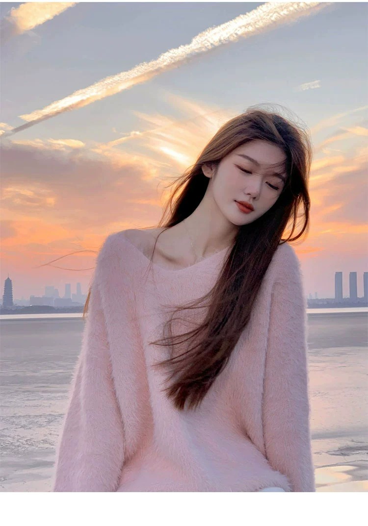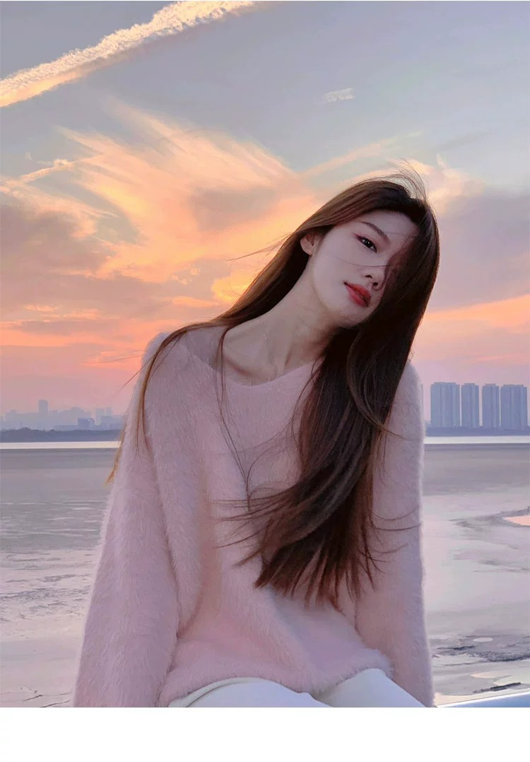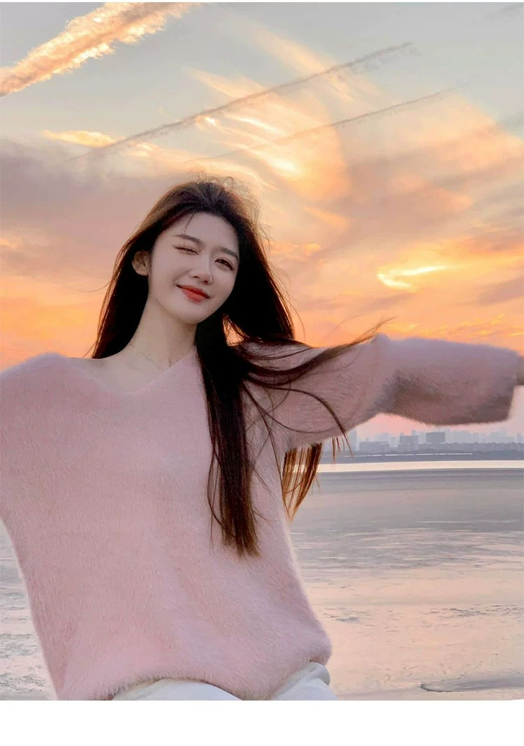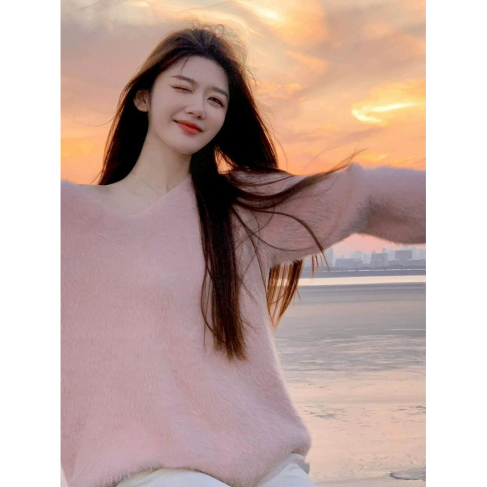 粉色毛衣女秋冬 慵懶風寬松軟糯V領套頭水貂絨溫柔氛圍感針織衫厚