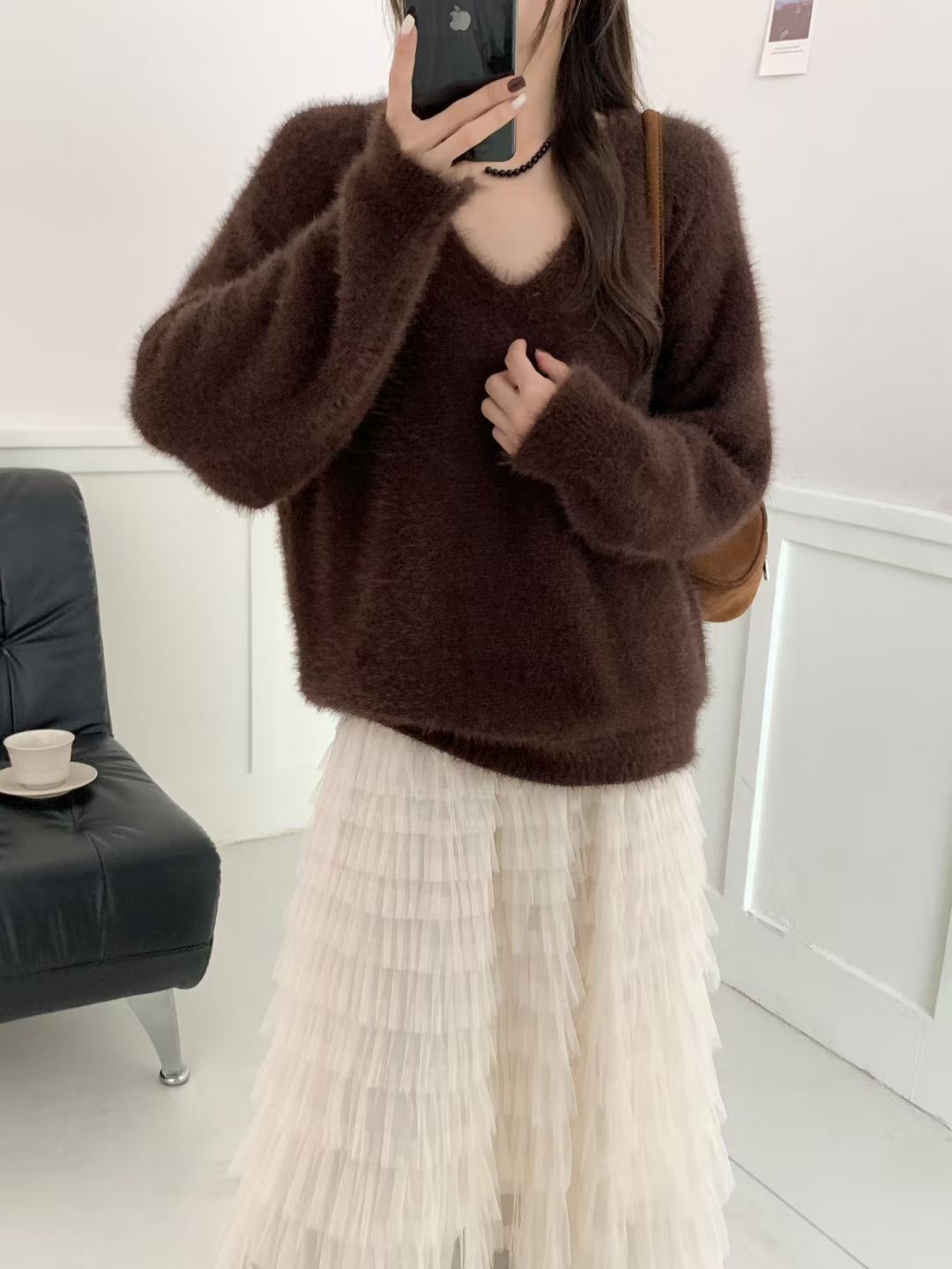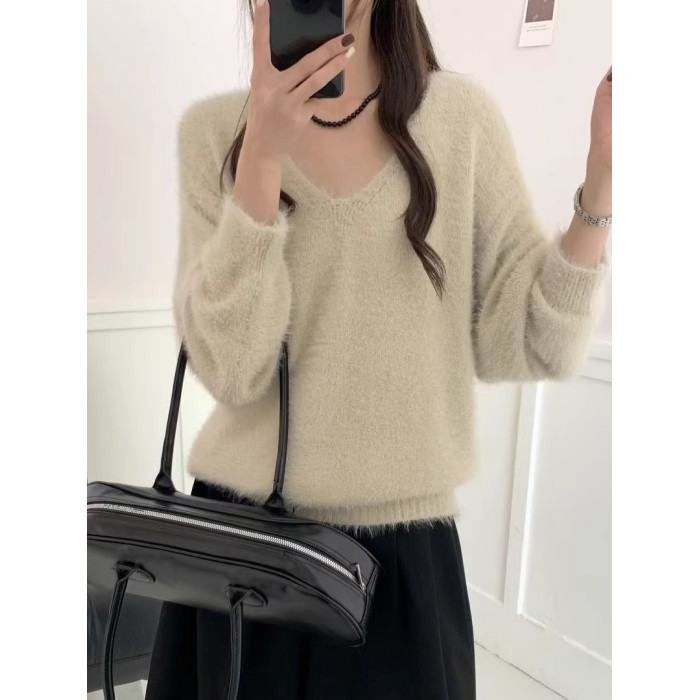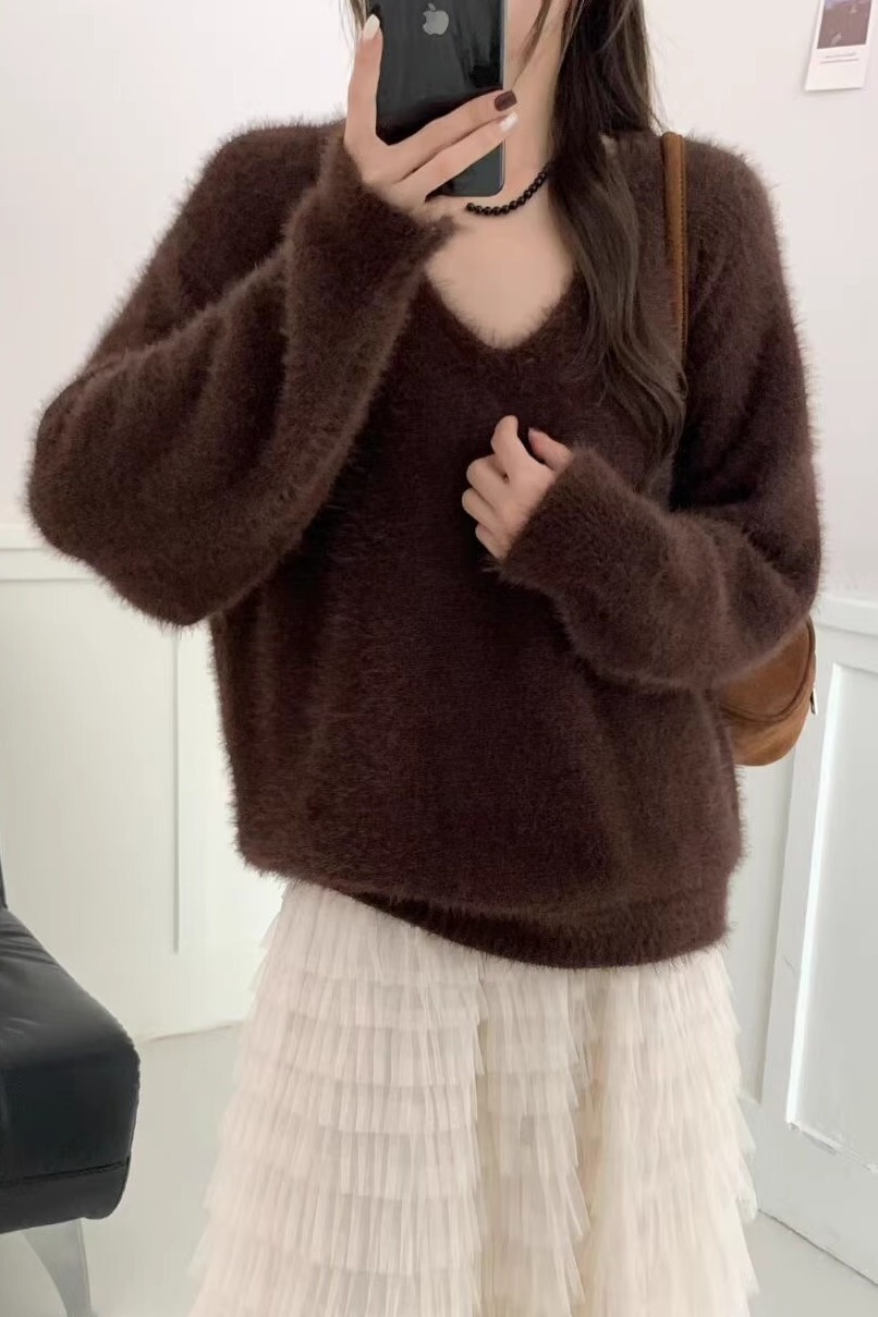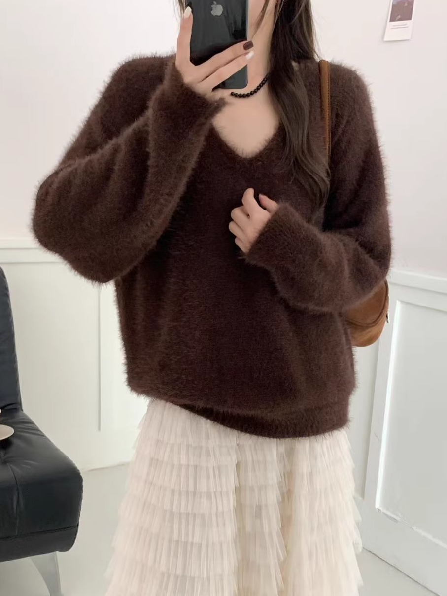 復古咖色V領水貂絨套頭毛衣女秋冬高級感寬松慵懶軟糯針織衫上衣