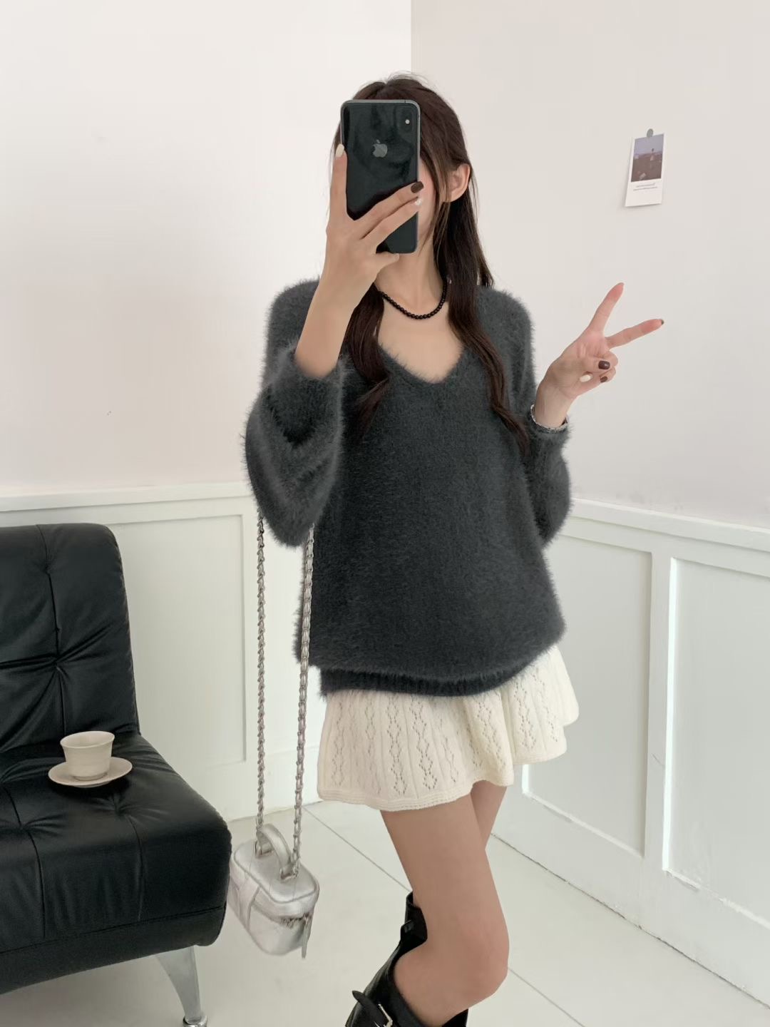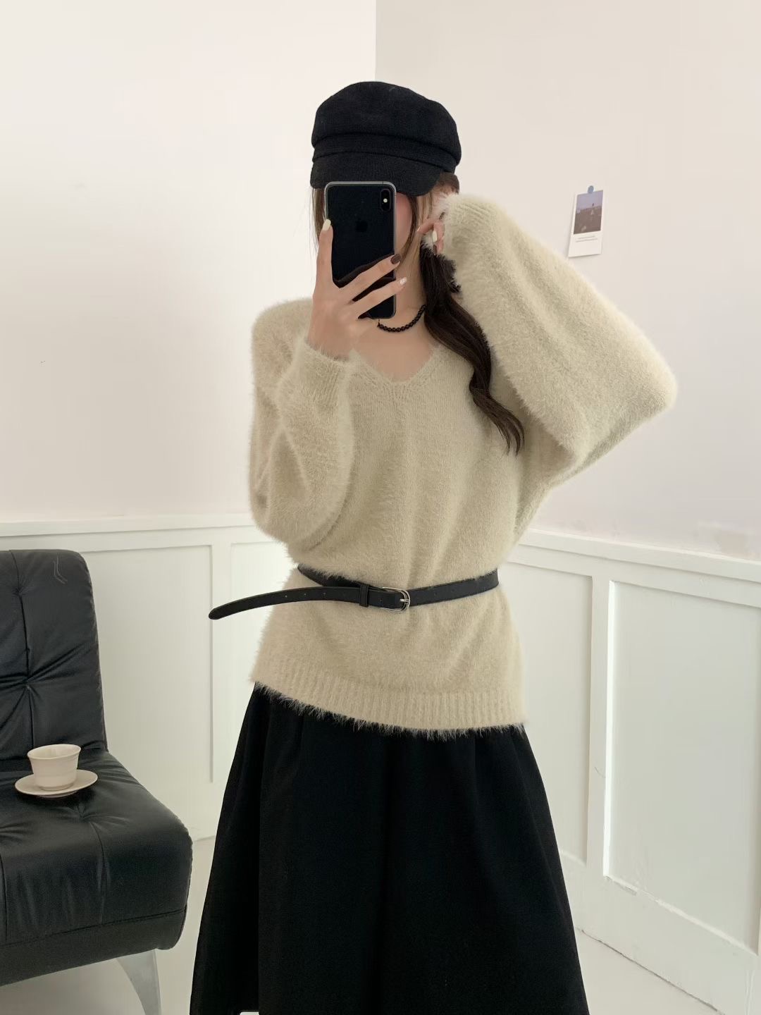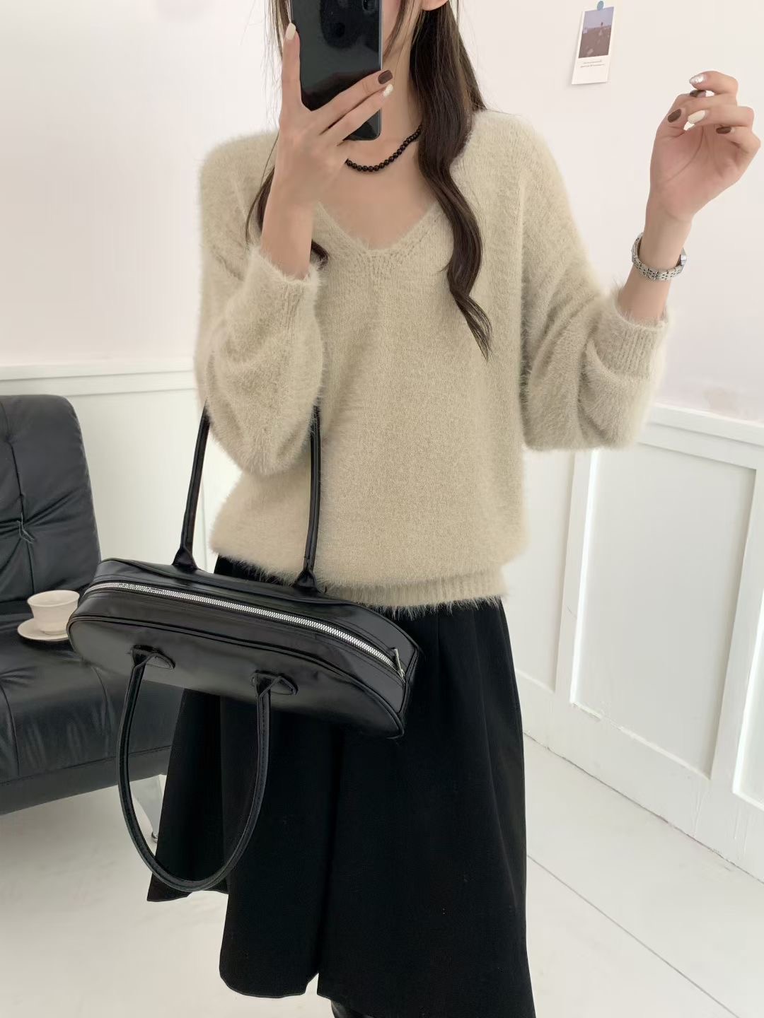 復古咖色V領水貂絨套頭毛衣女秋冬高級感寬松慵懶軟糯針織衫上衣