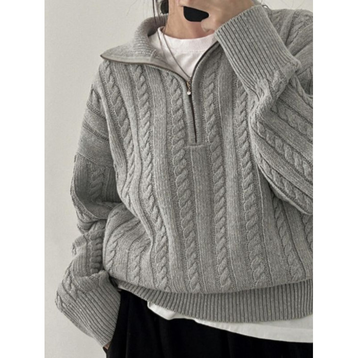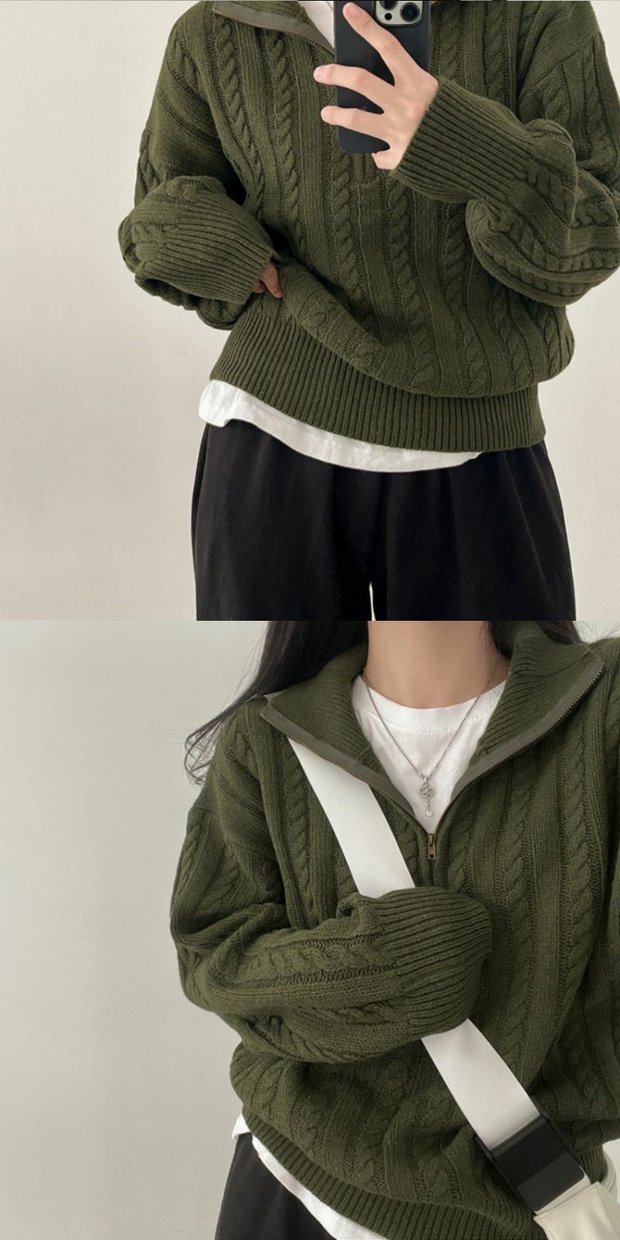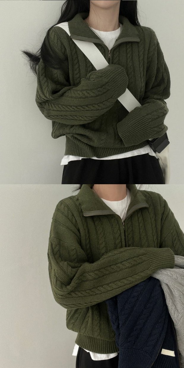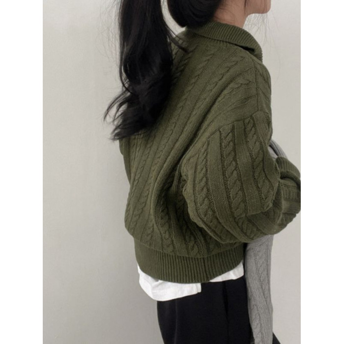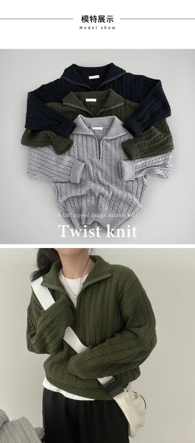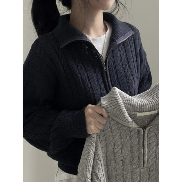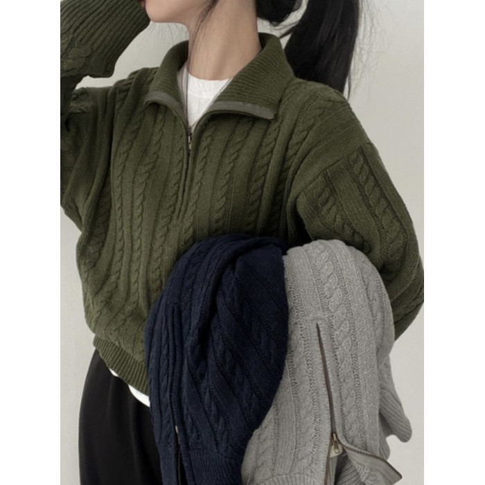 韓國chic秋冬厚實針織上衣女復古麻花半拉鍊慵懶百搭短款毛衣外套
