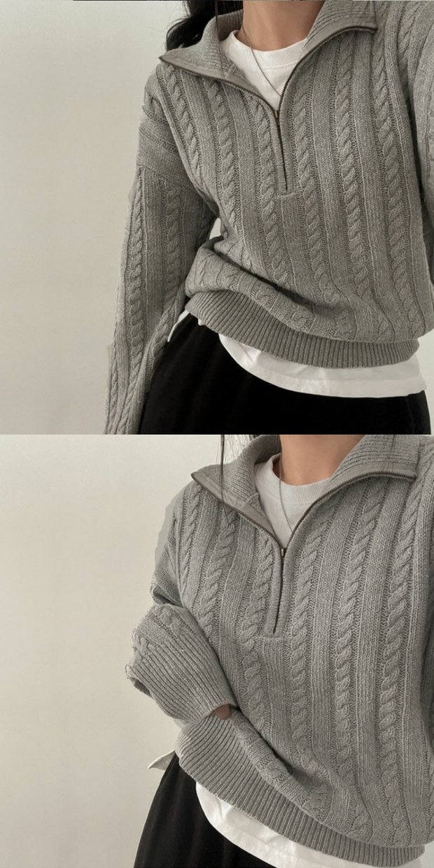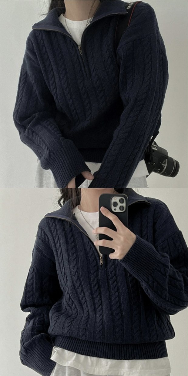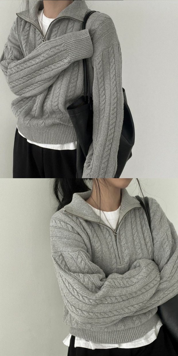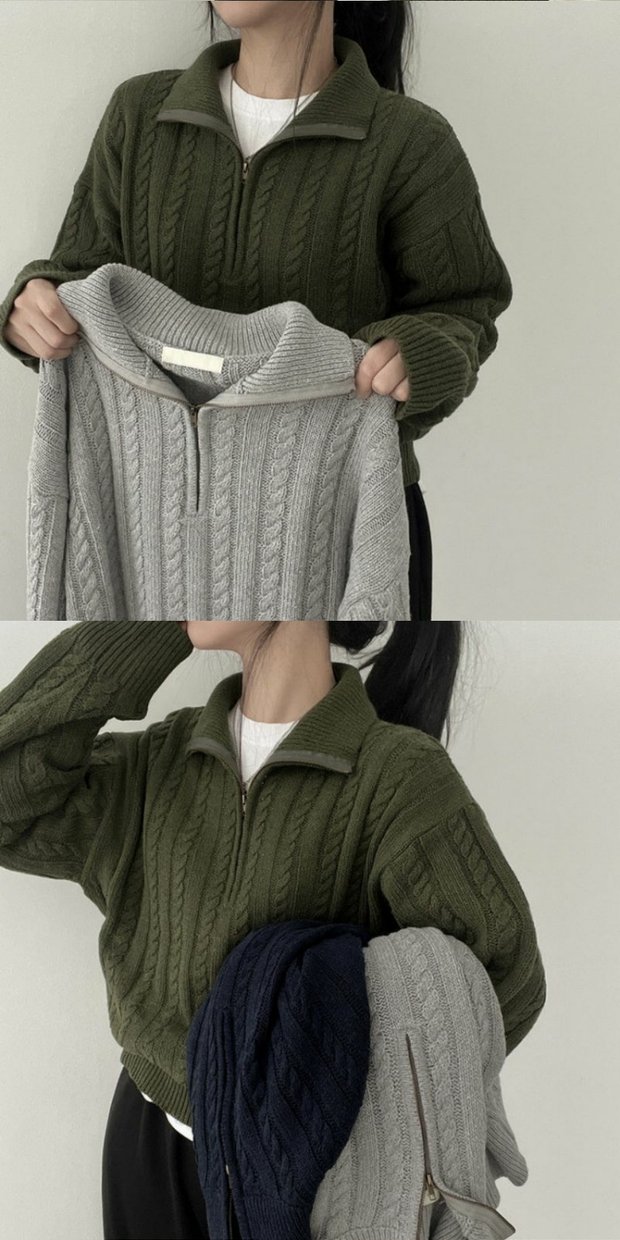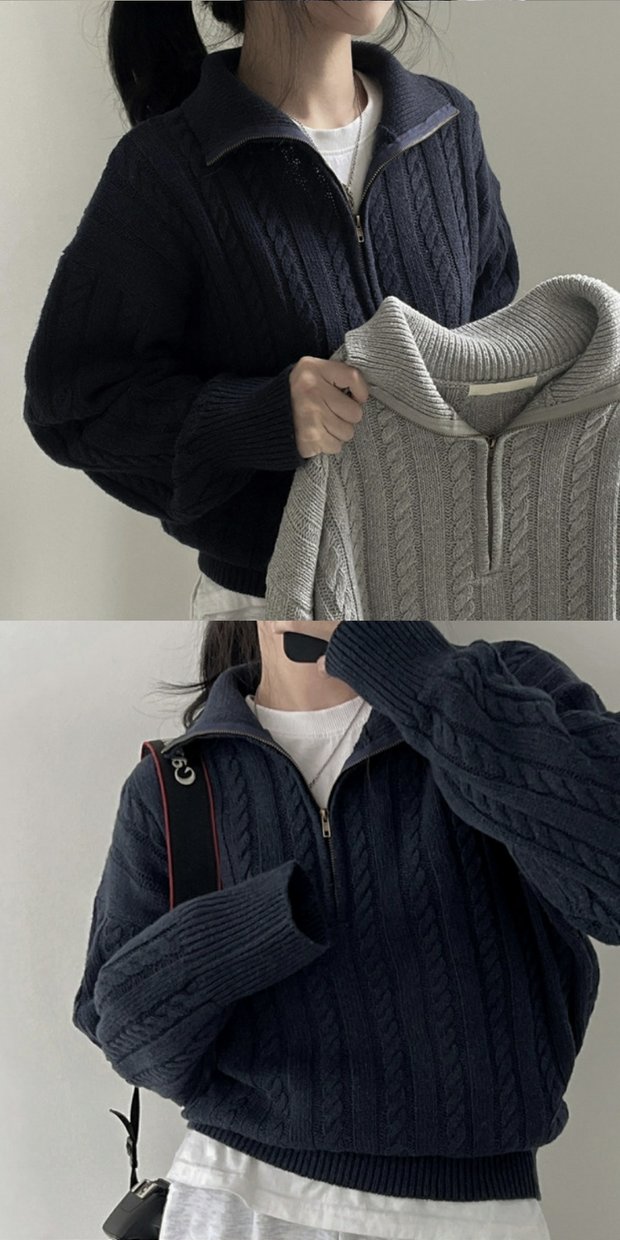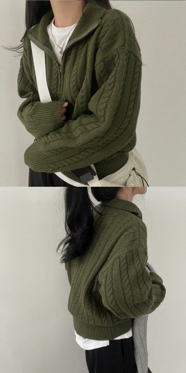 韓國chic秋冬厚實針織上衣女復古麻花半拉鍊慵懶百搭短款毛衣外套
