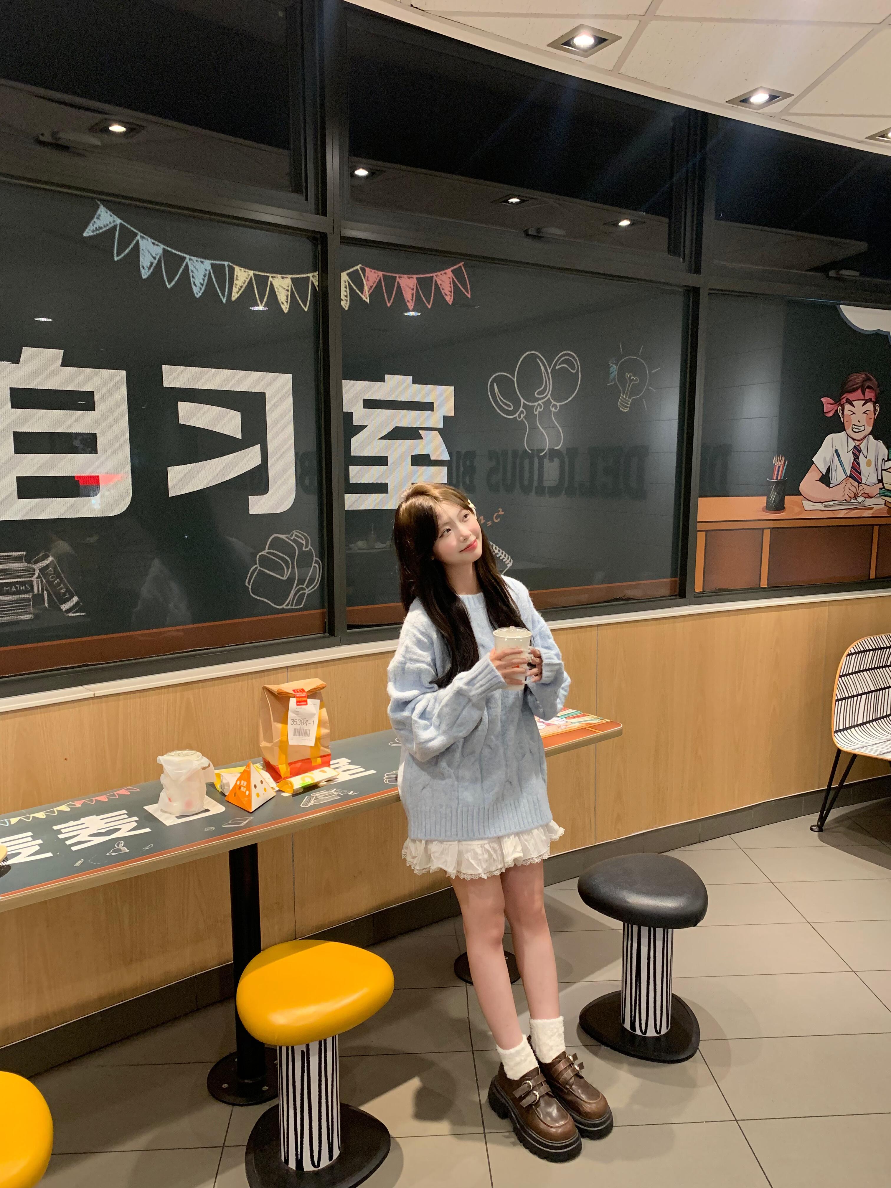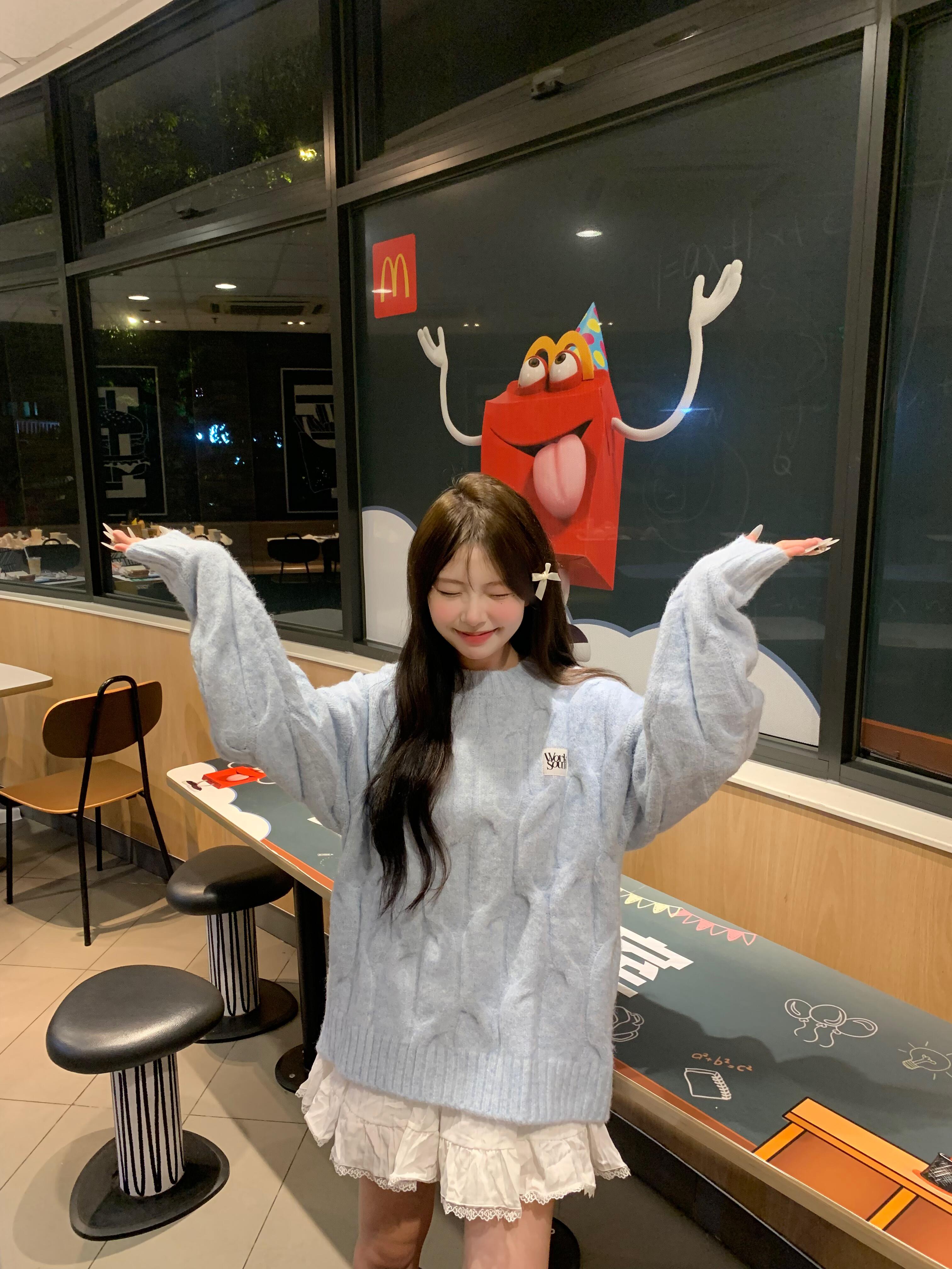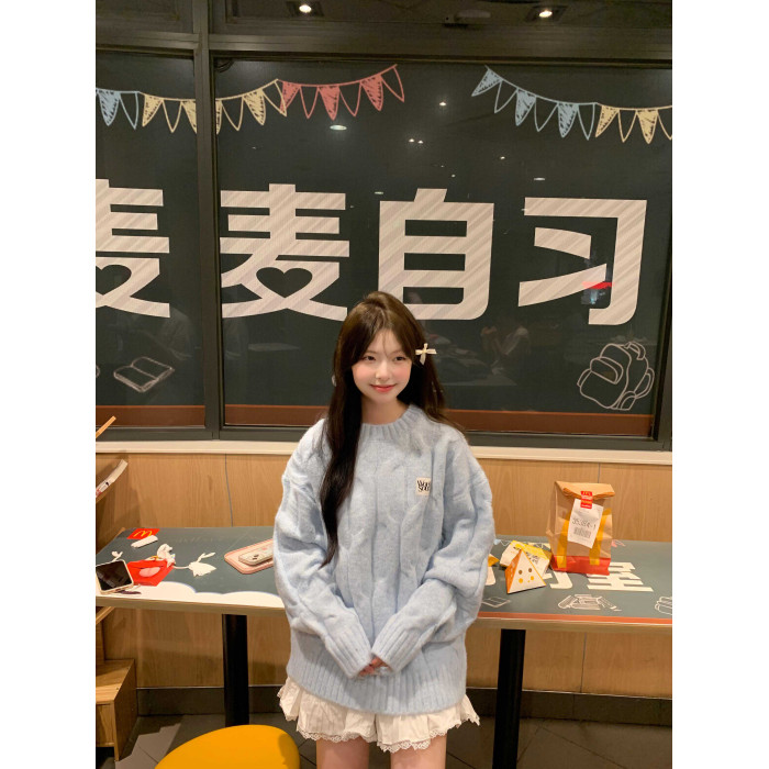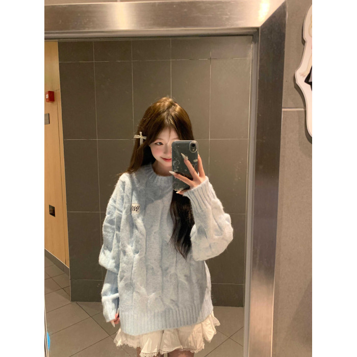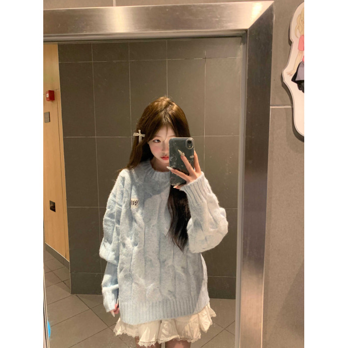 藍色麻花套頭針織毛衣女冬季穿搭慵懶加厚正肩內搭針織衫上衣秋冬