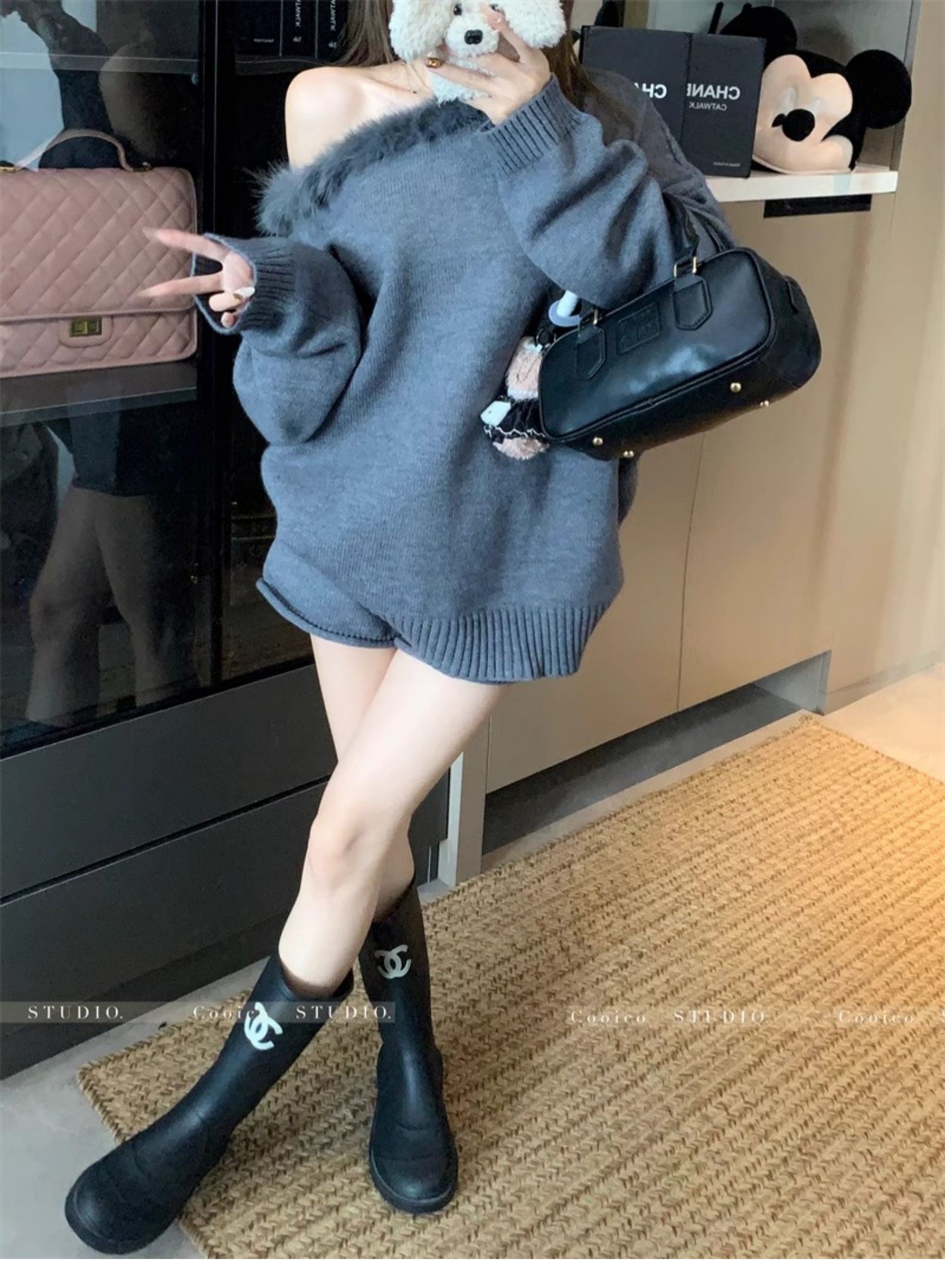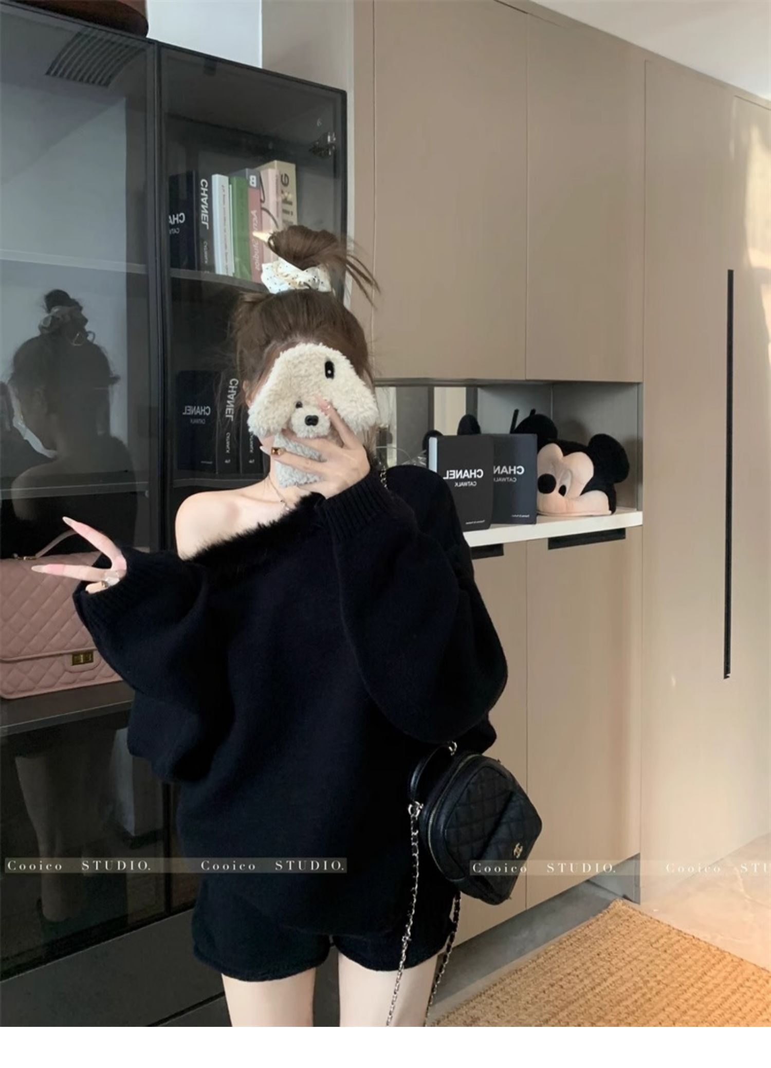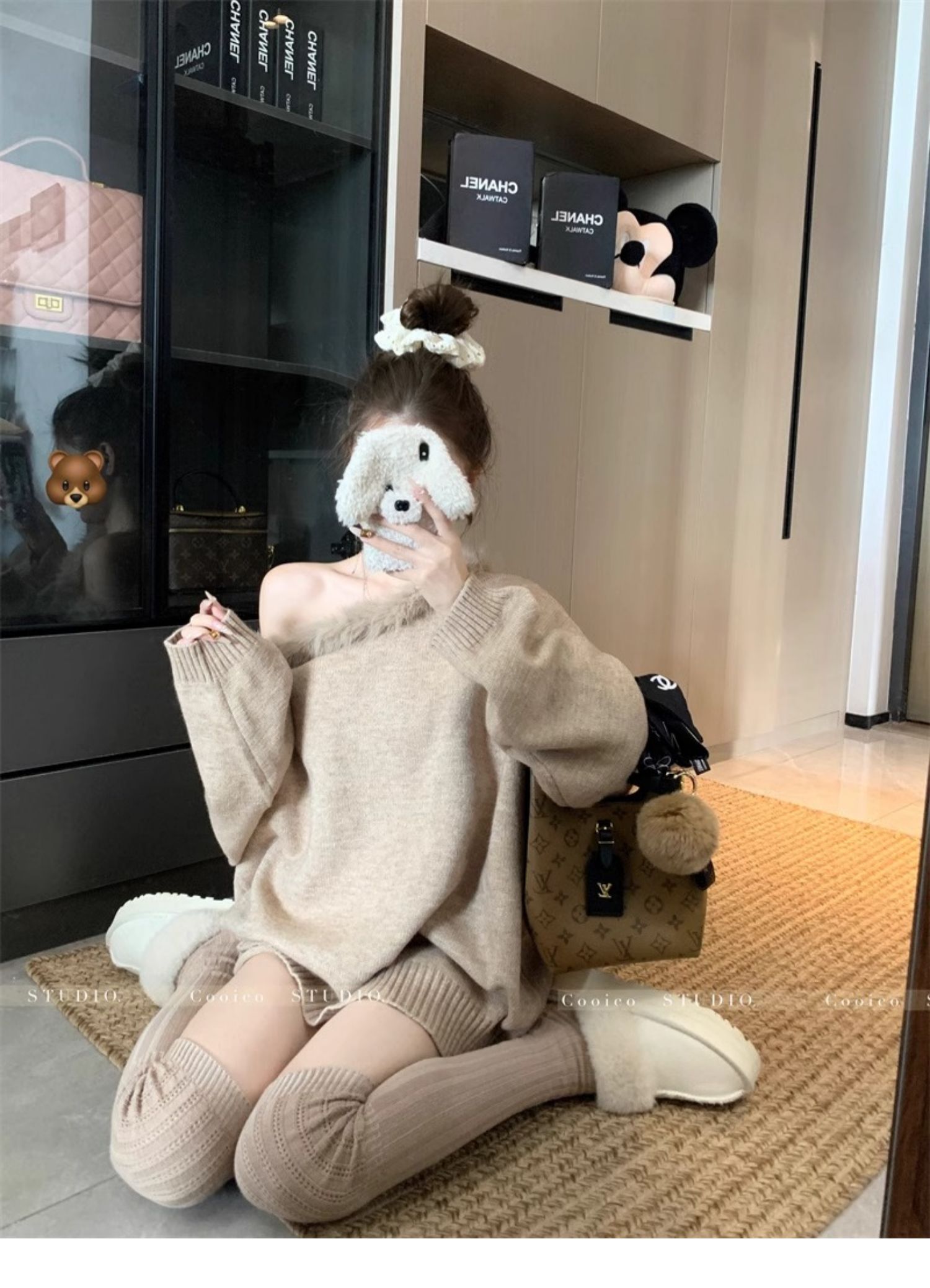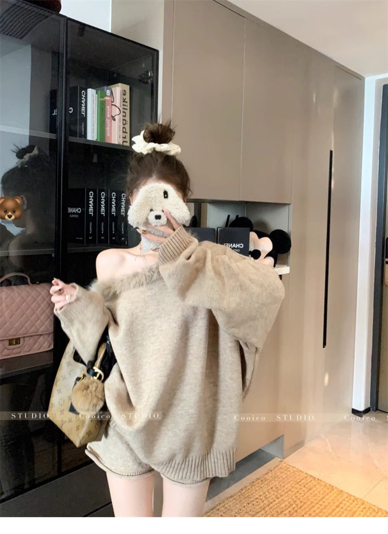 美拉德毛絨拼接斜領露肩毛衣女秋冬獨特慵懶松弛感寬松洋氣針織衫