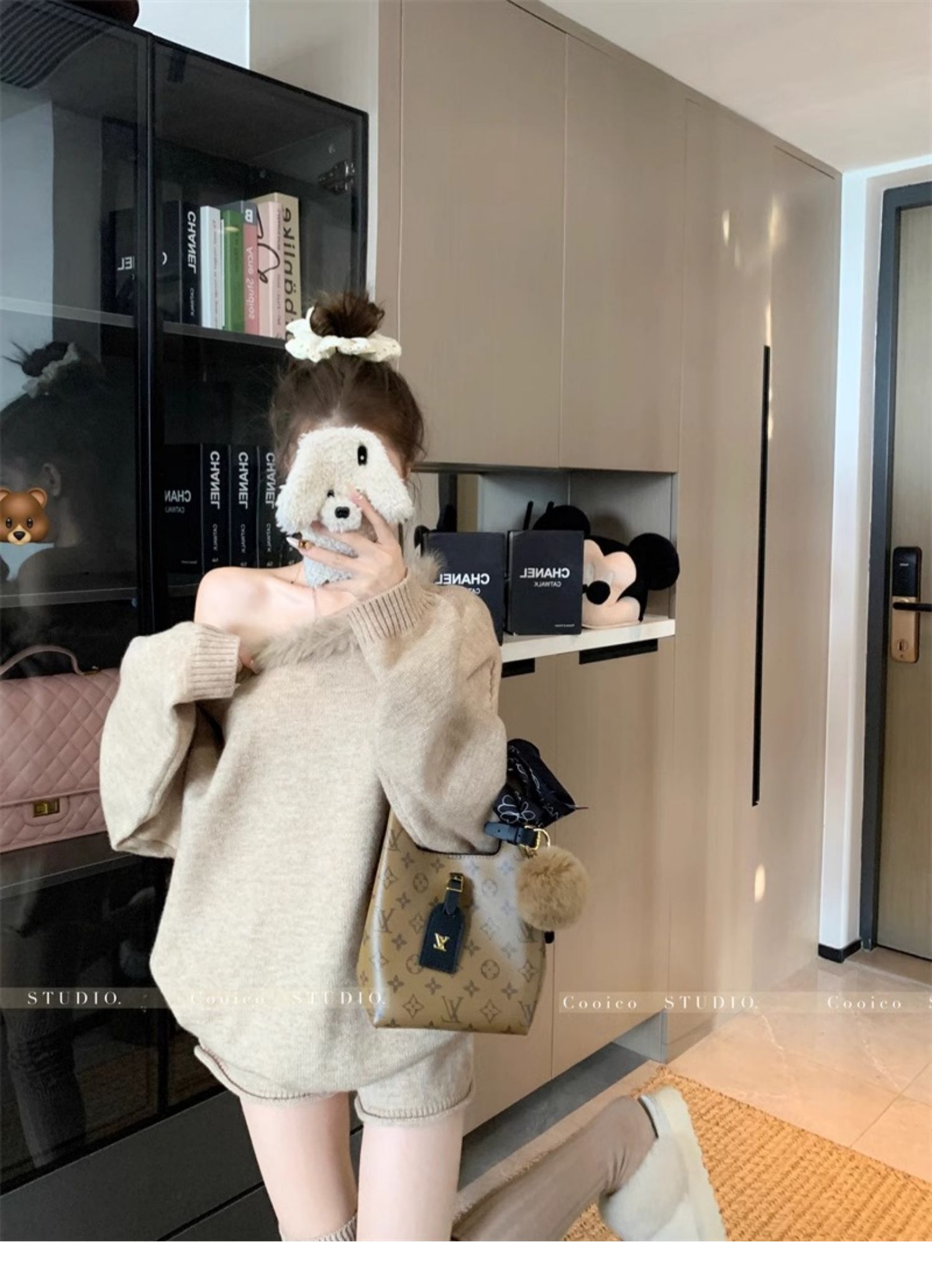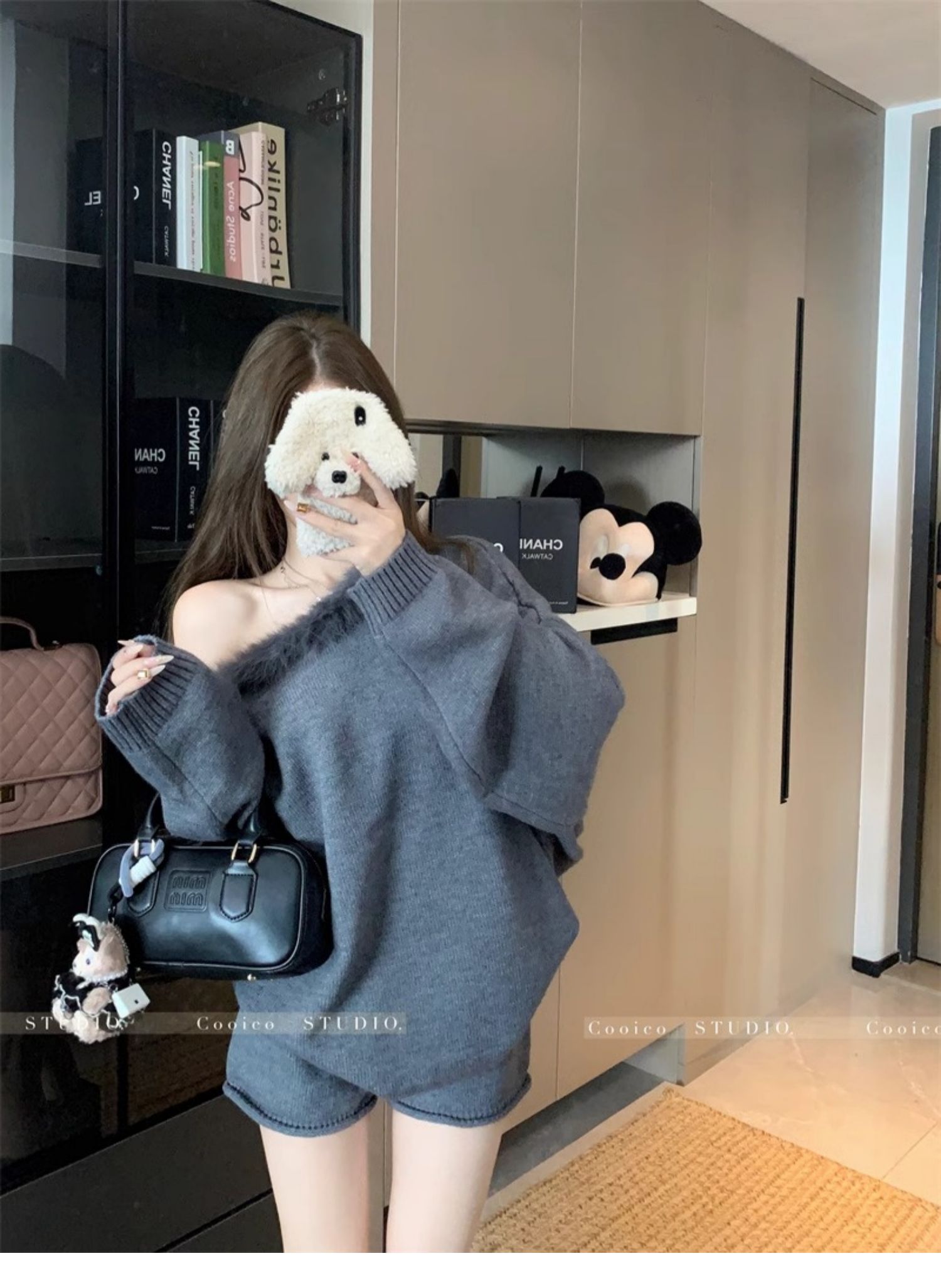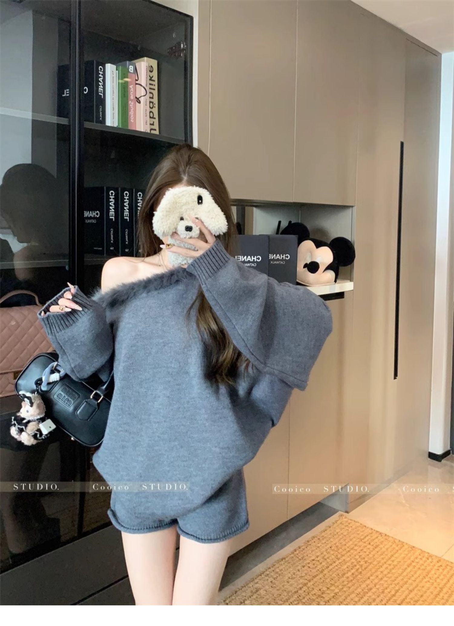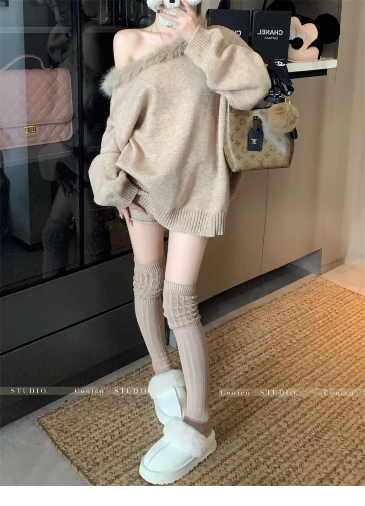 美拉德毛絨拼接斜領露肩毛衣女秋冬獨特慵懶松弛感寬松洋氣針織衫