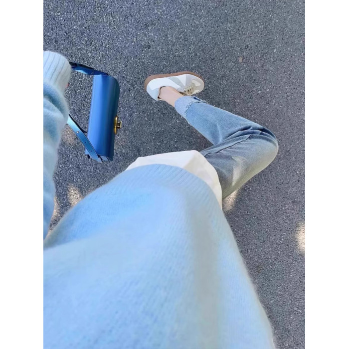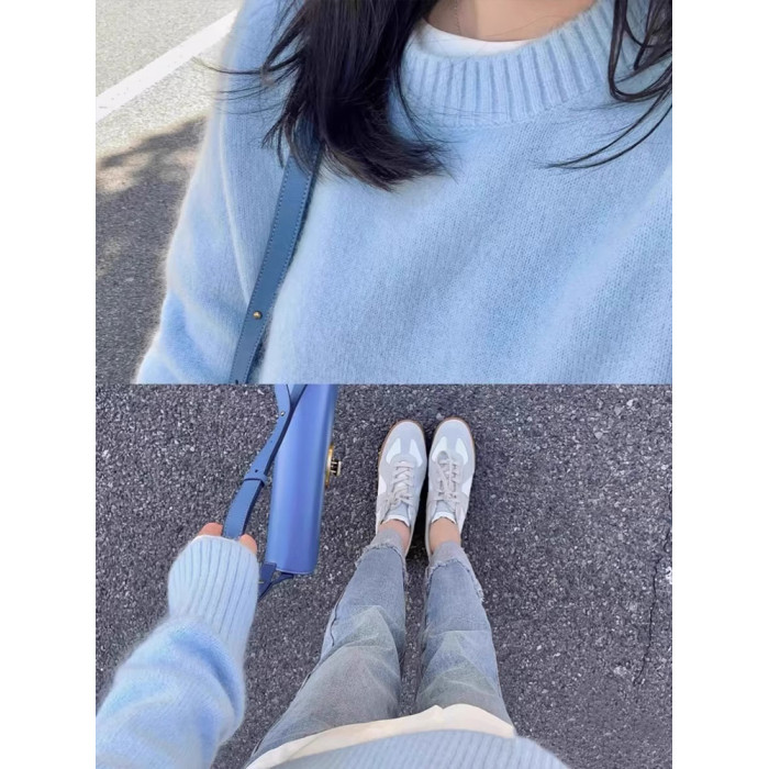 藍色圓領套頭毛衣女秋冬加厚內搭小個子軟糯針織衫寬松慵懶風上衣