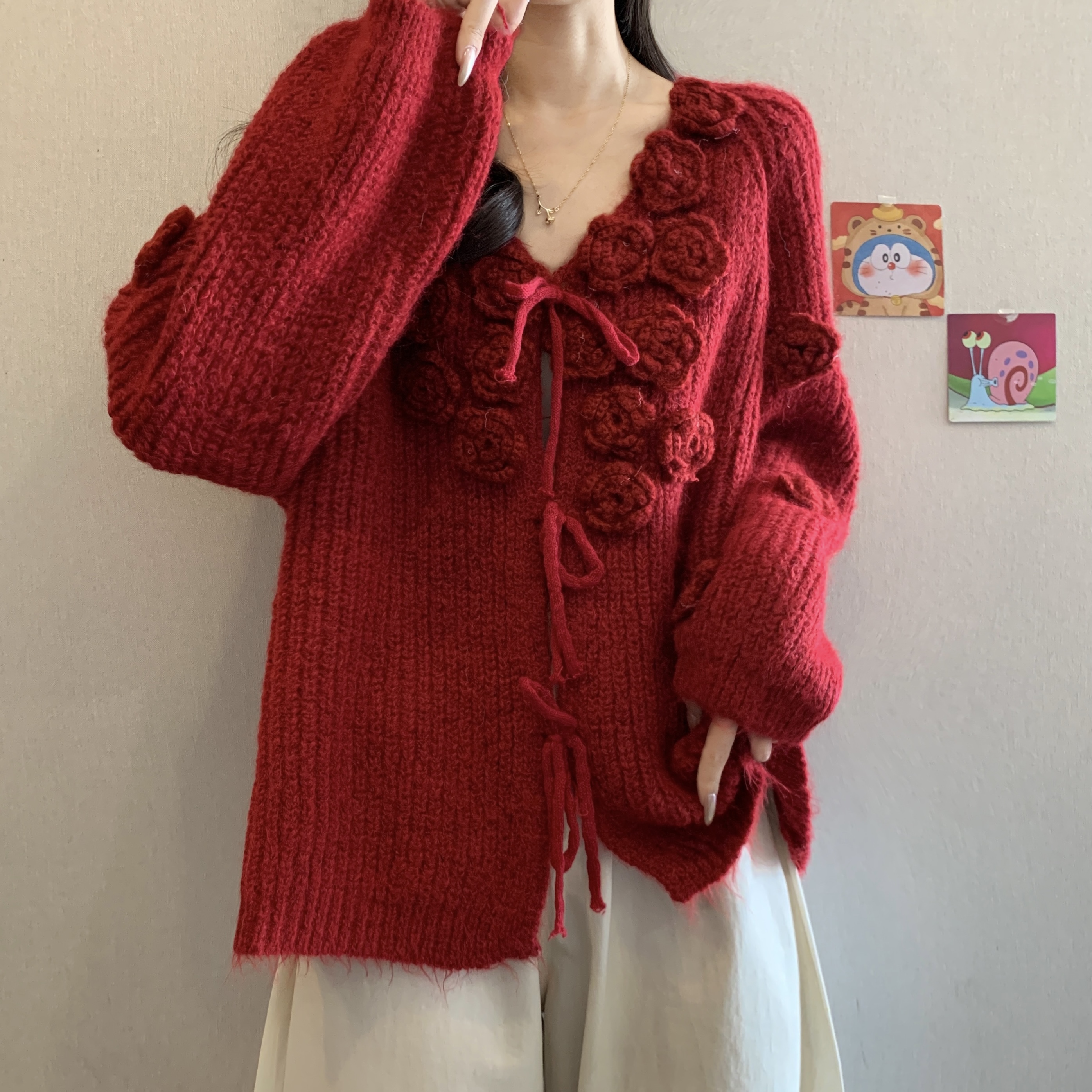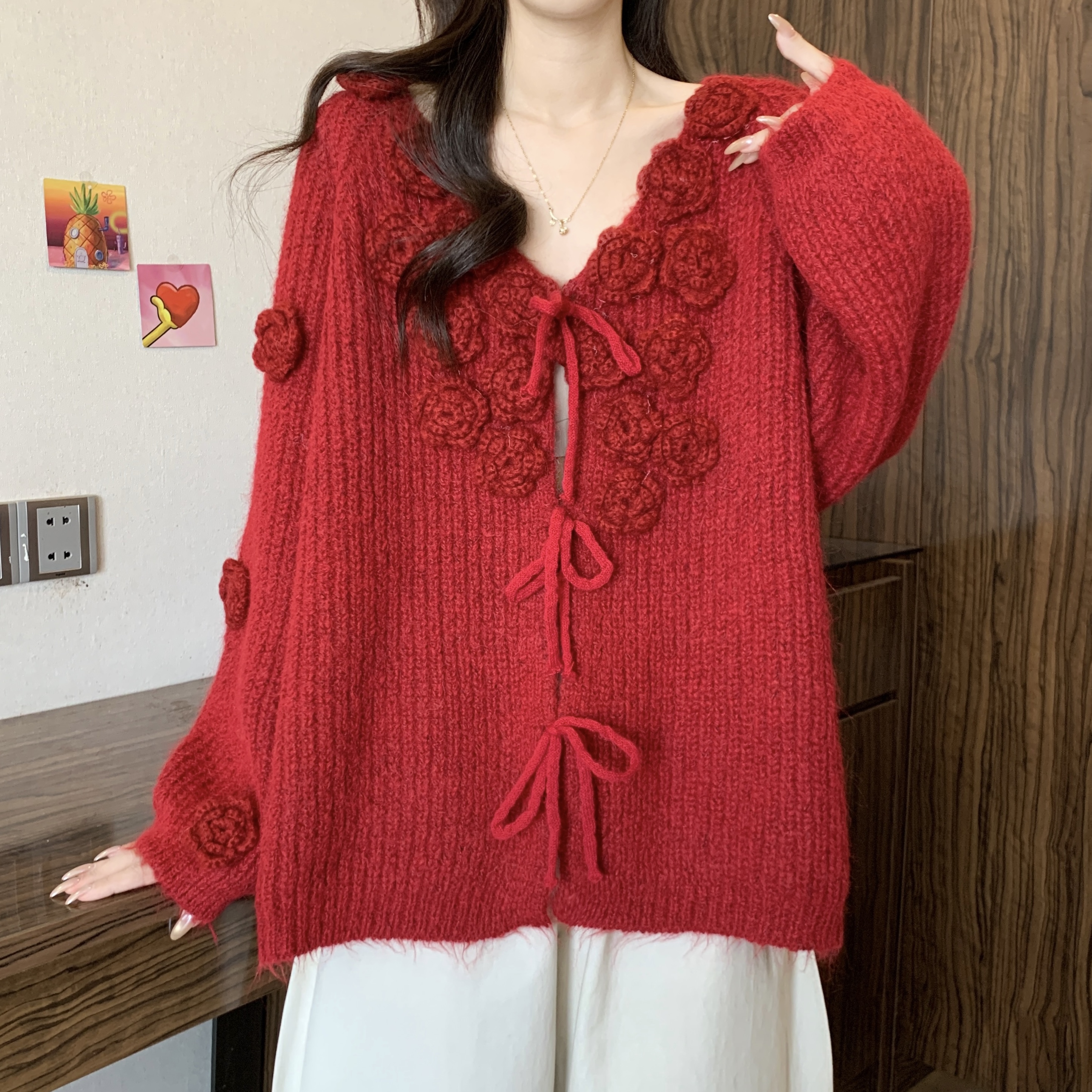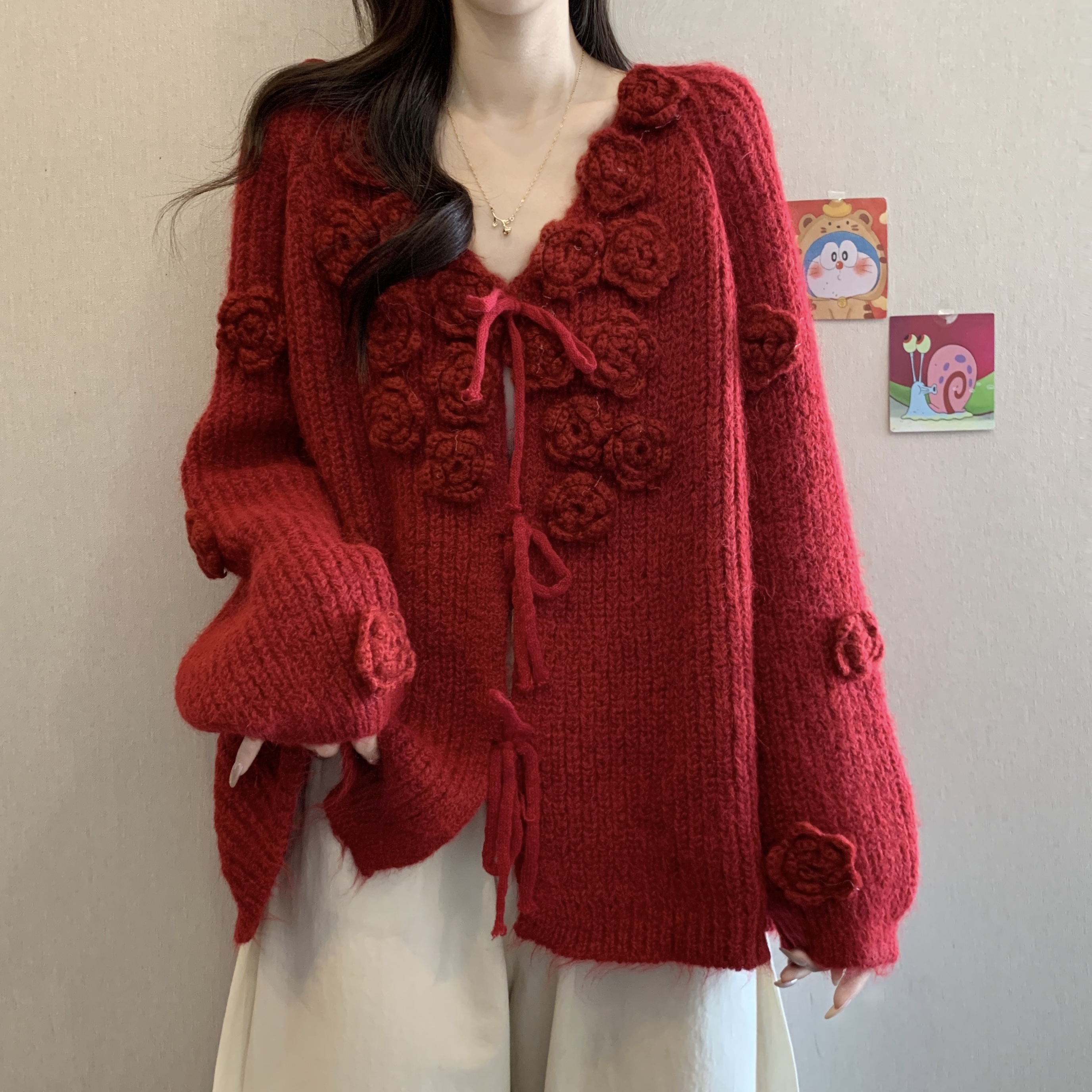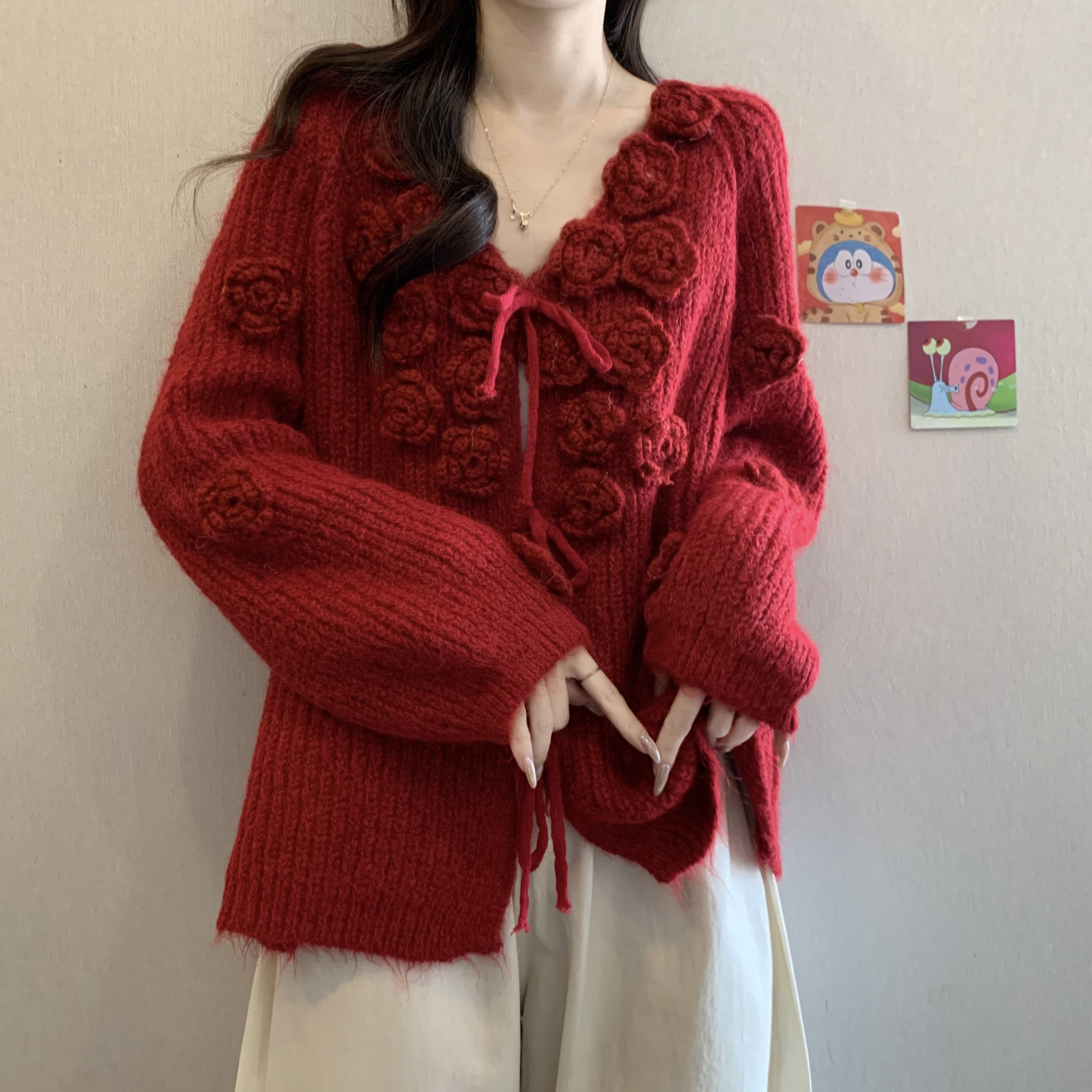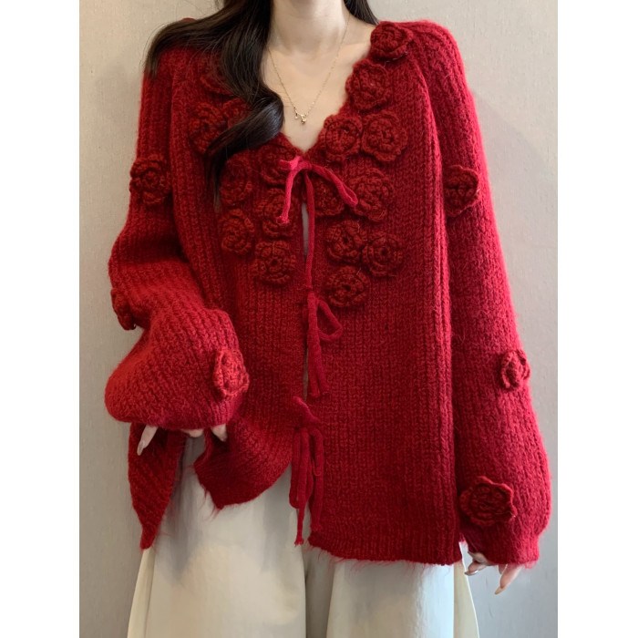 紅色立體花朵毛衣外套女2025秋冬大碼胖mm巨好看針織開衫聖誕上衣