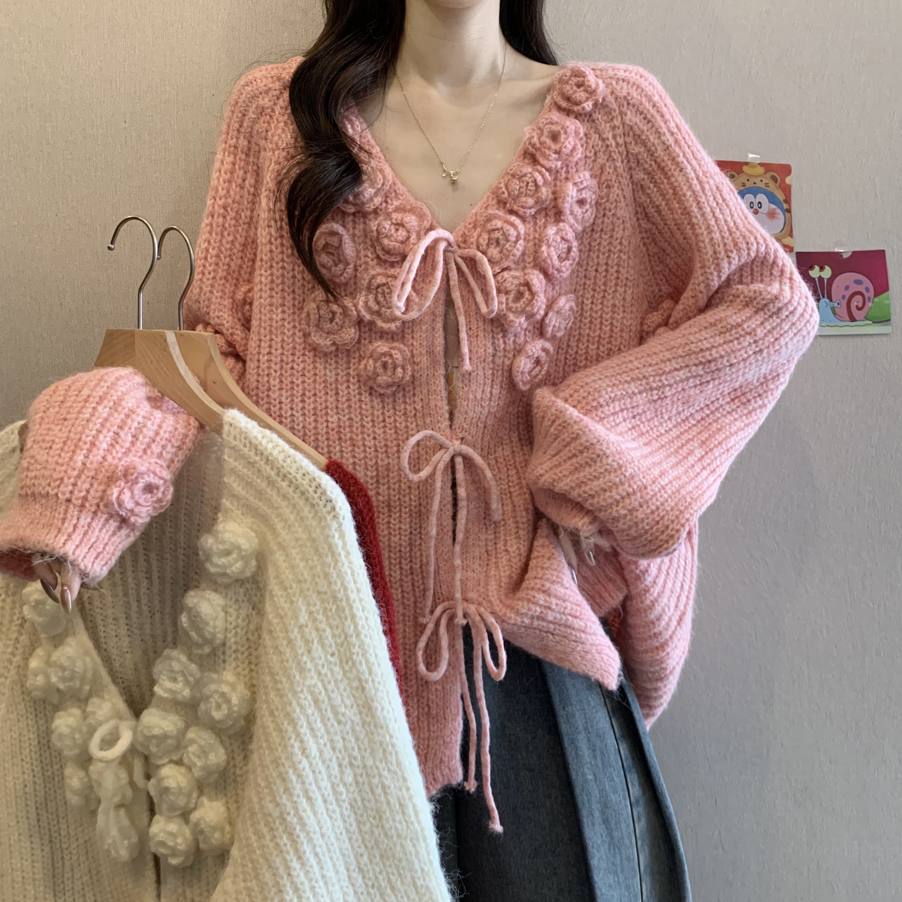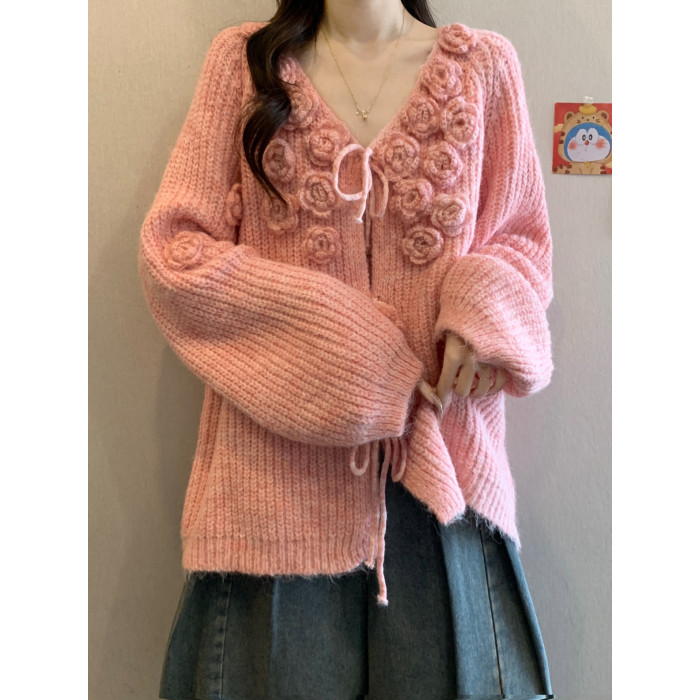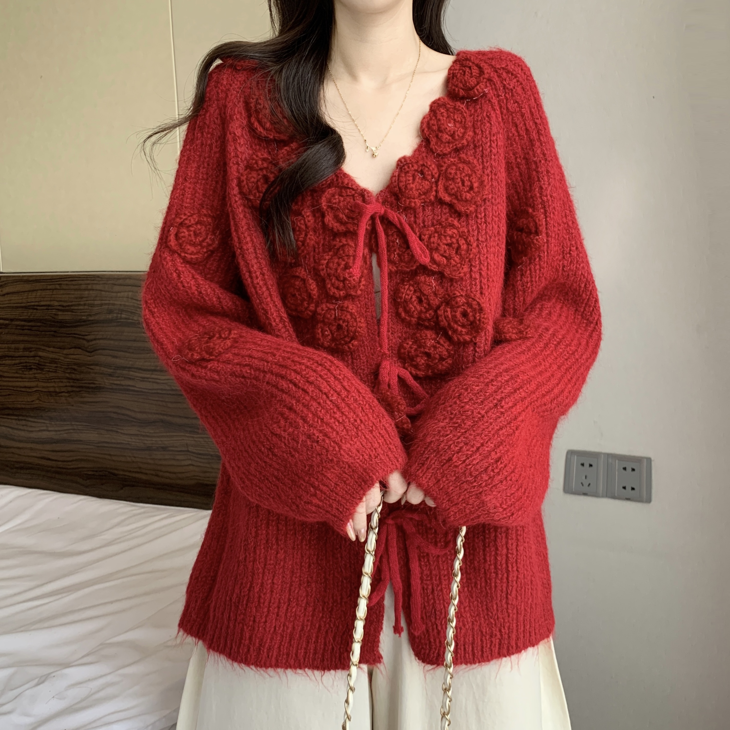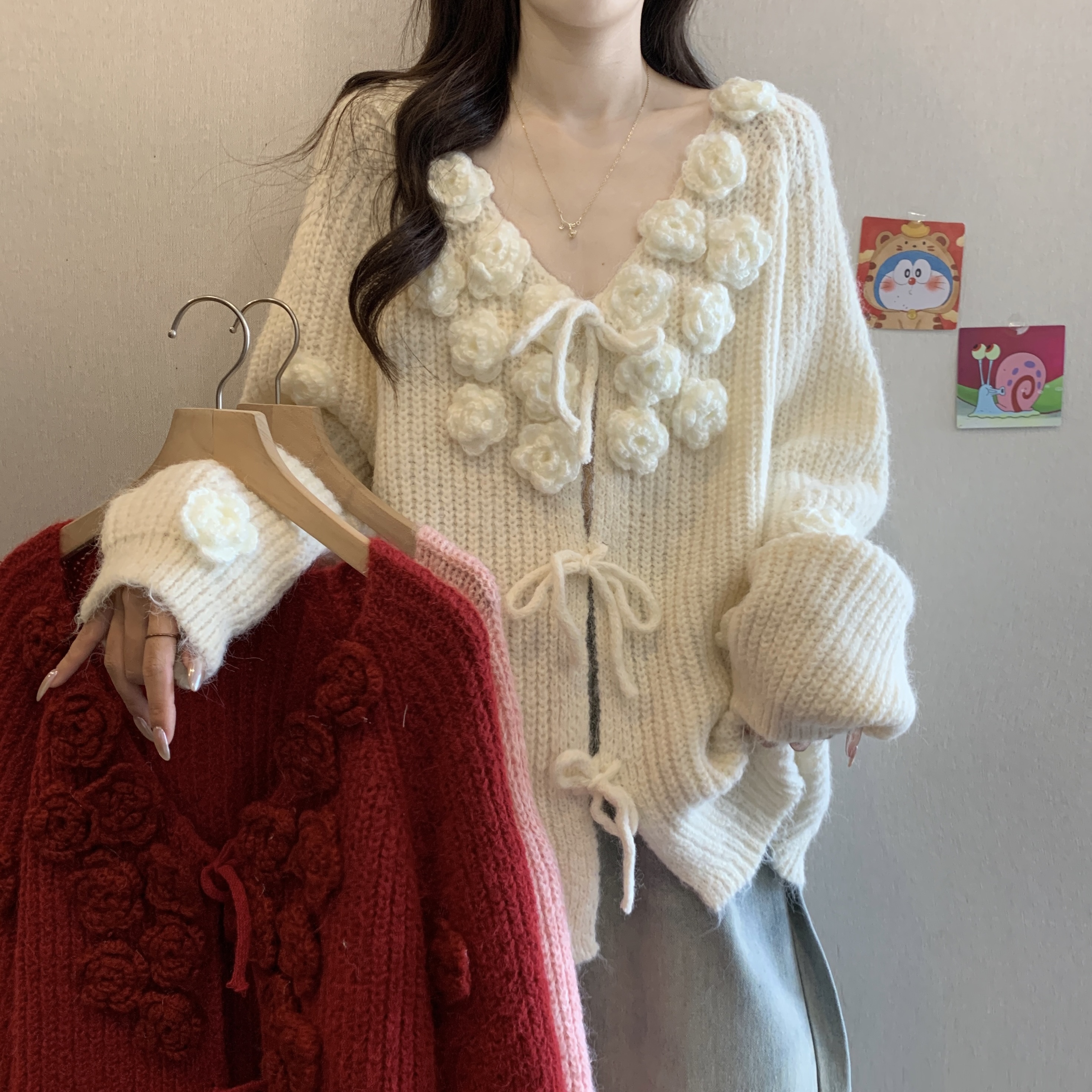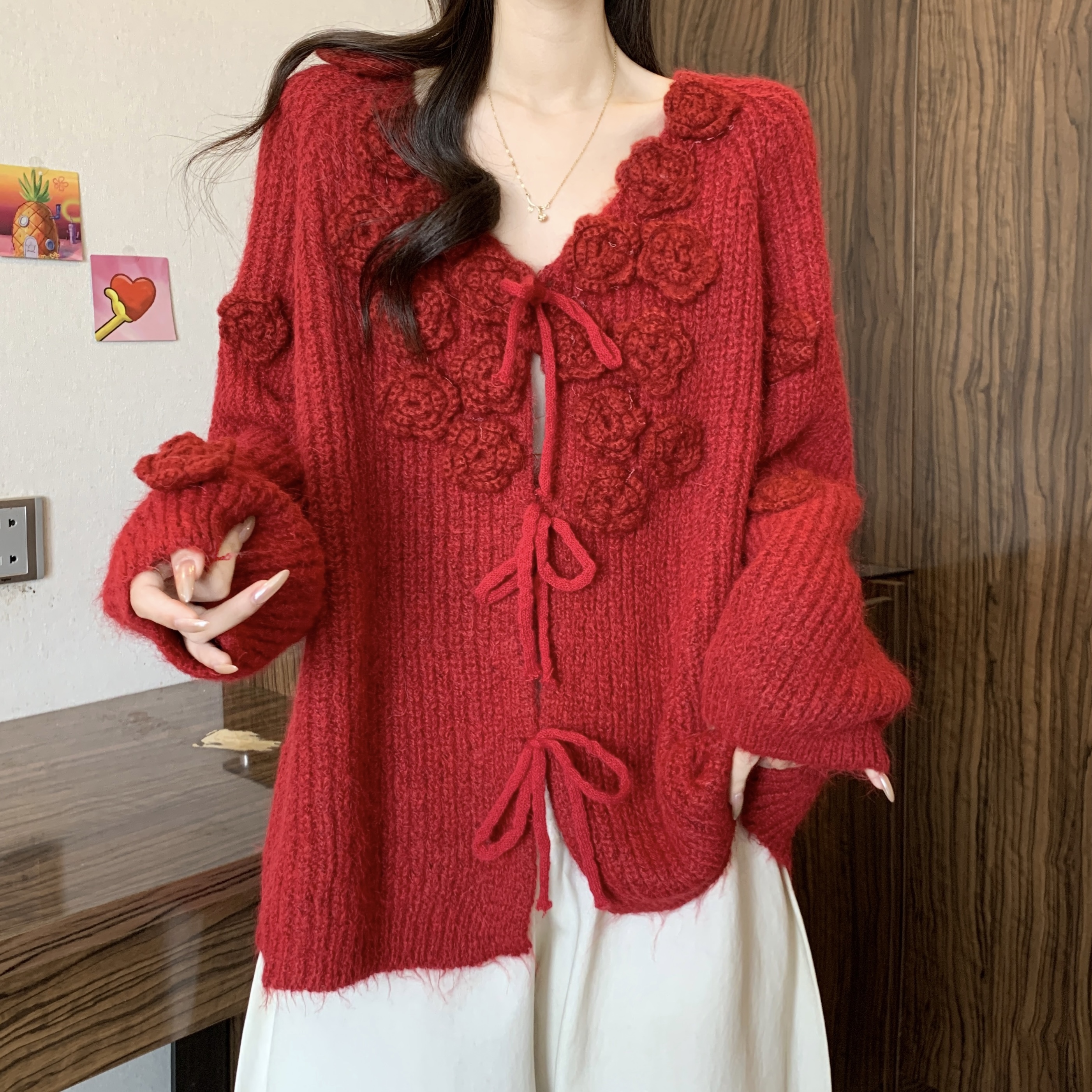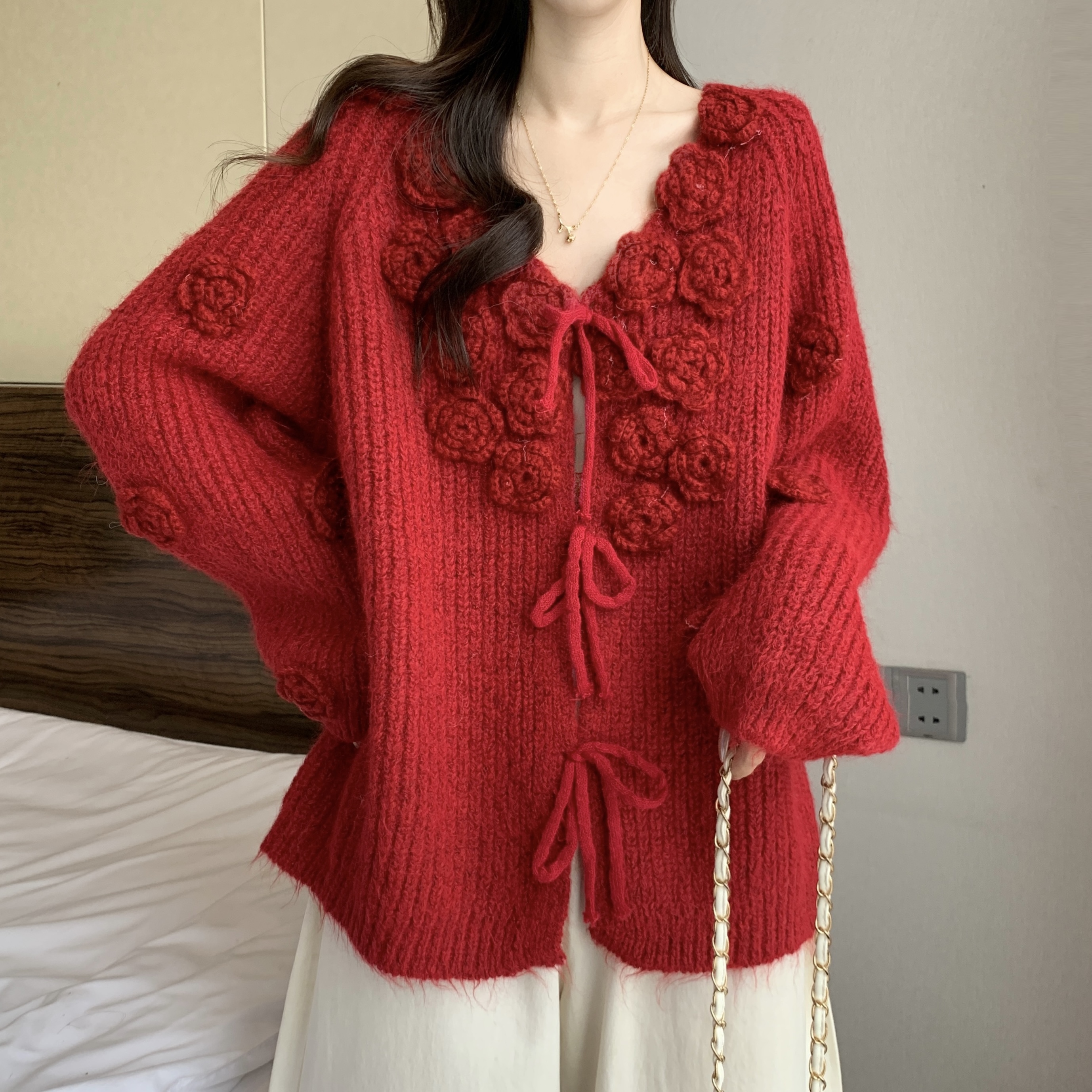 紅色立體花朵毛衣外套女2025秋冬大碼胖mm巨好看針織開衫聖誕上衣