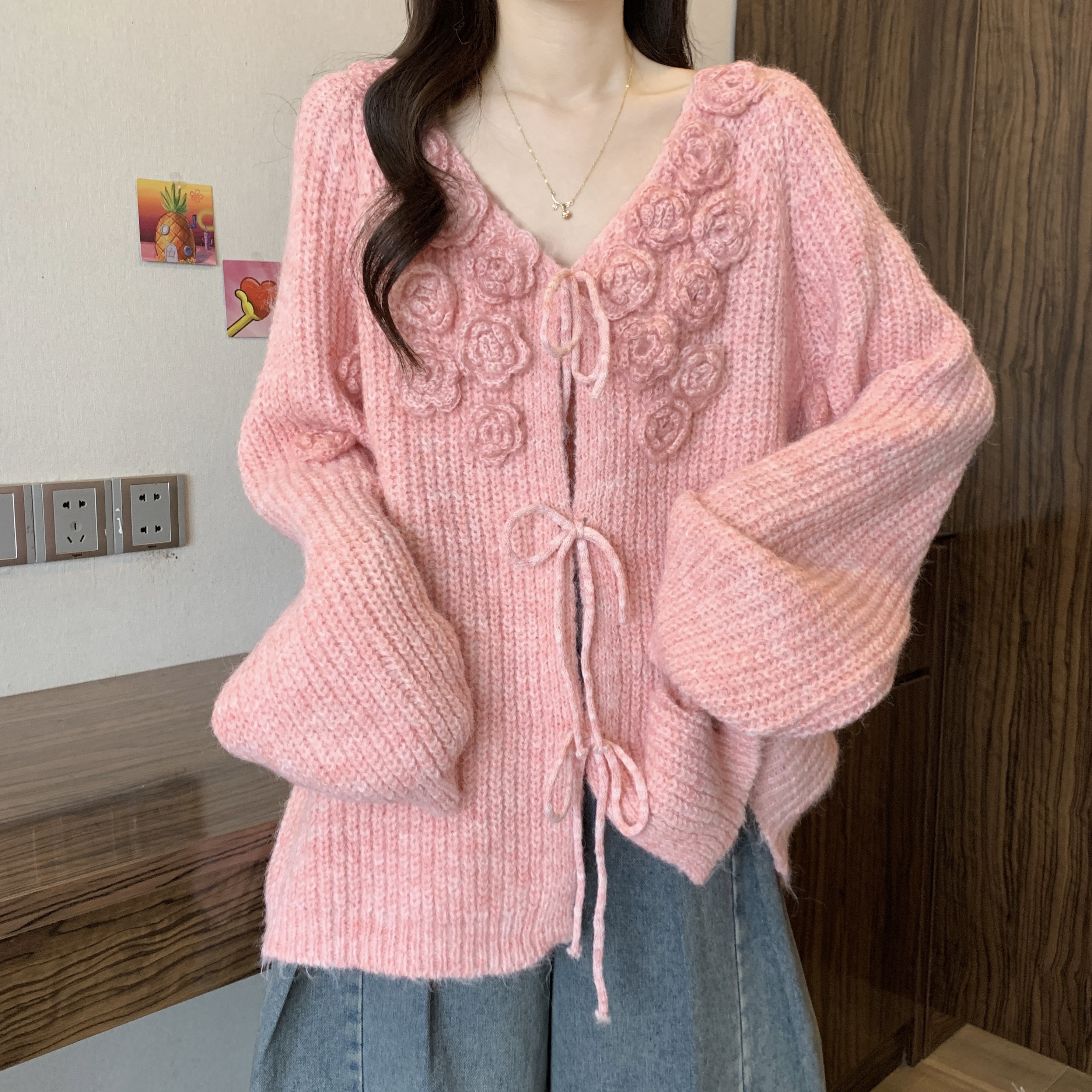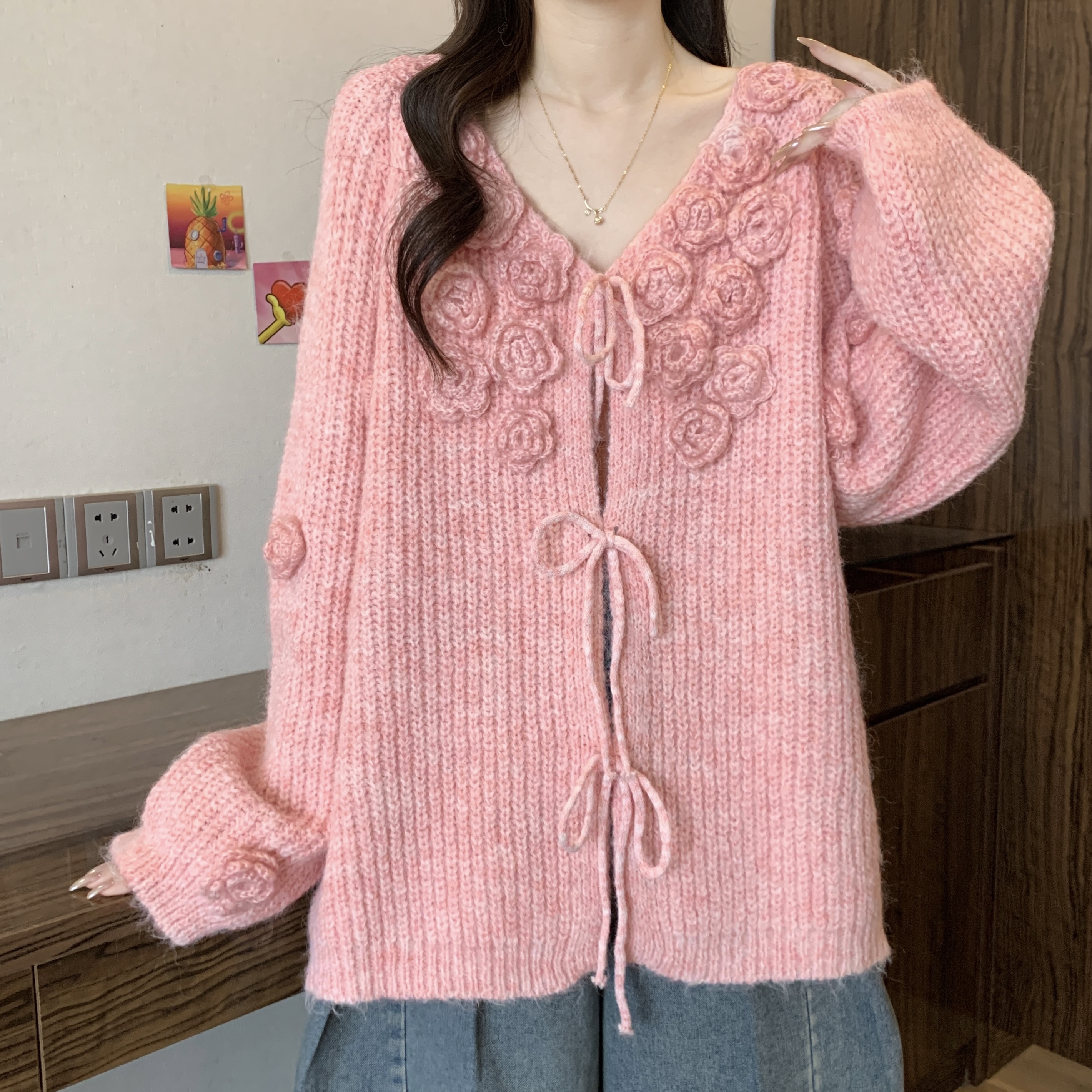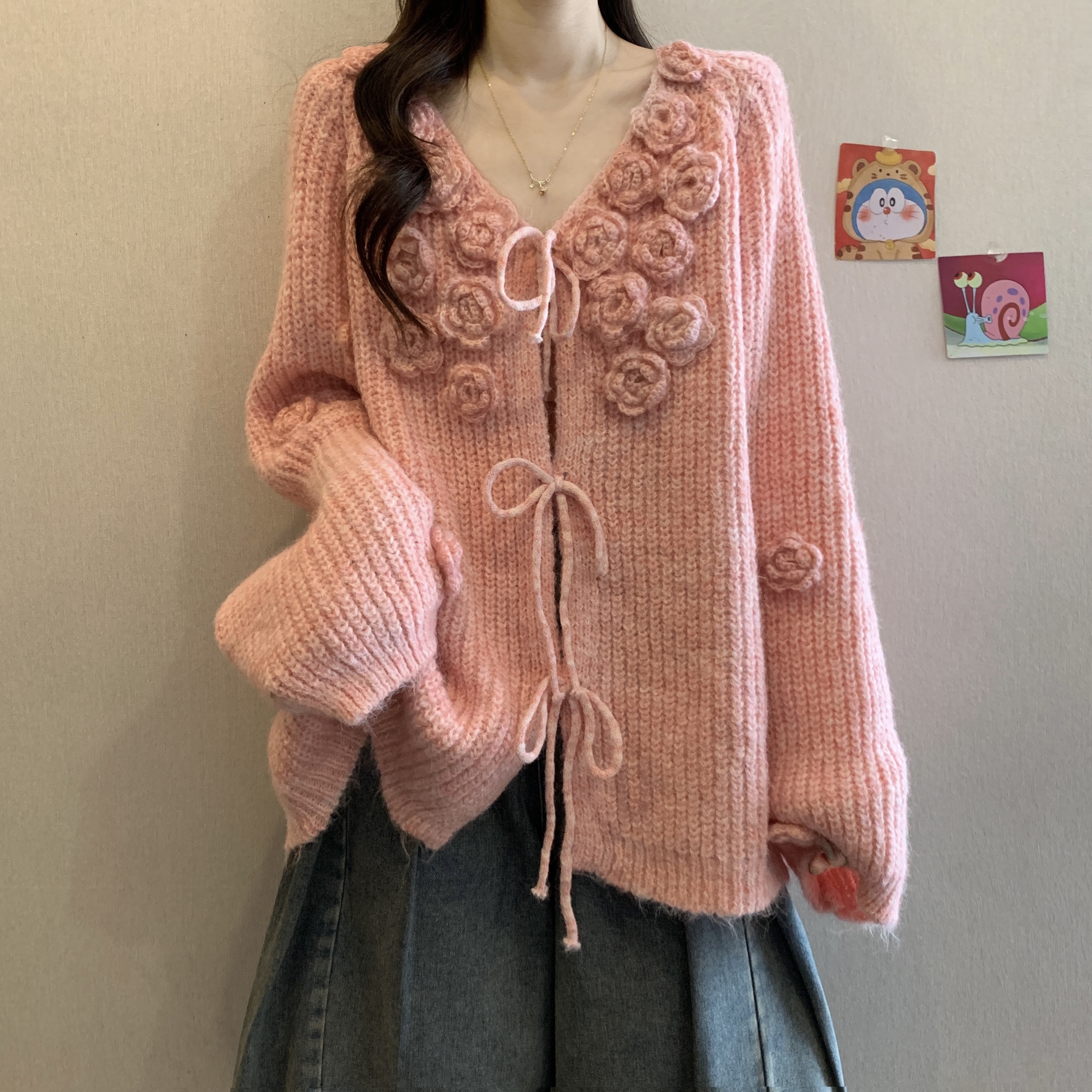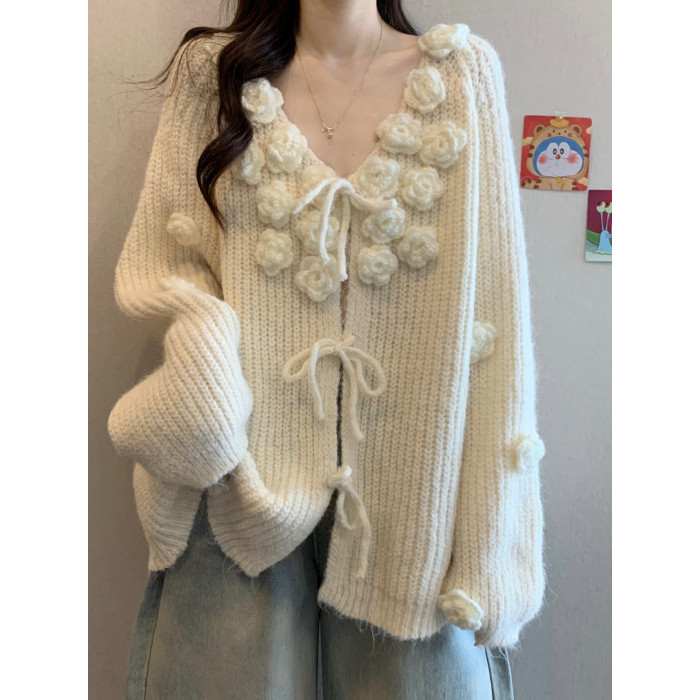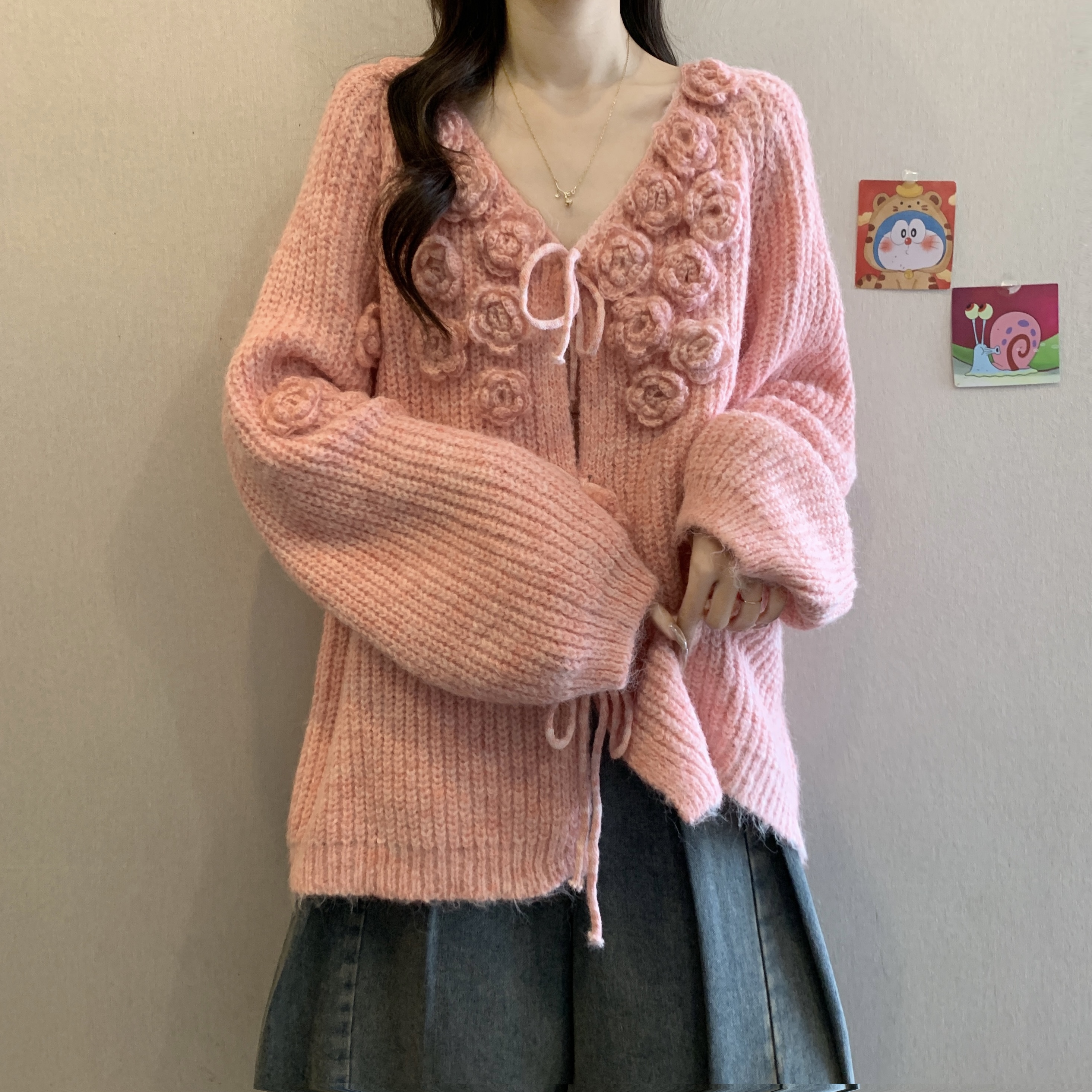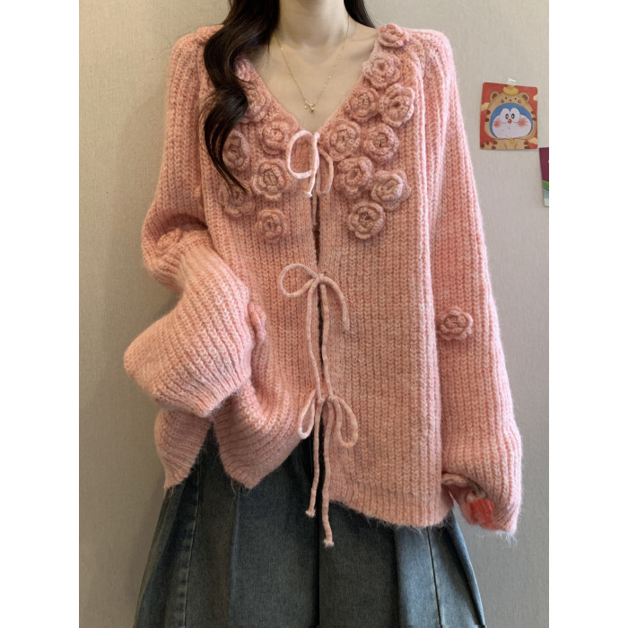 紅色立體花朵毛衣外套女2025秋冬大碼胖mm巨好看針織開衫聖誕上衣