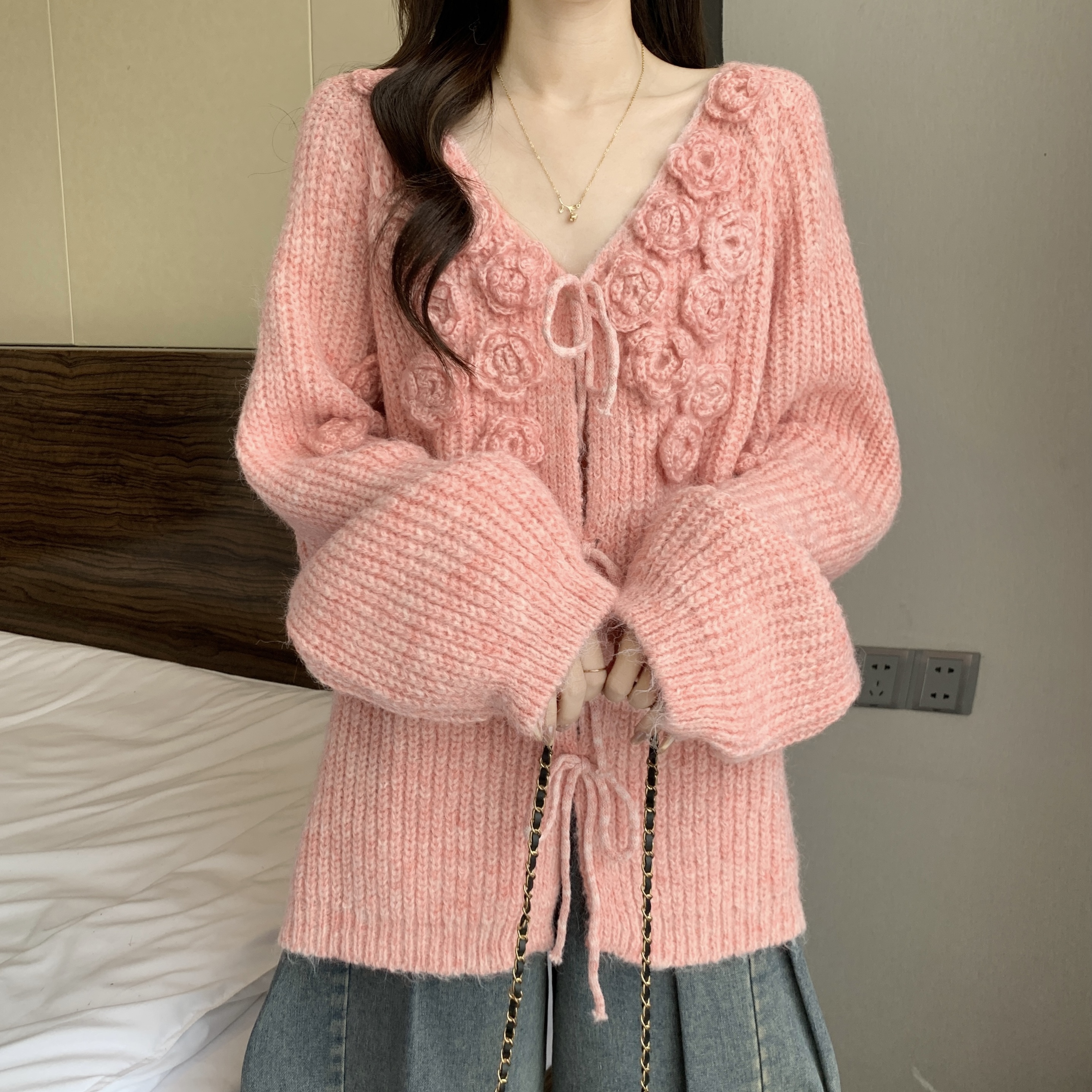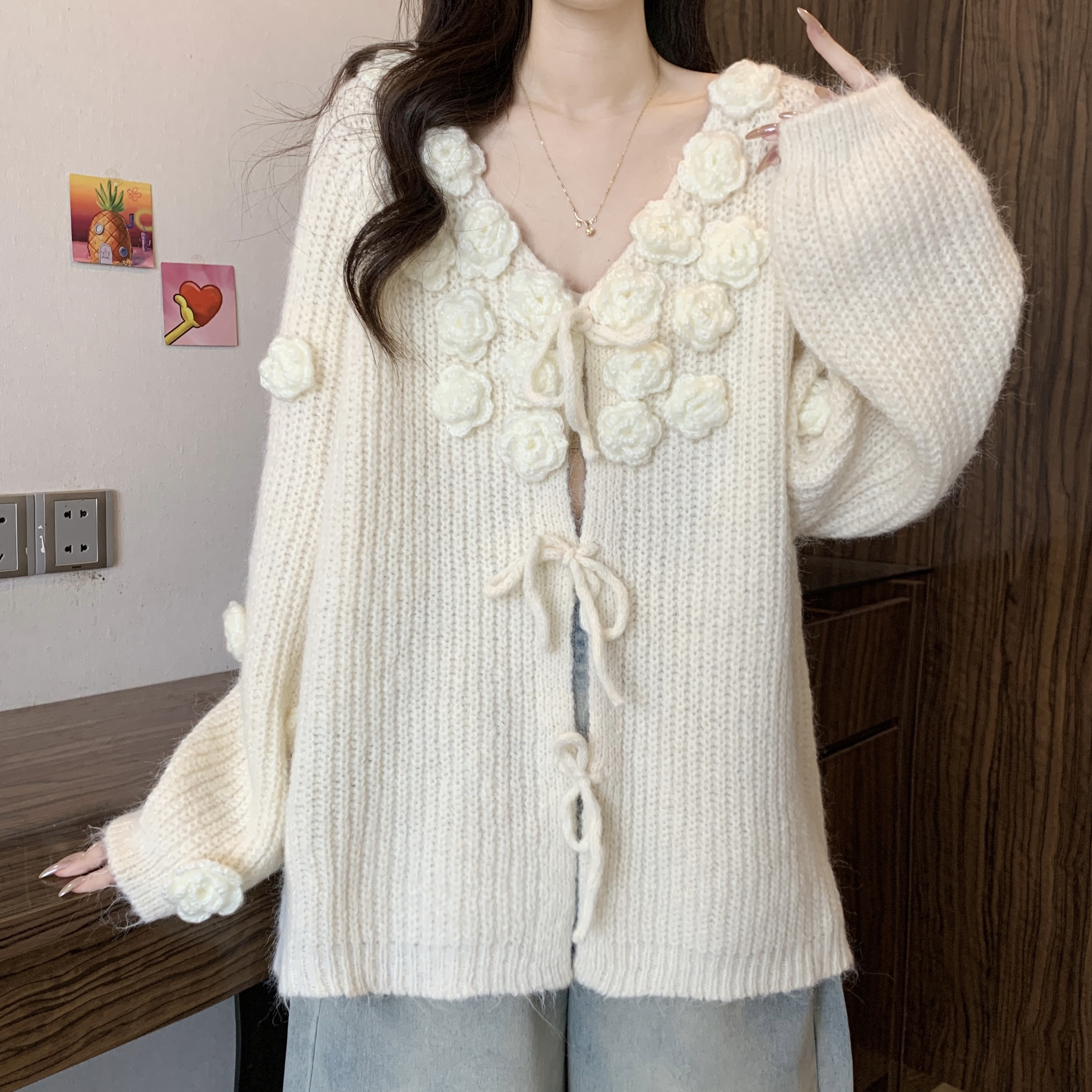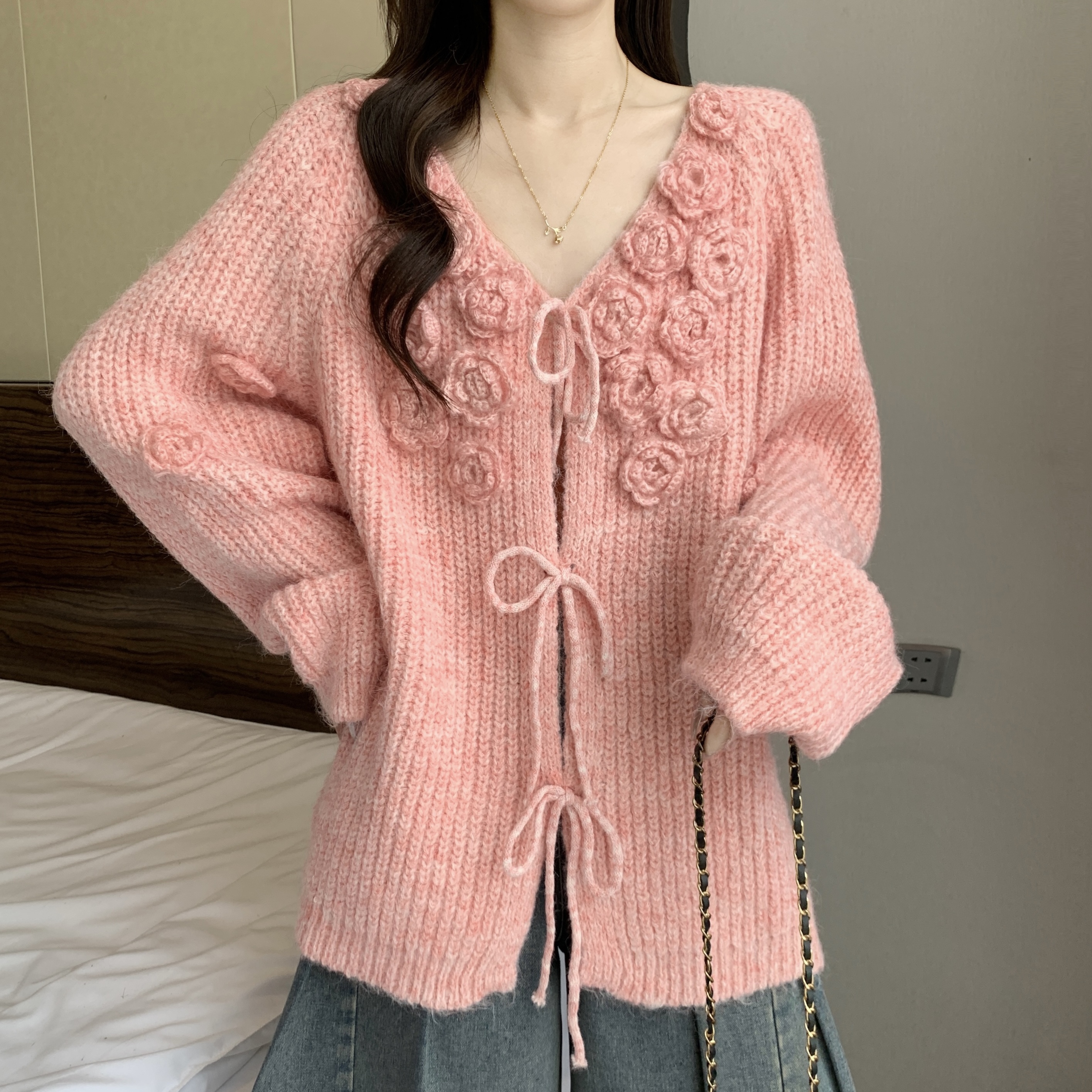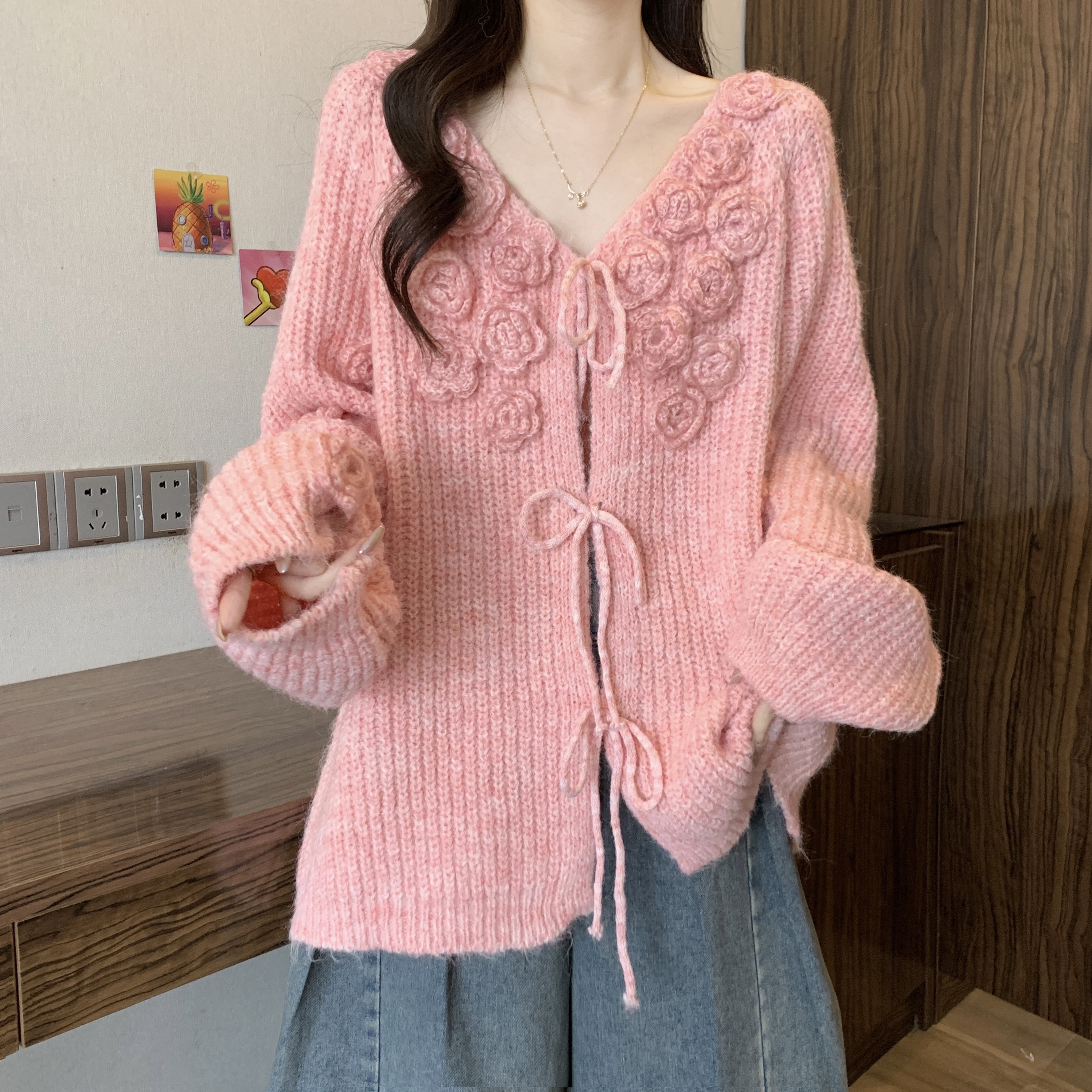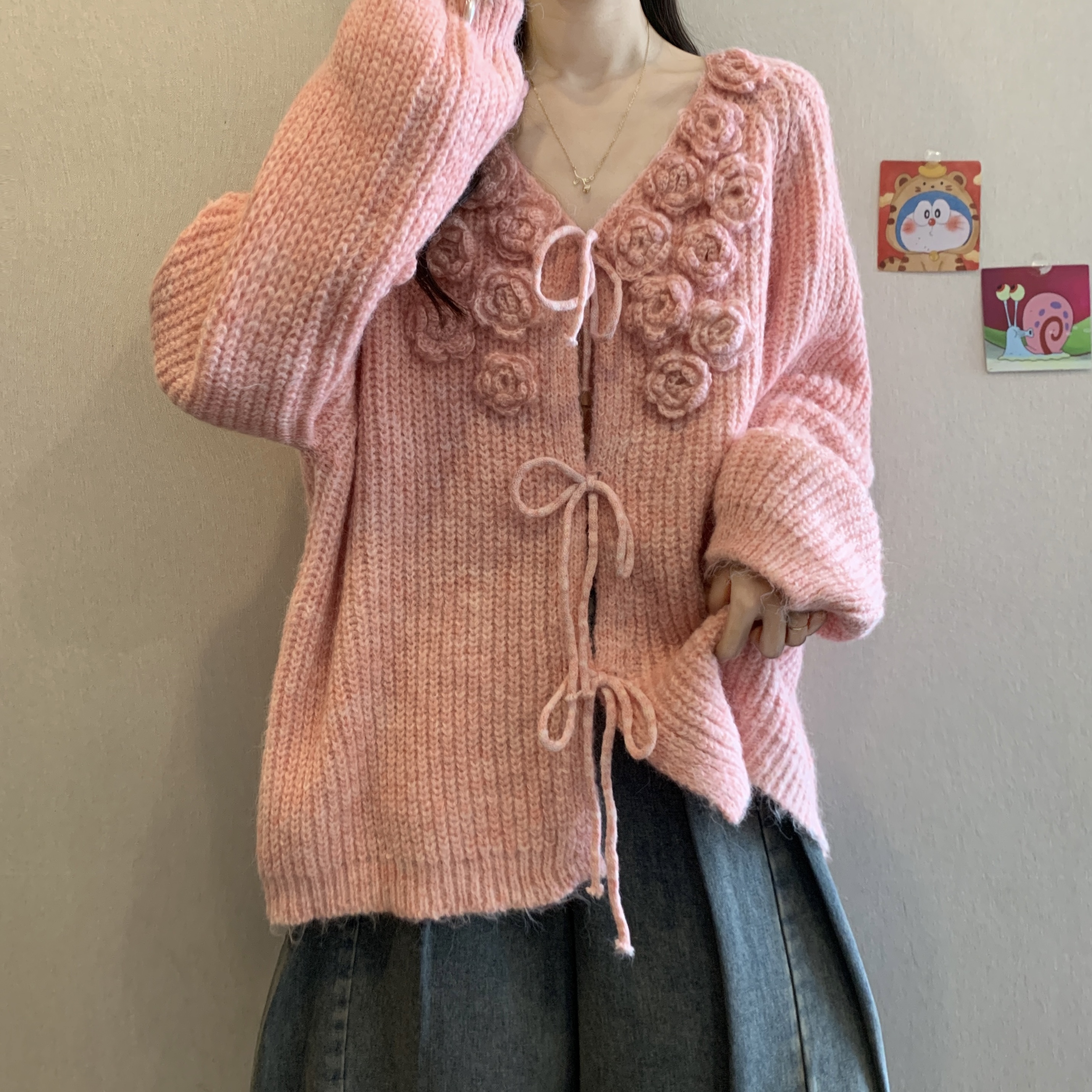 紅色立體花朵毛衣外套女2025秋冬大碼胖mm巨好看針織開衫聖誕上衣