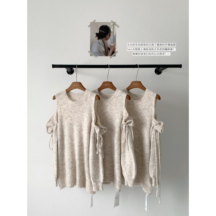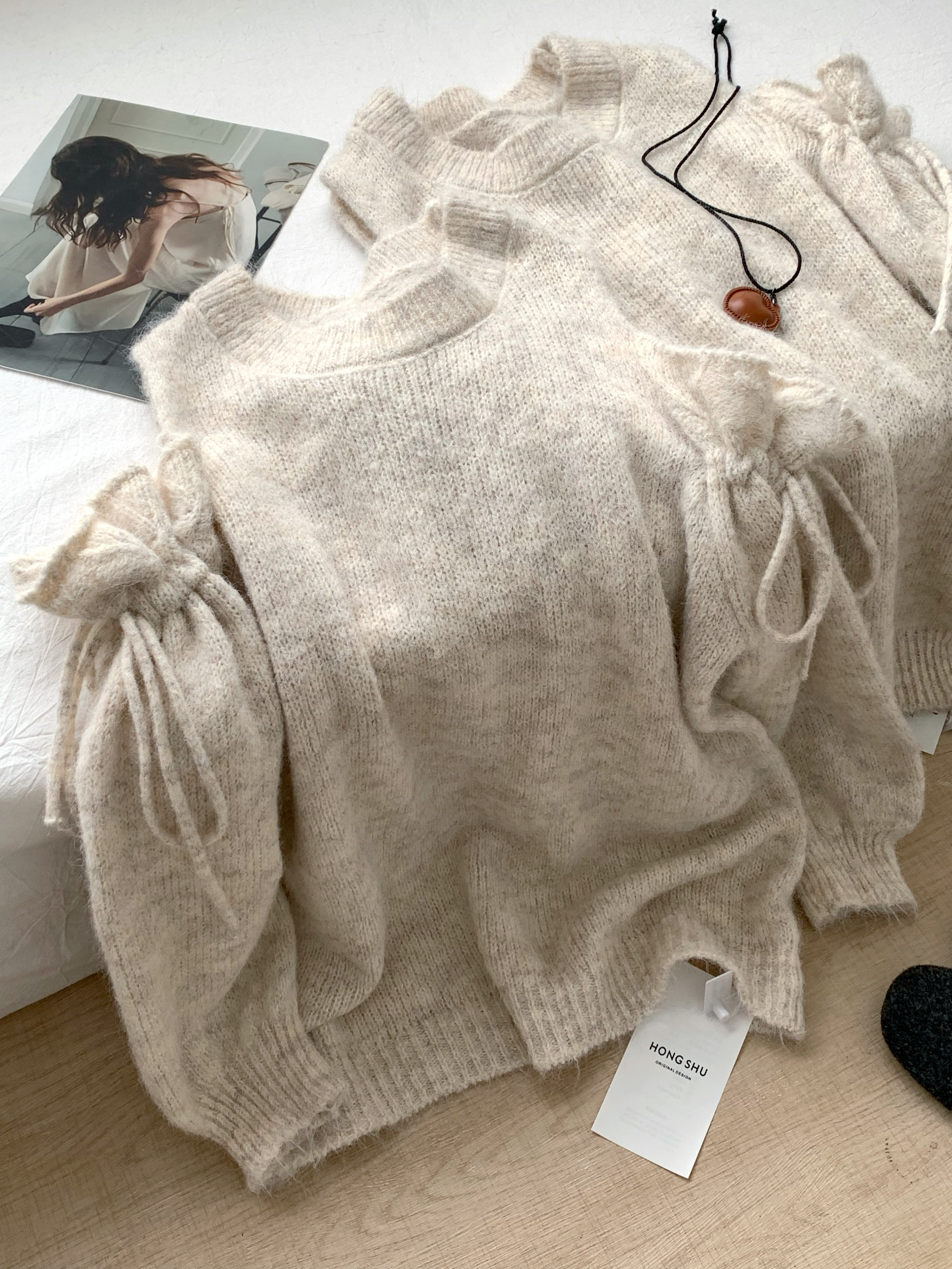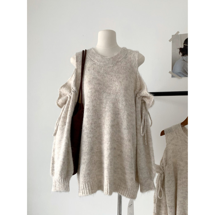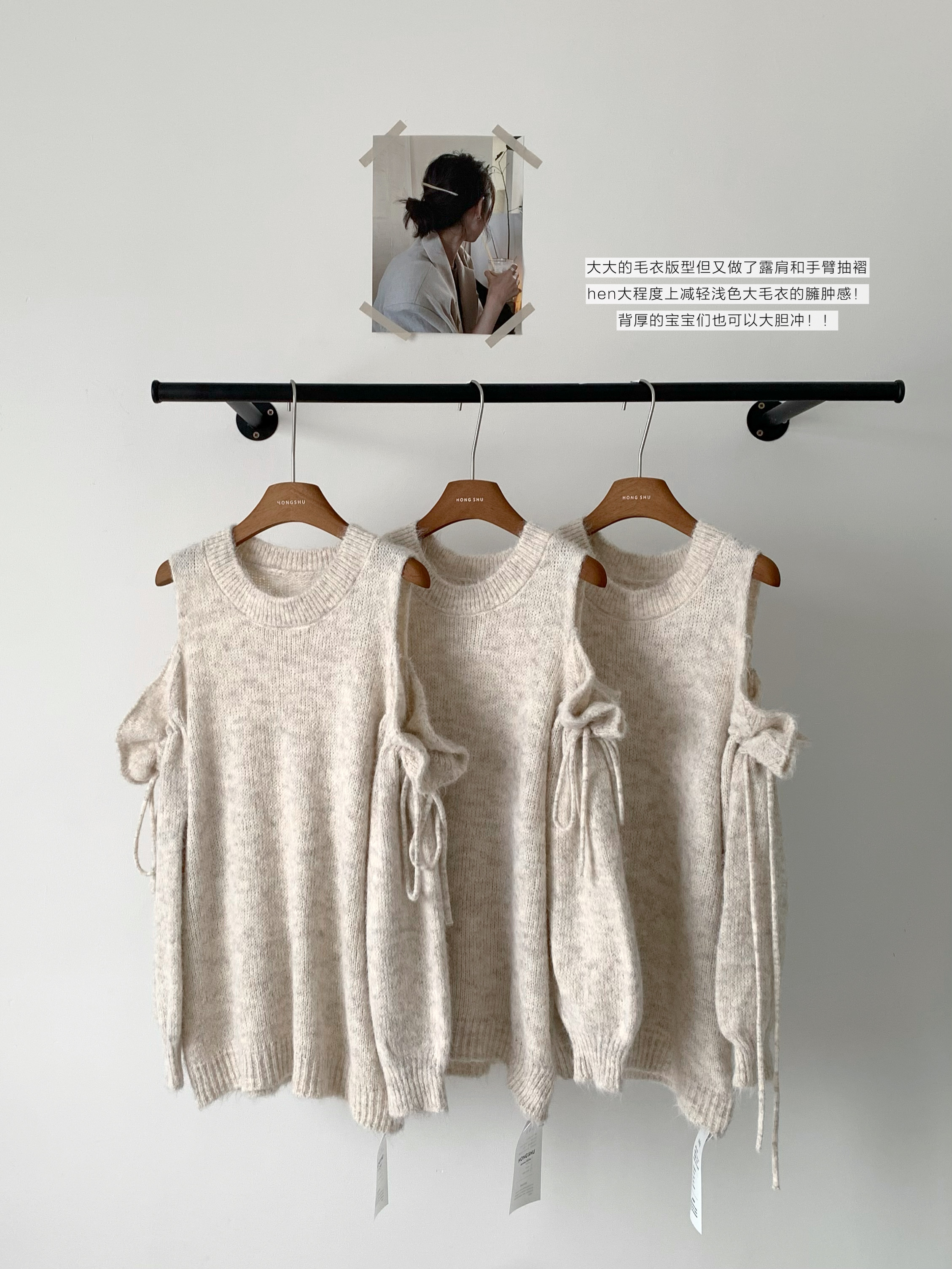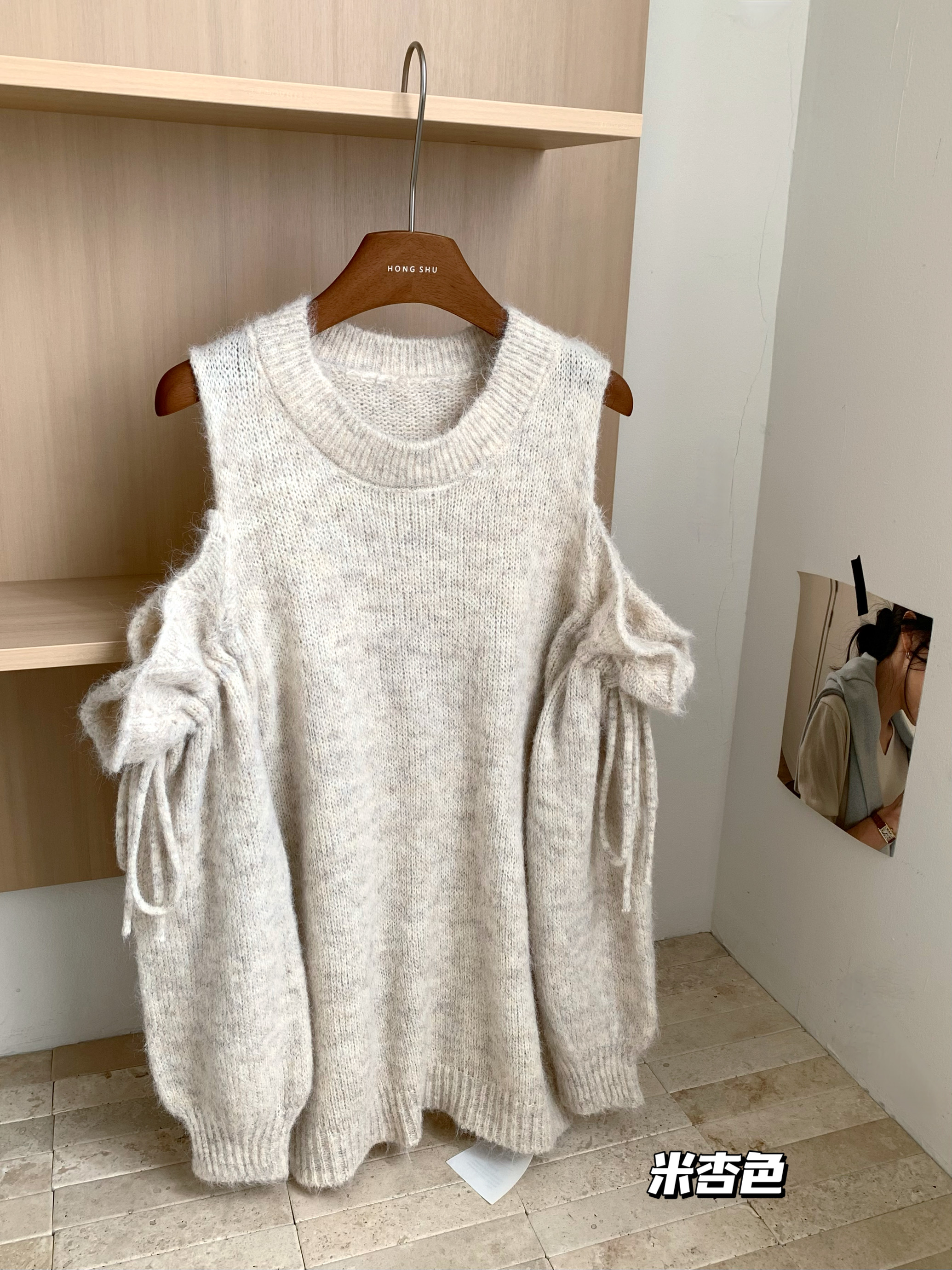 RENA乖妹速成軟糯舒適露肩抽褶系帶針織衫女秋毛衣寬松氛圍感上衣