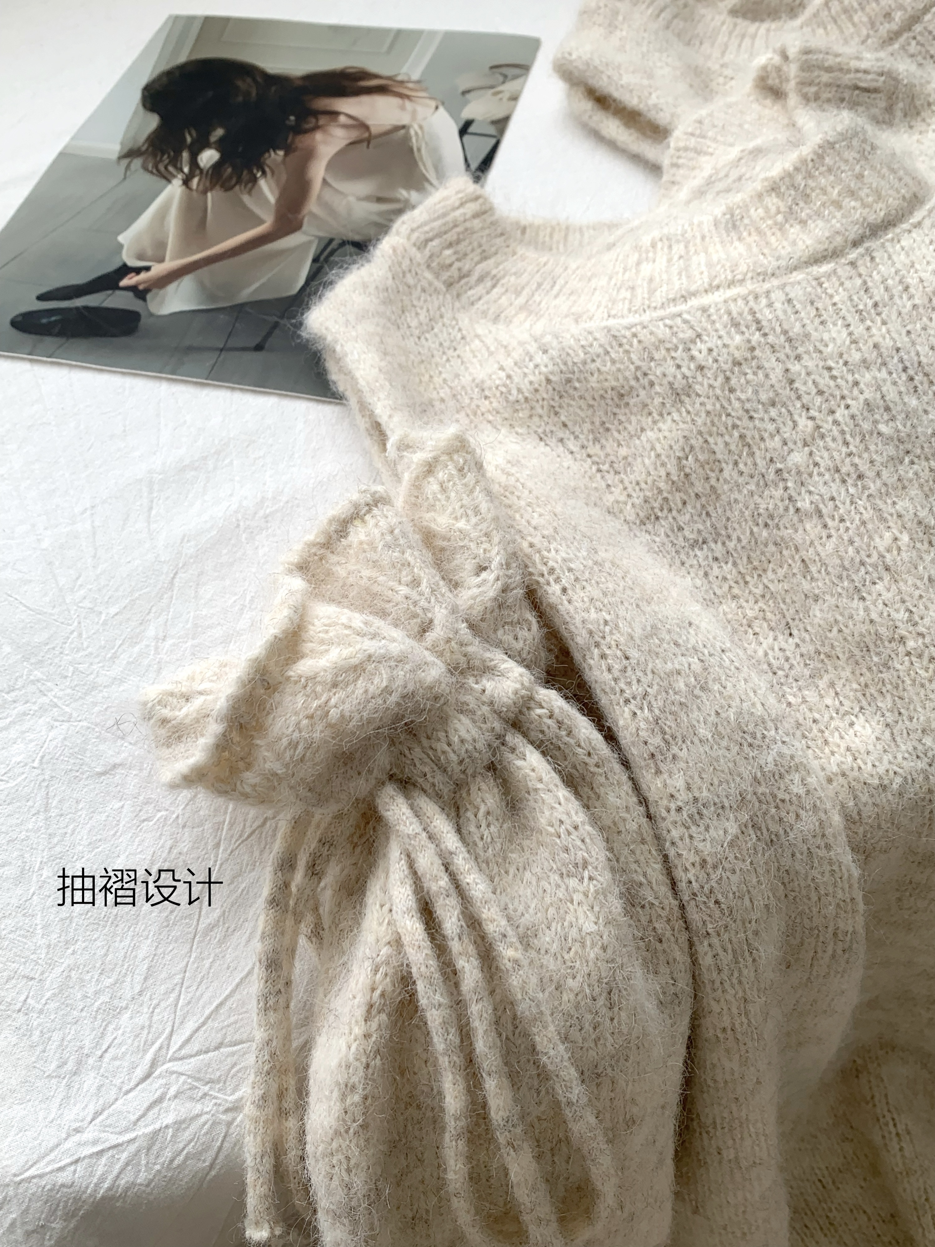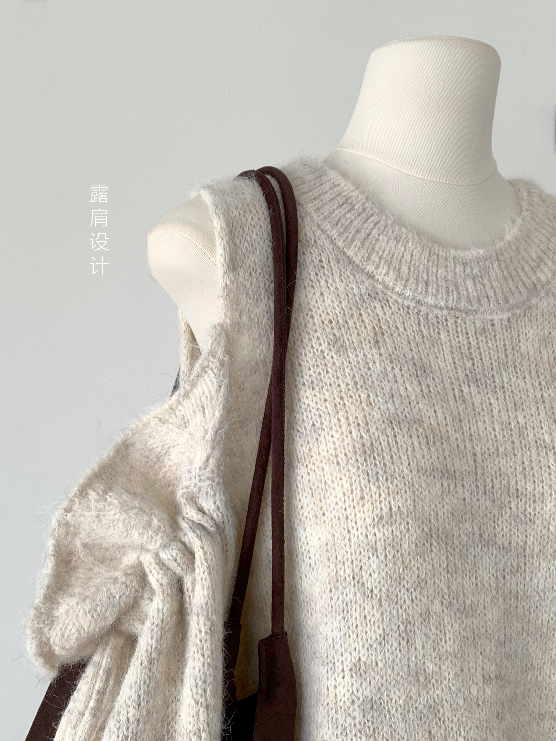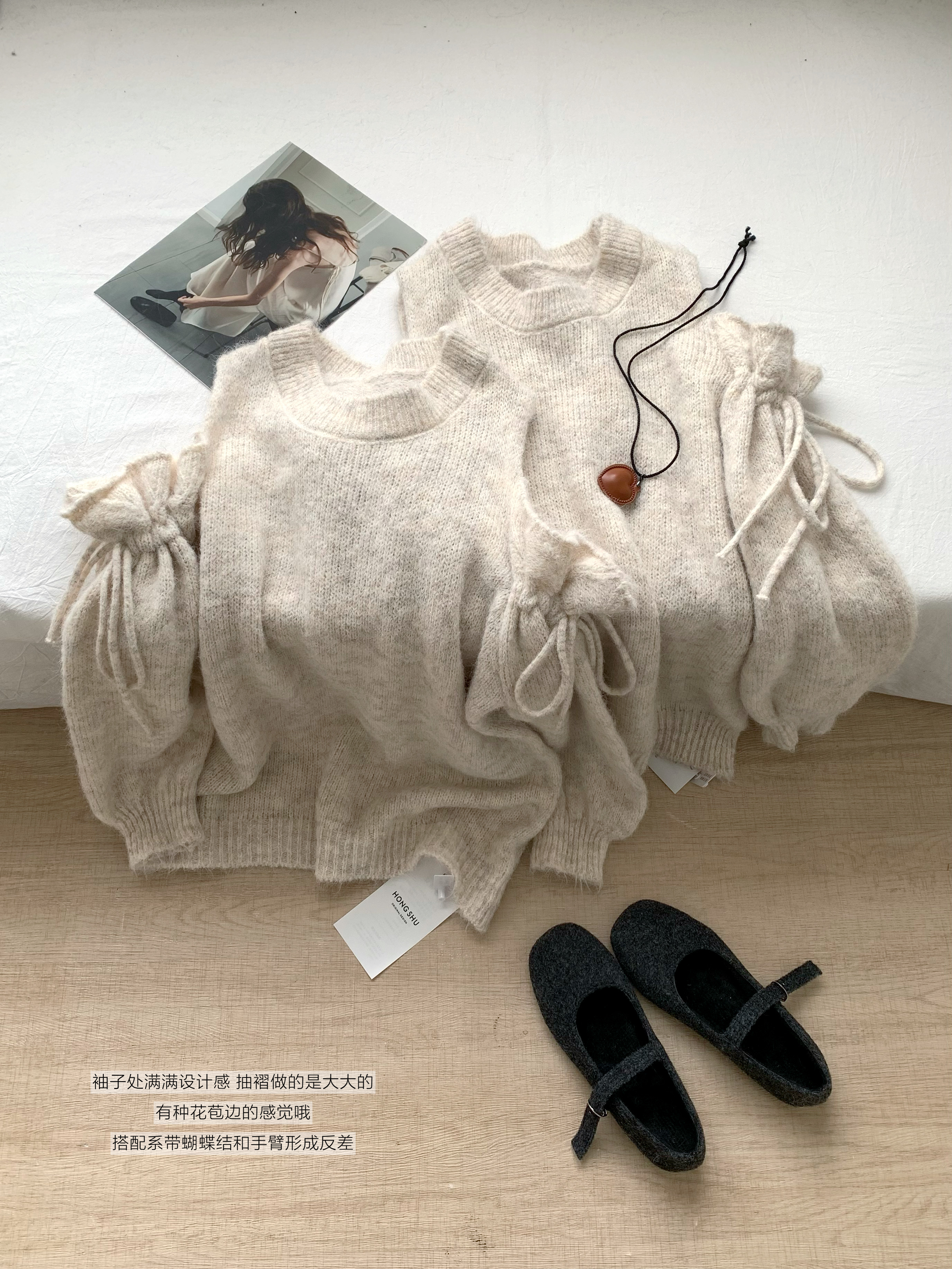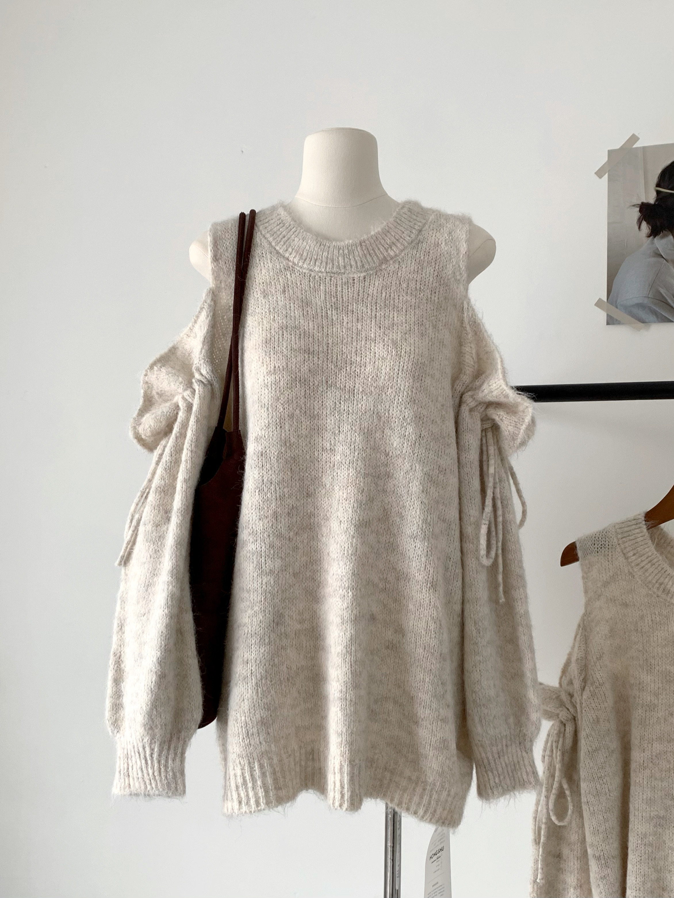 RENA乖妹速成軟糯舒適露肩抽褶系帶針織衫女秋毛衣寬松氛圍感上衣