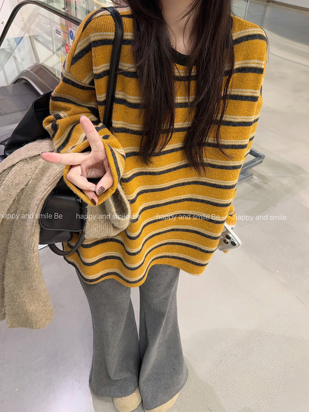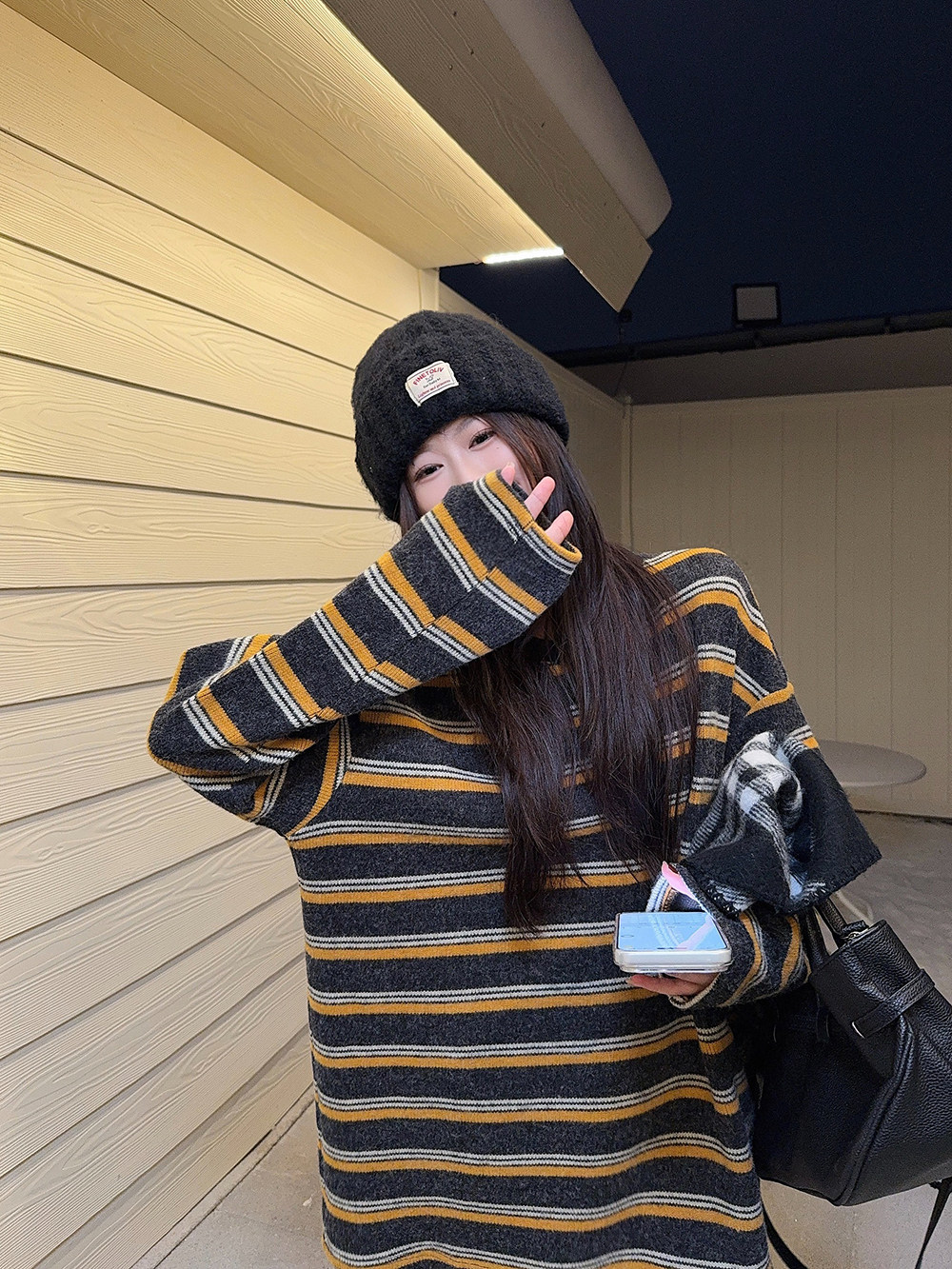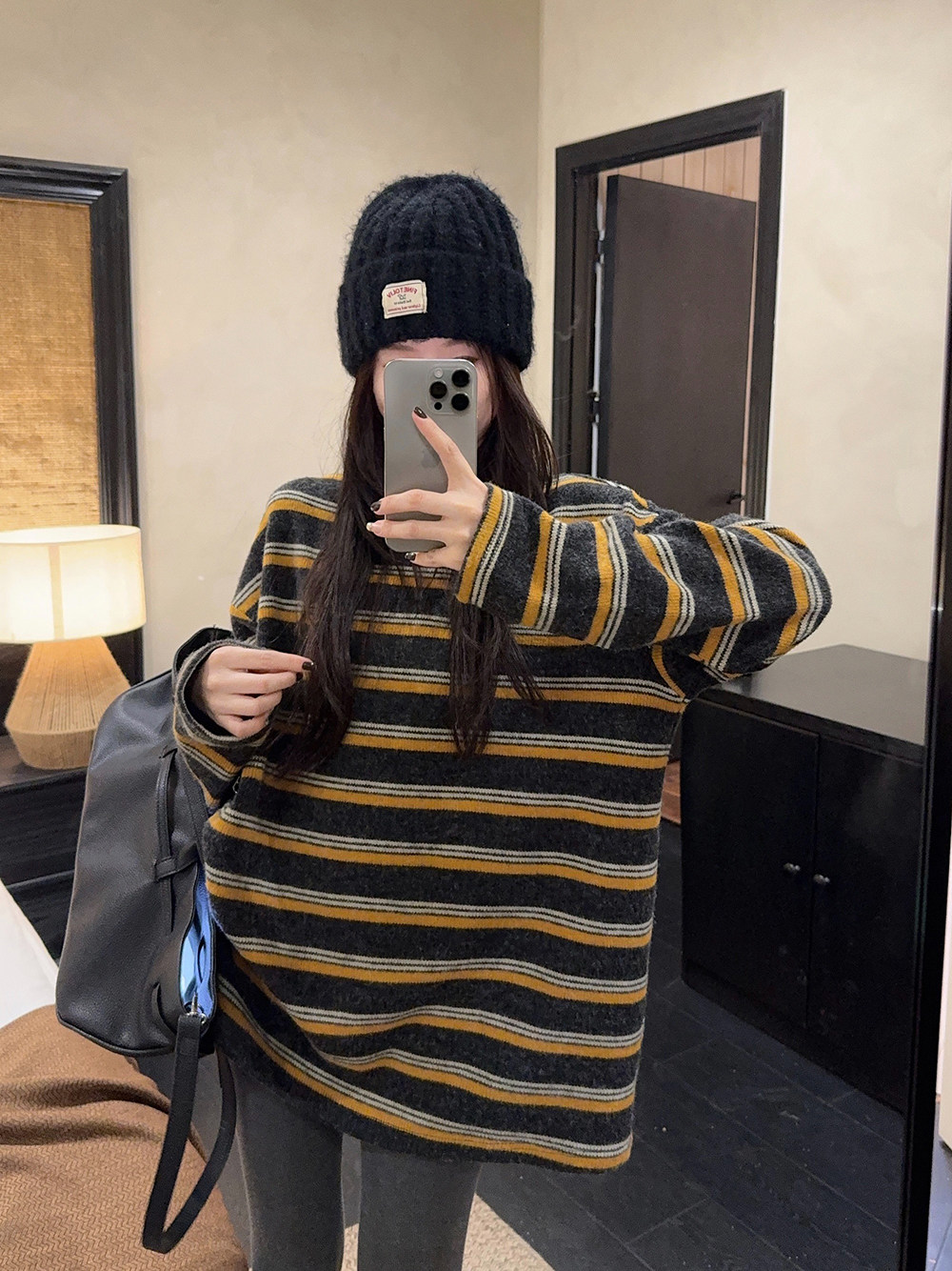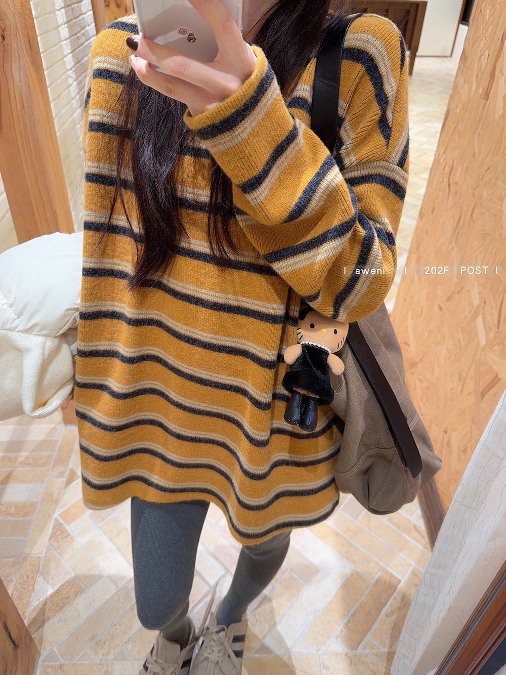 慵嬾風撞色條紋圓領長袖毛衣女裝冬季寬鬆針織衫百搭chic打底上衣