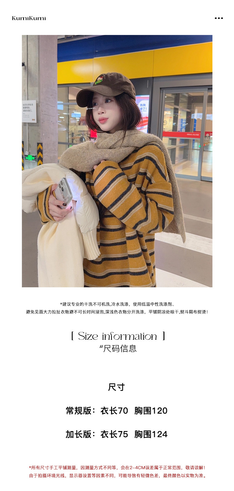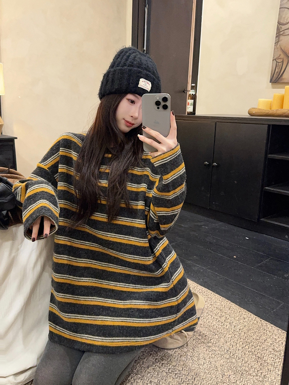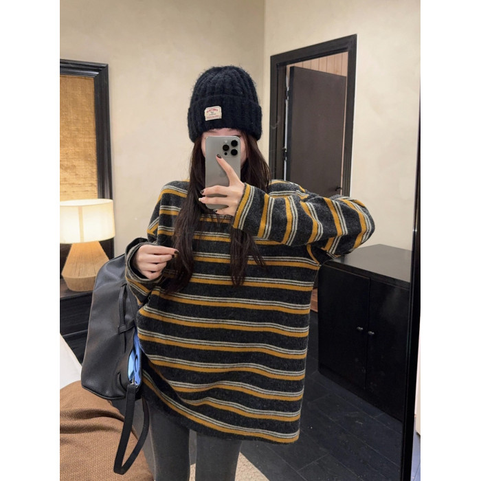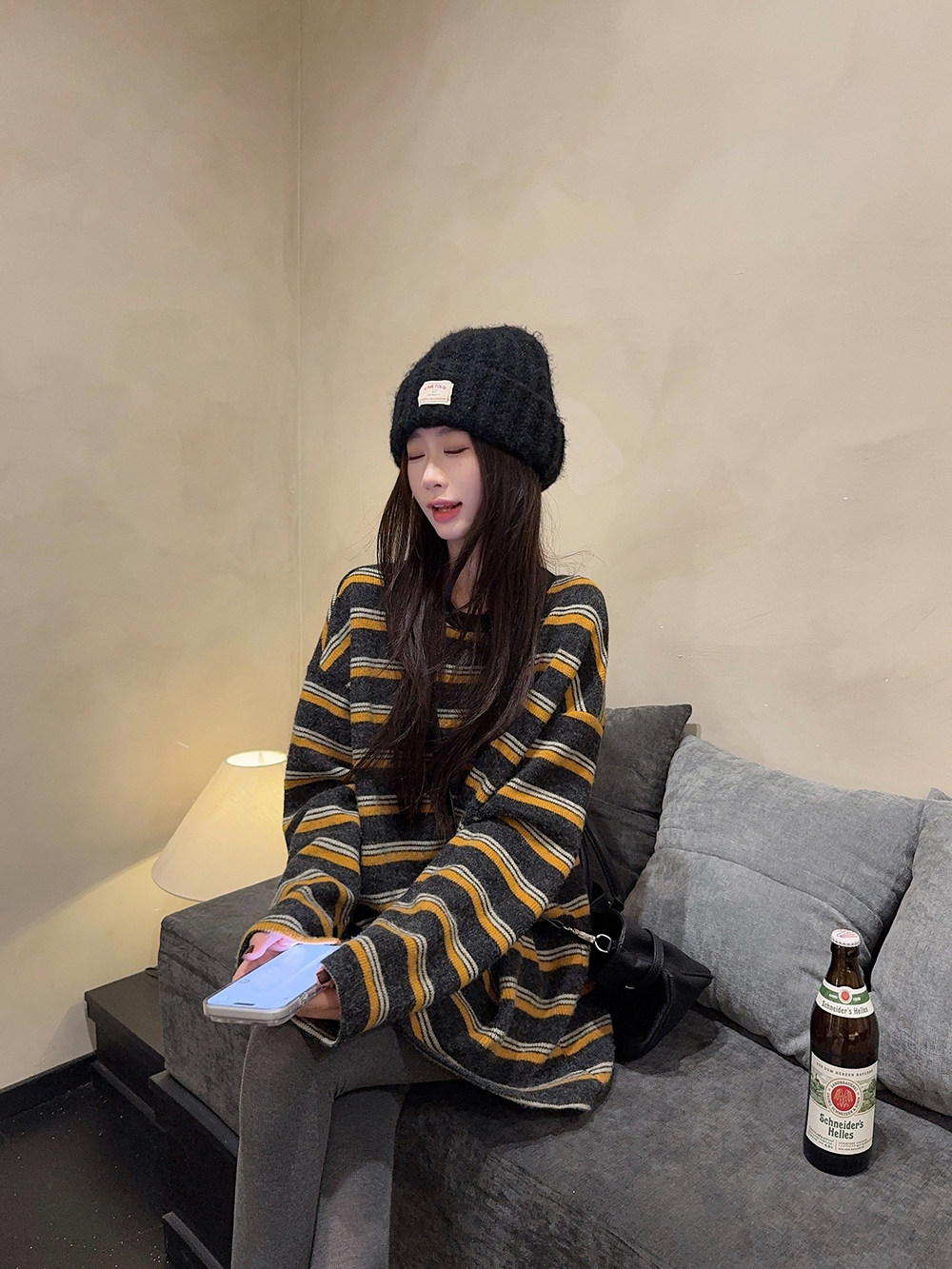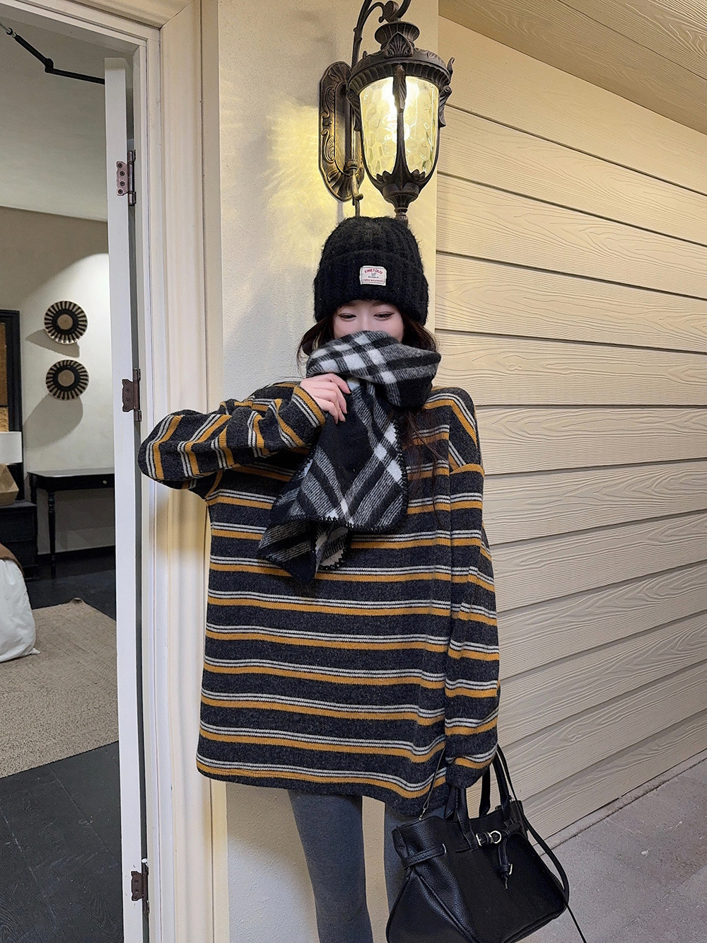 慵嬾風撞色條紋圓領長袖毛衣女裝冬季寬鬆針織衫百搭chic打底上衣