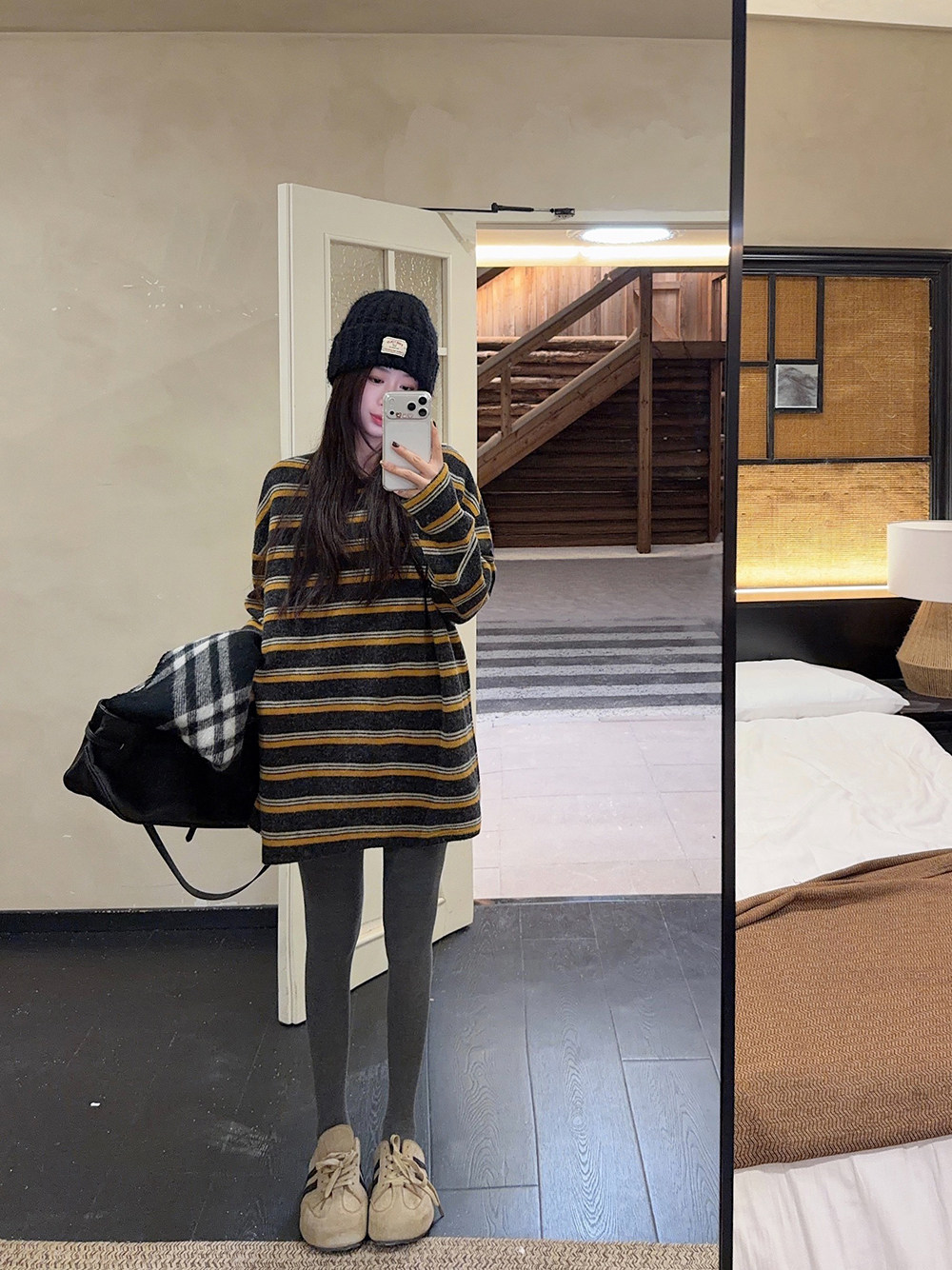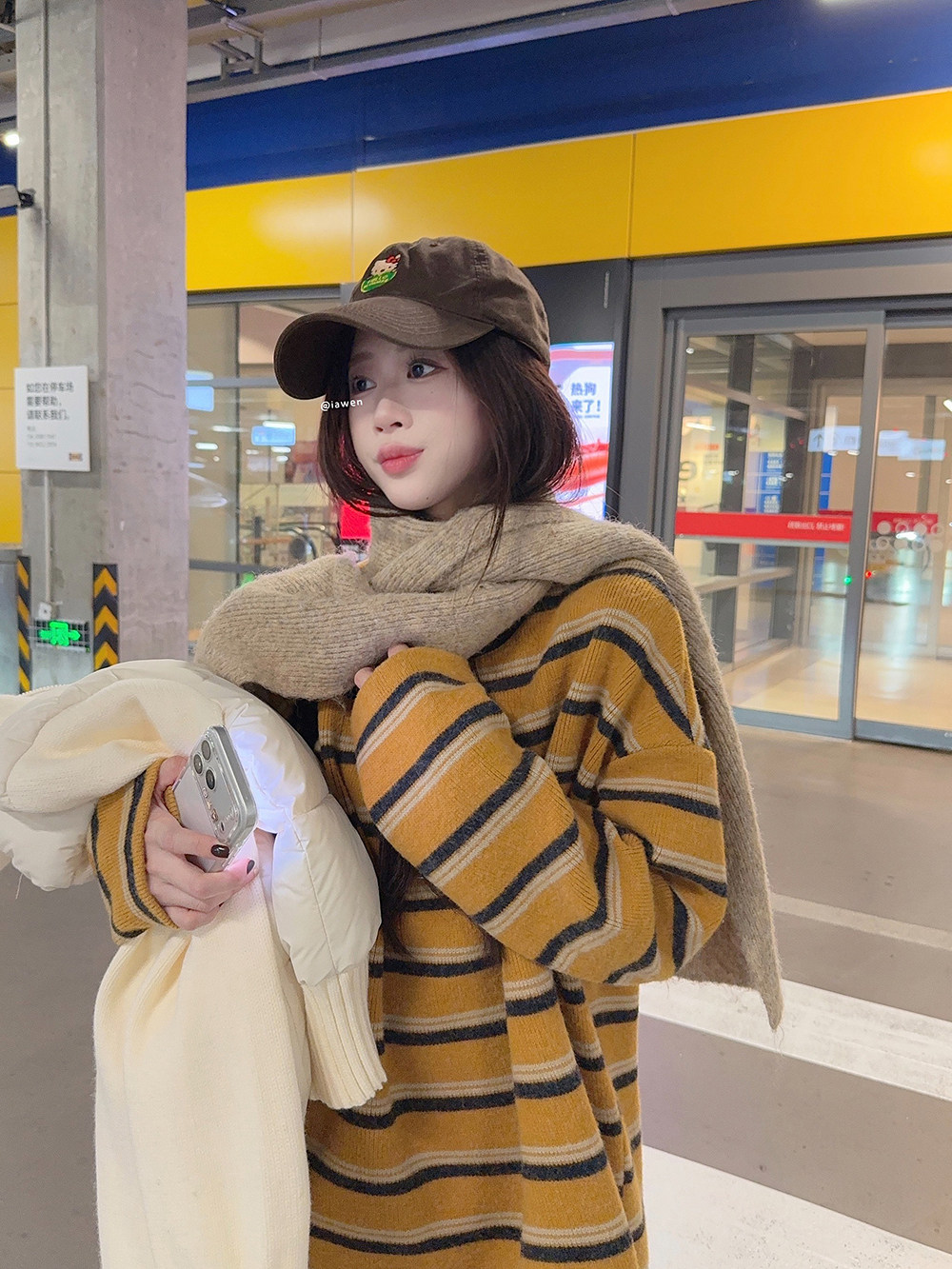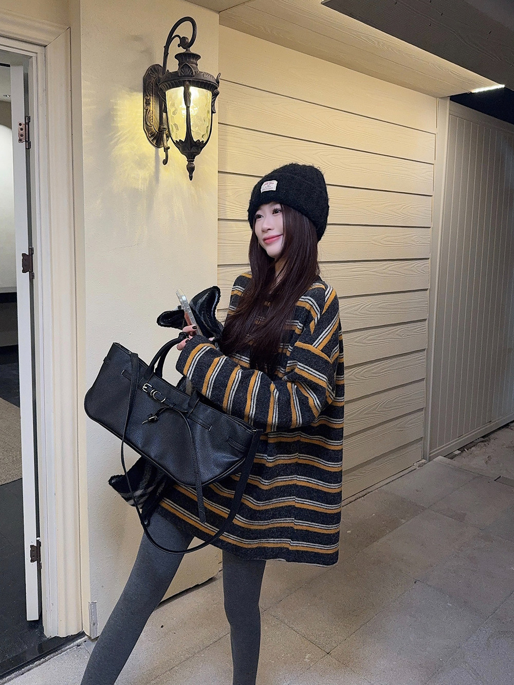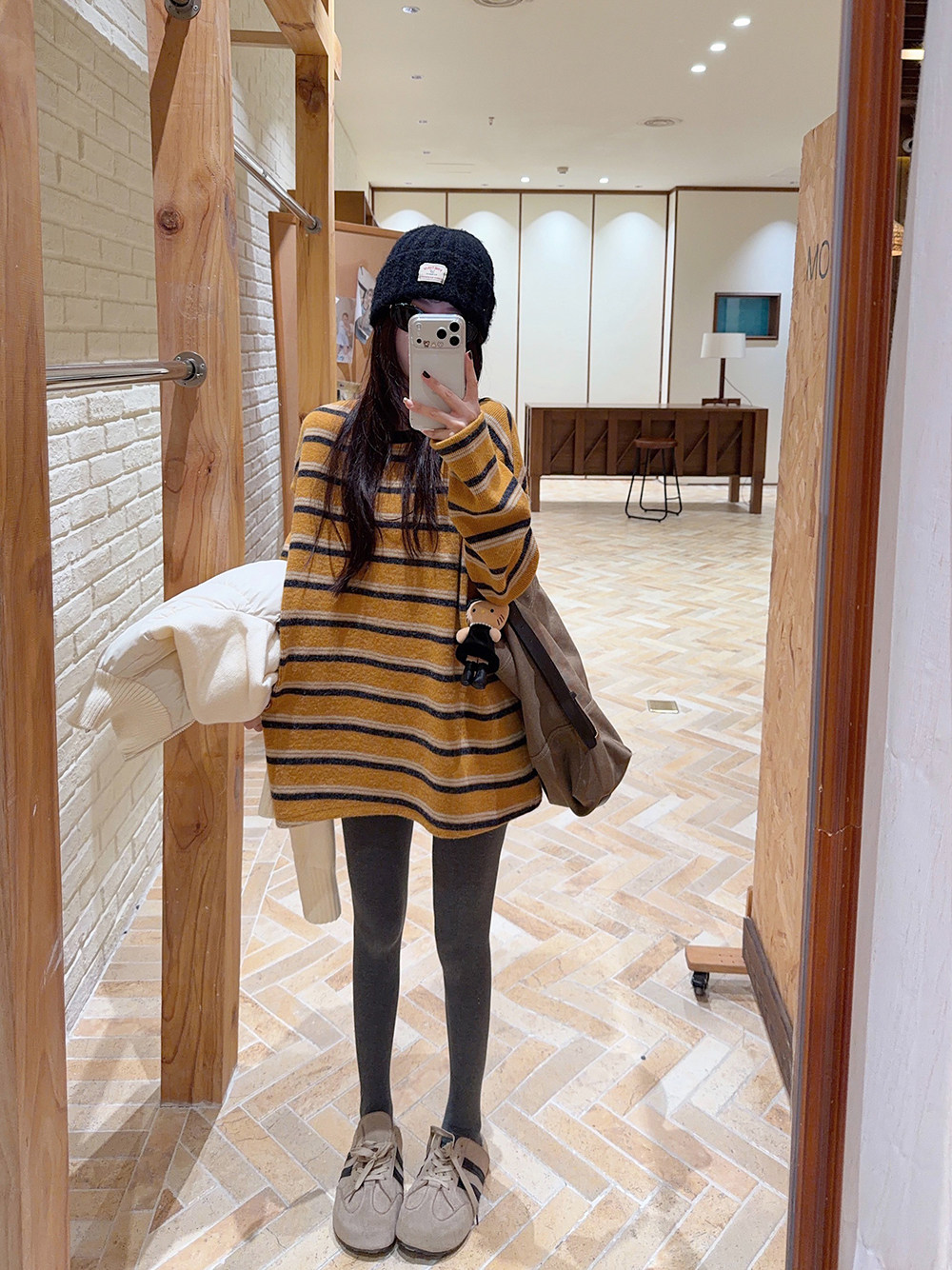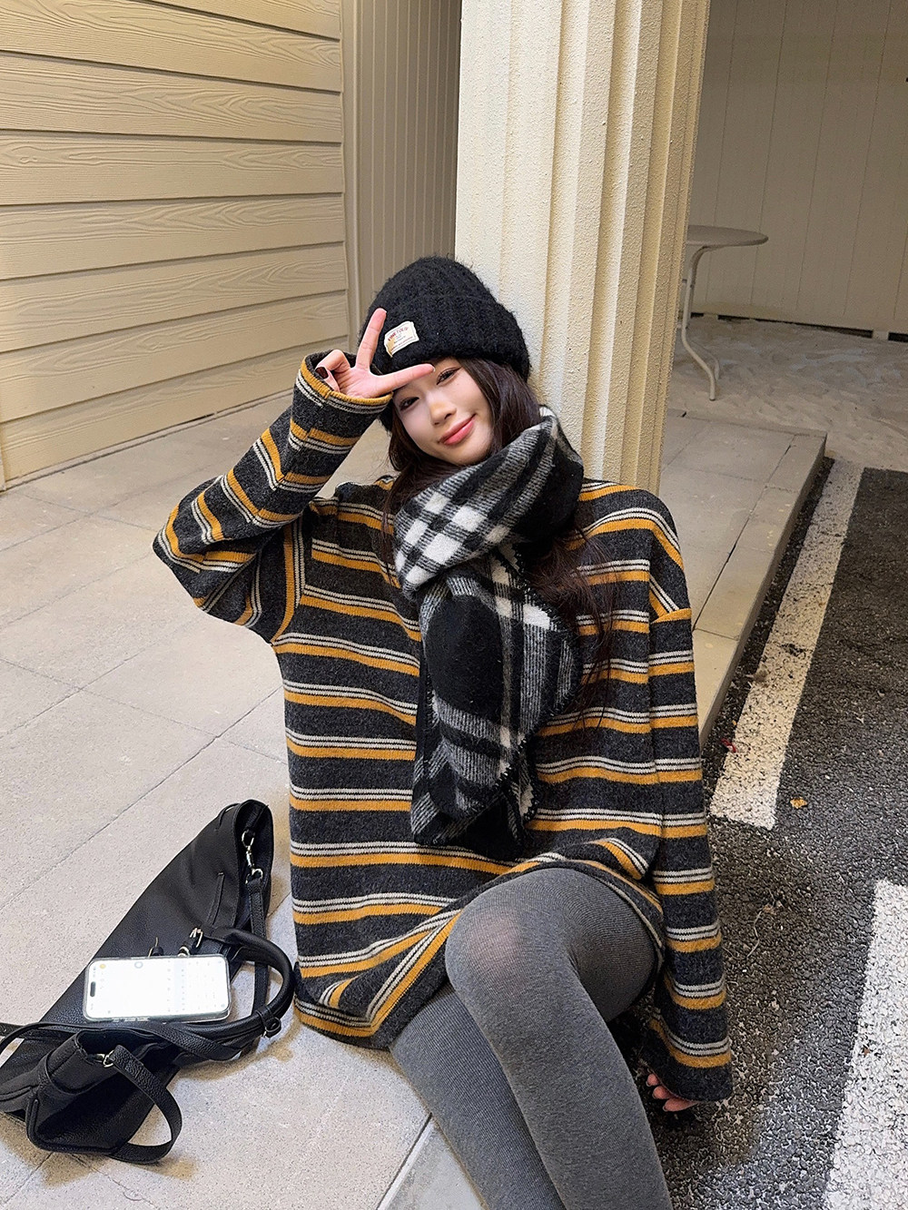 慵嬾風撞色條紋圓領長袖毛衣女裝冬季寬鬆針織衫百搭chic打底上衣