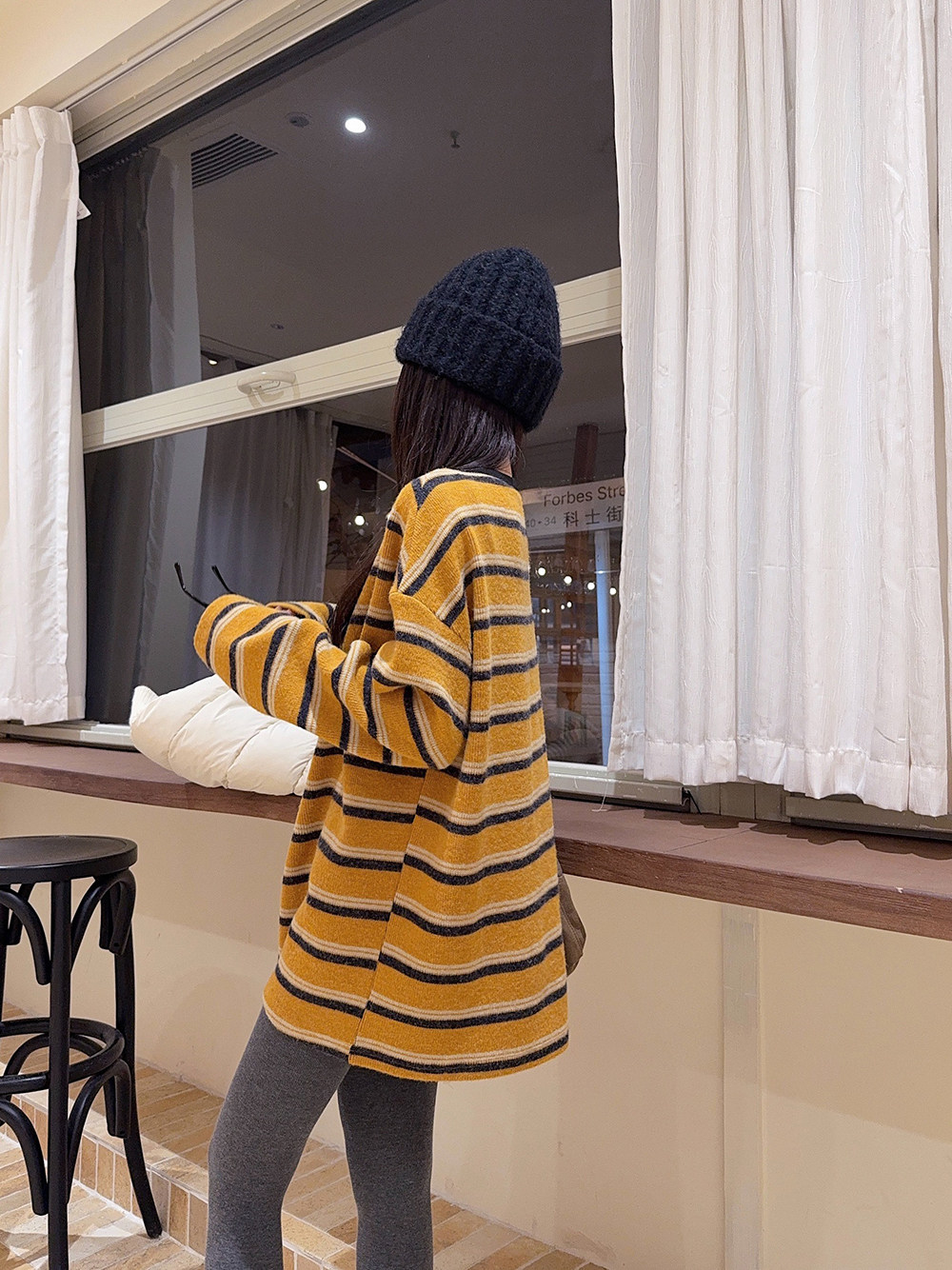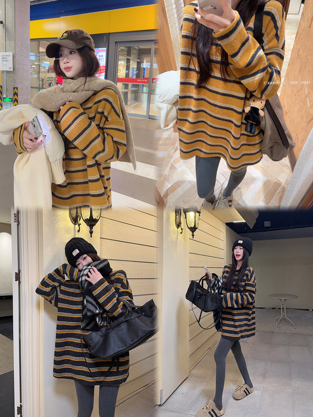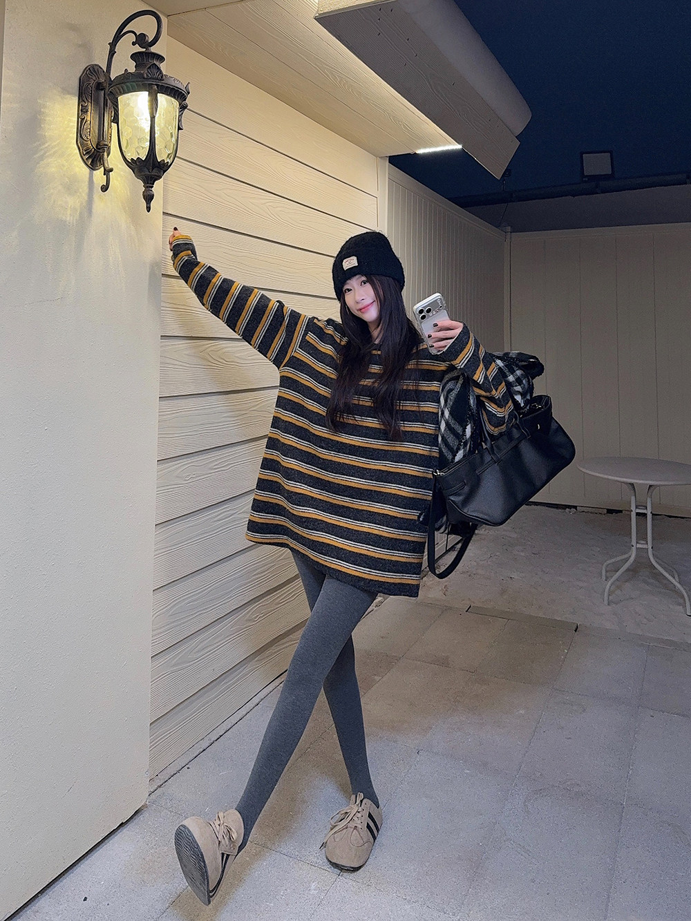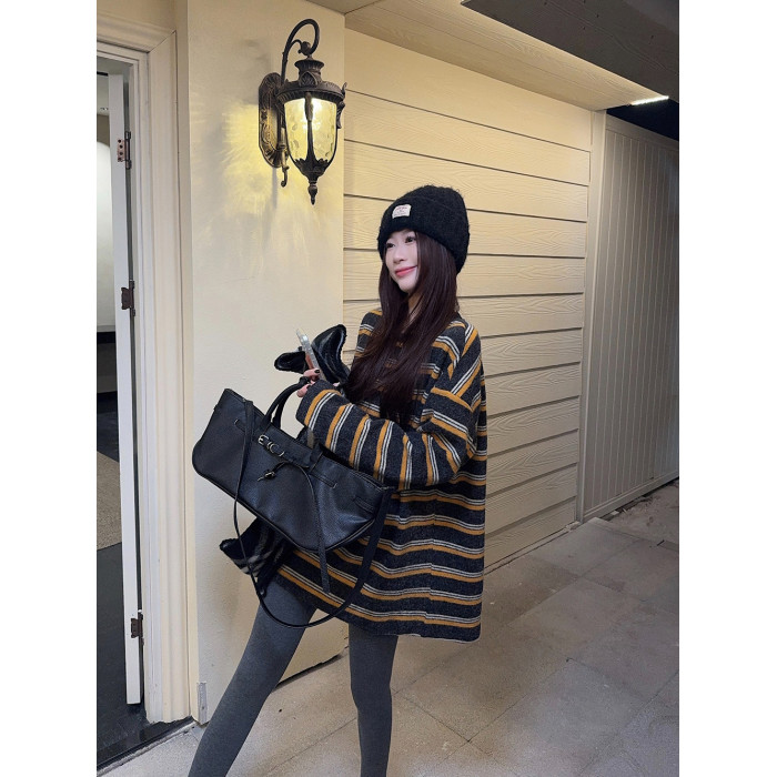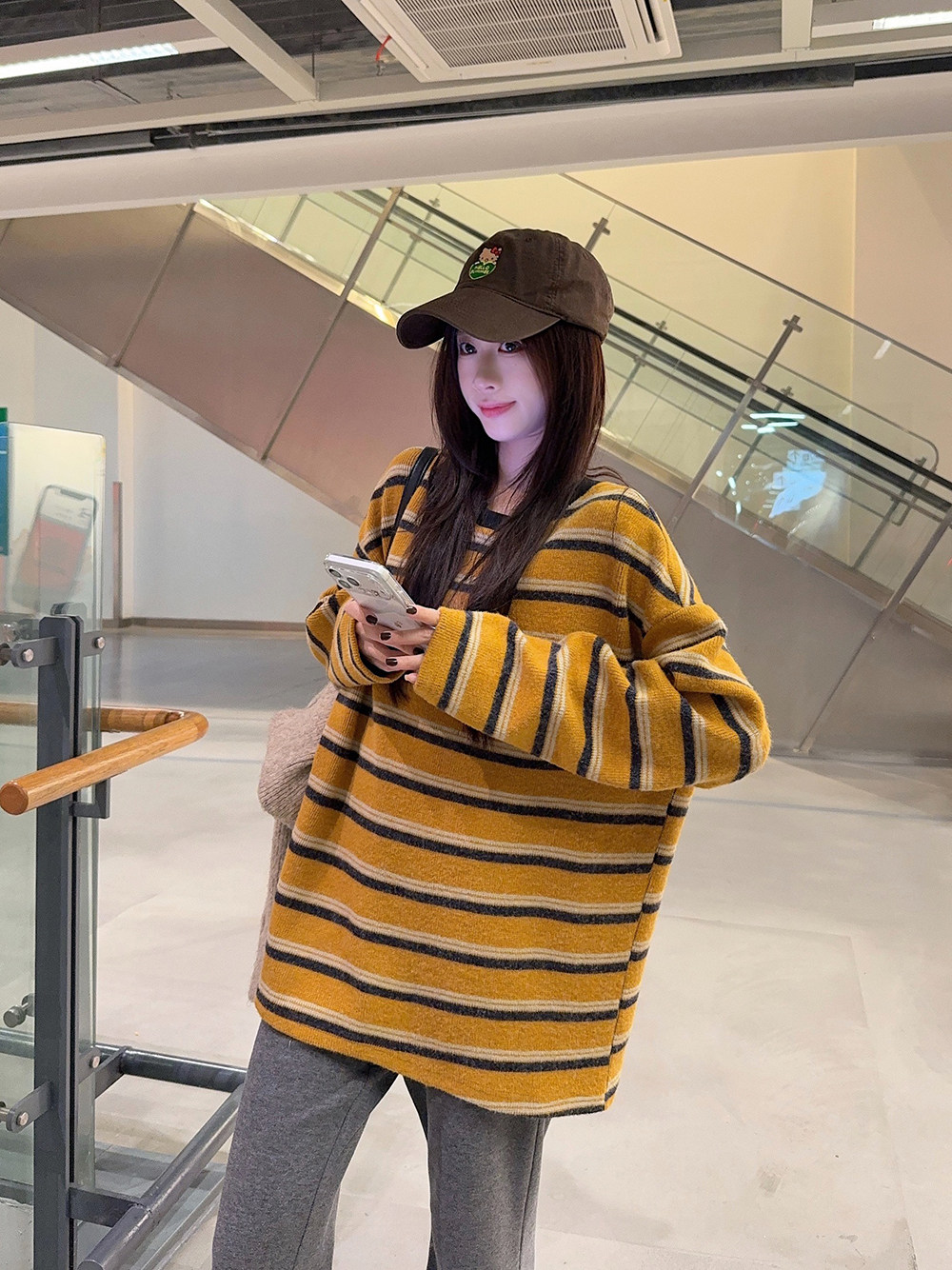 慵嬾風撞色條紋圓領長袖毛衣女裝冬季寬鬆針織衫百搭chic打底上衣